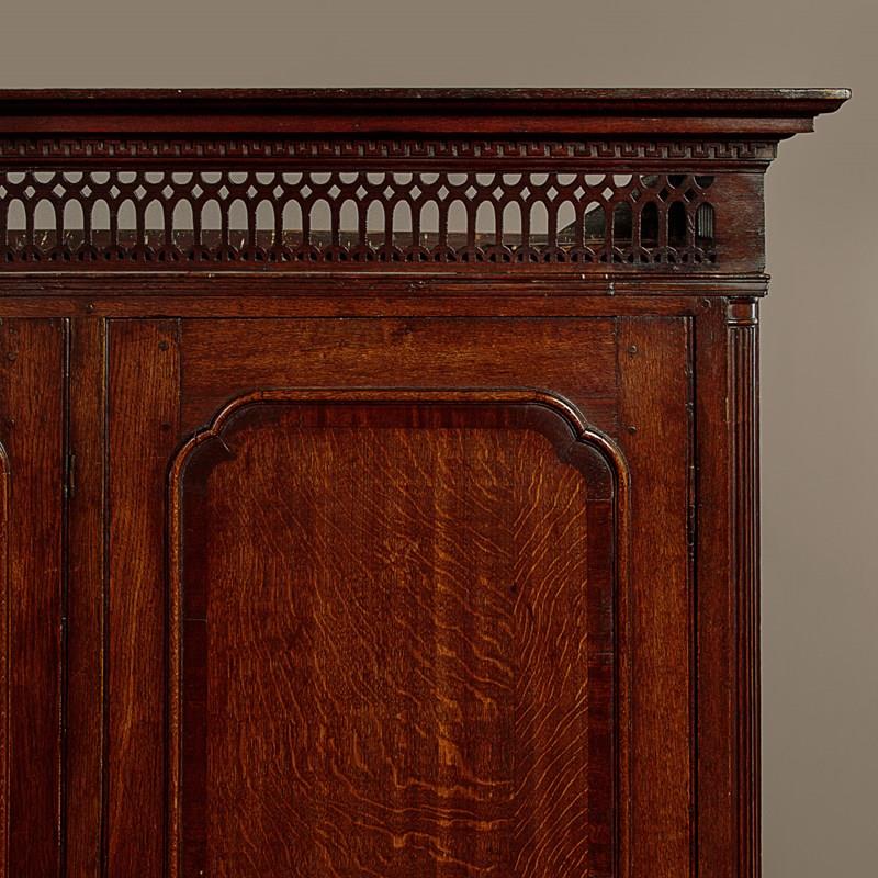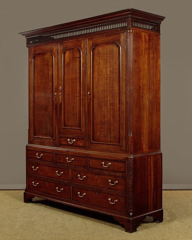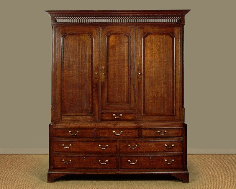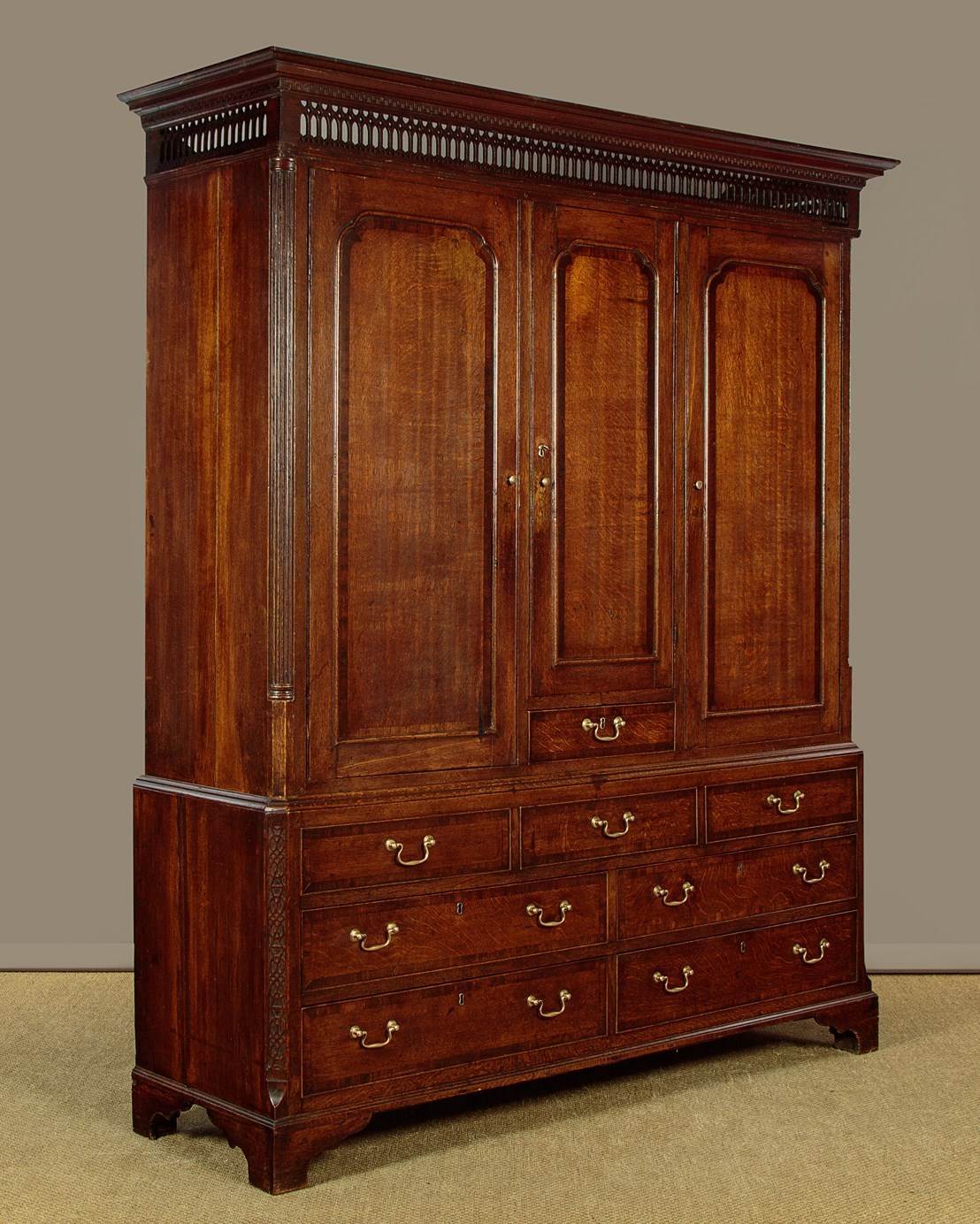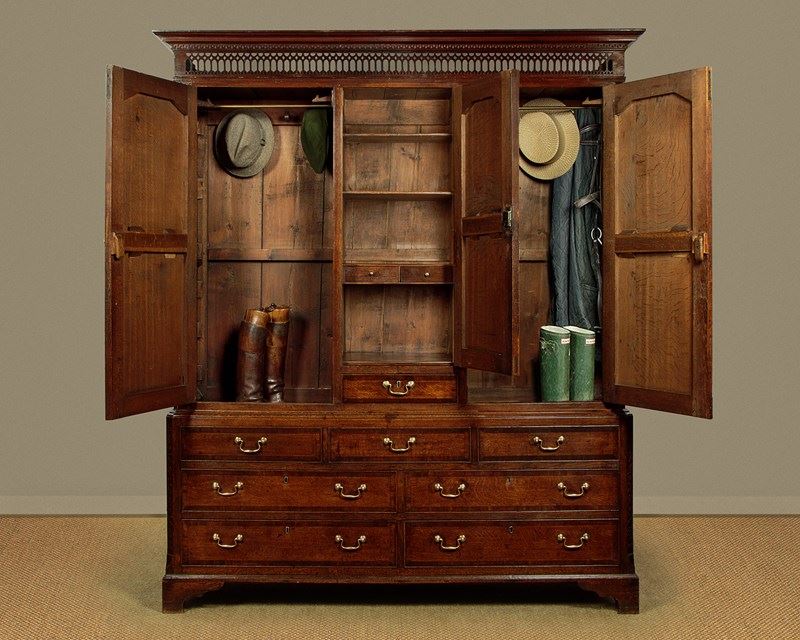 Large late Georgian oak tack or cloak cupboard, Cheshire c.1810. In two pieces, the three door cupboard top (internal depth 18") fitted with hooks and later brass hanging rails to the left and right hand sides, whilst the centre has shelves plus two small drawers. The side doors are held closed with turn catches accessed via the loackable middle door. Low waisted base with four large drawer (the top row of drawers being dummy fronts to allow for greater hanging height in the top). Very unusual cornice with a with pierced fretwork frieze to the front and sides. Mahogany crossbanded door panels within raised mouldings and reeded quarter columns flanking the top, both typical of Cheshire furniture from the period. Mahogany crossbanded drawer fronts with good quality Georgian style brass swanneck handles. Canted corners to the base with blind fretwork carved detail. Ogee mouldings to the waist and around the base, shaped bracket feet to the front and sides. Excellent colour and condition, cleaned and waxed in our workshops. Key supplied.