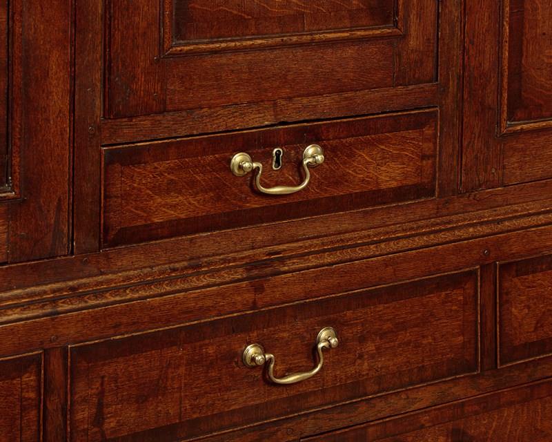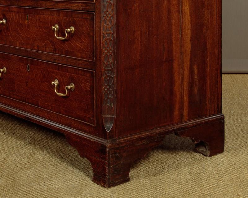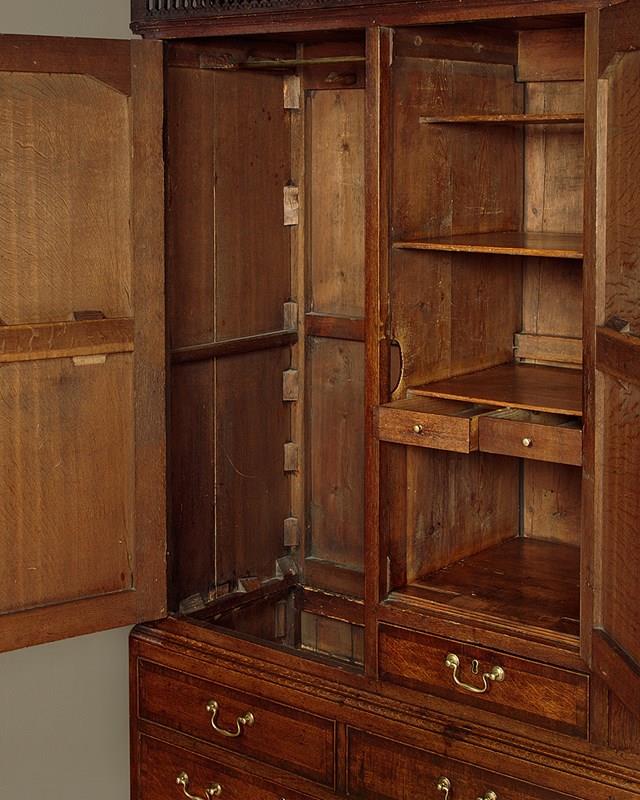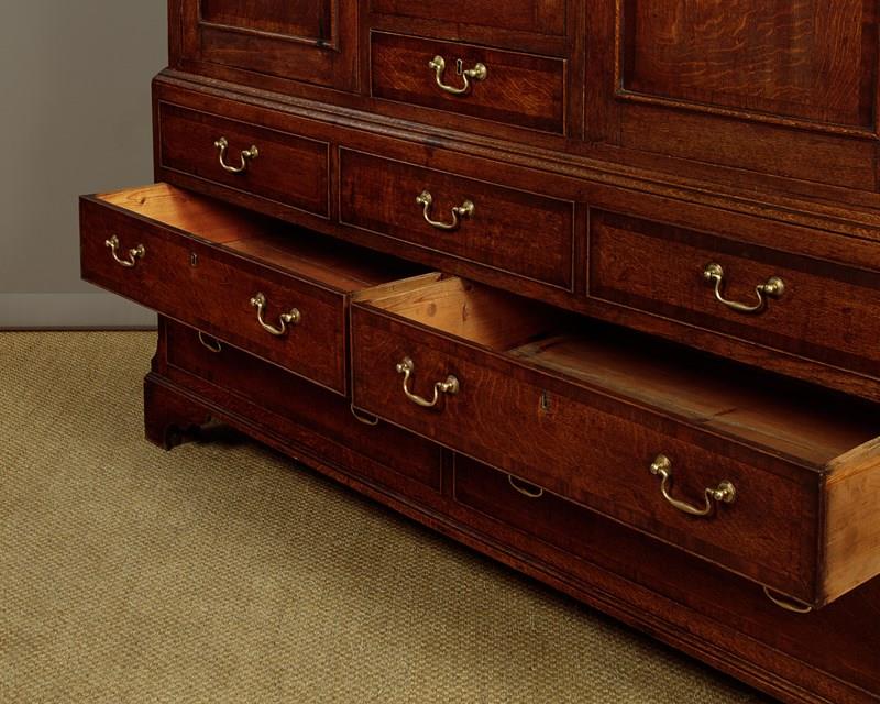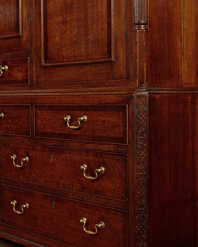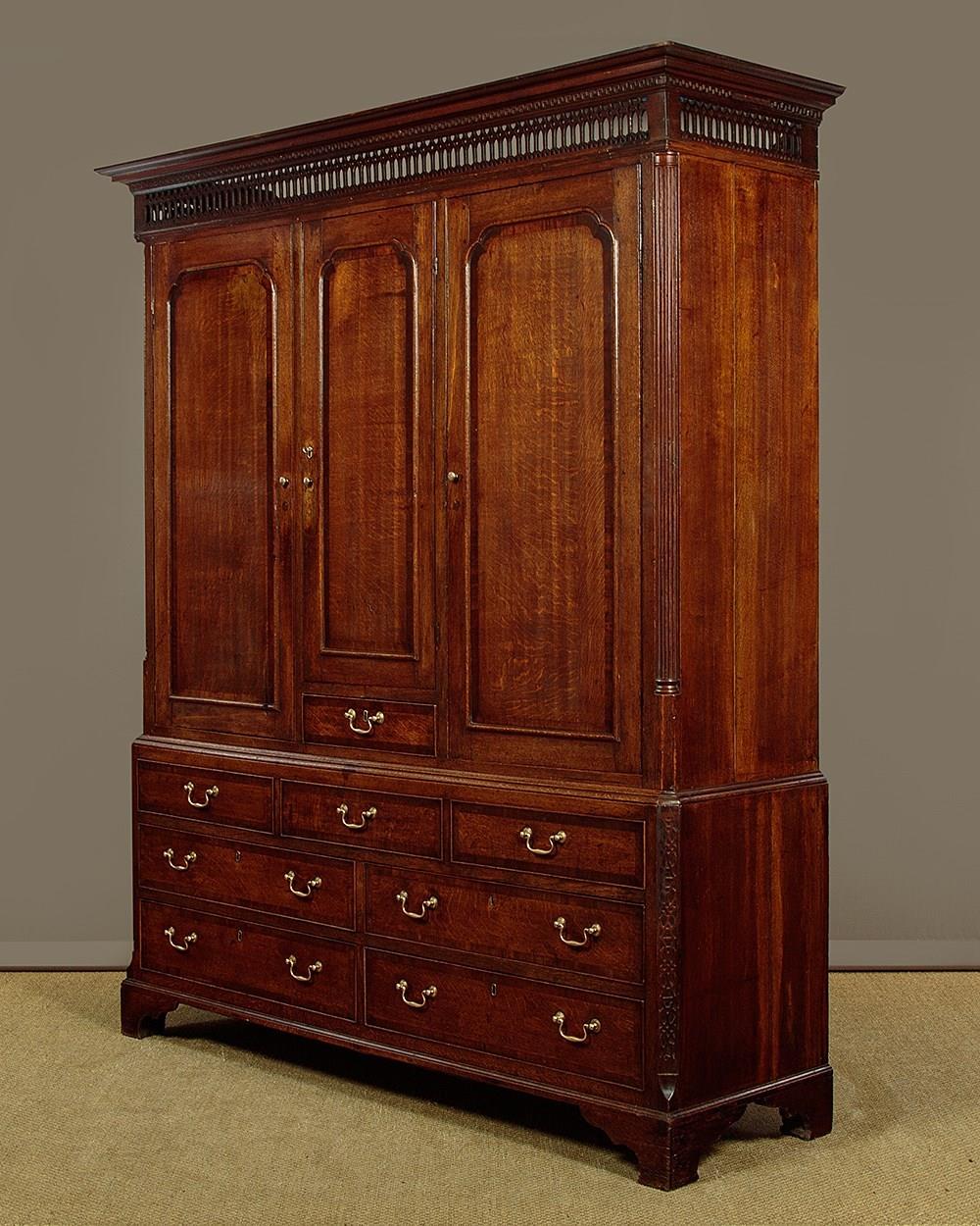 Large late Georgian oak tack or cloak cupboard, Cheshire c.1810. In two pieces, the three door cupboard top (internal depth 18") fitted with hooks and later brass hanging rails to the left and right hand sides, whilst the centre has shelves plus two small drawers. The side doors are held closed with turn catches accessed via the loackable middle door. Low waisted base with four large drawer (the top row of drawers being dummy fronts to allow for greater hanging height in the top). Very unusual cornice with a with pierced fretwork frieze to the front and sides. Mahogany crossbanded door panels within raised mouldings and reeded quarter columns flanking the top, both typical of Cheshire furniture from the period. Mahogany crossbanded drawer fronts with good quality Georgian style brass swanneck handles. Canted corners to the base with blind fretwork carved detail. Ogee mouldings to the waist and around the base, shaped bracket feet to the front and sides. Excellent colour and condition, cleaned and waxed in our workshops. Key supplied.