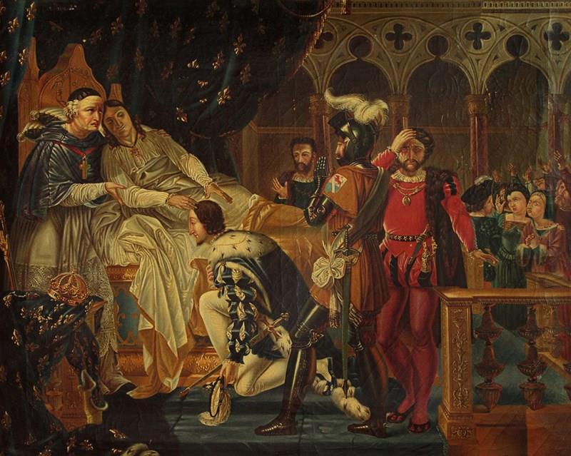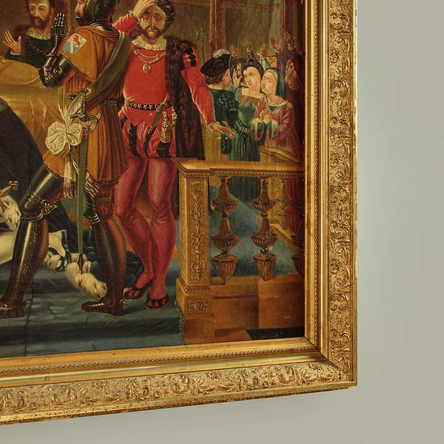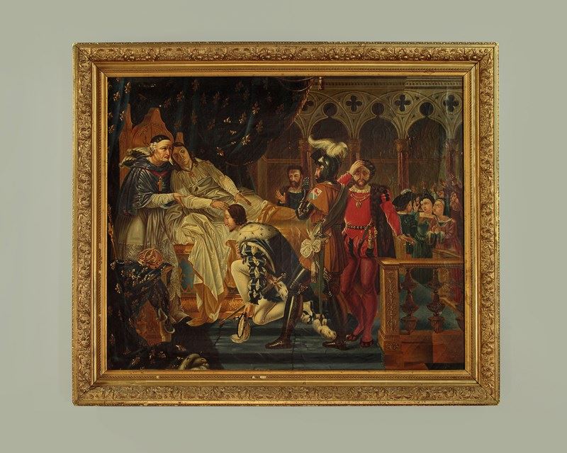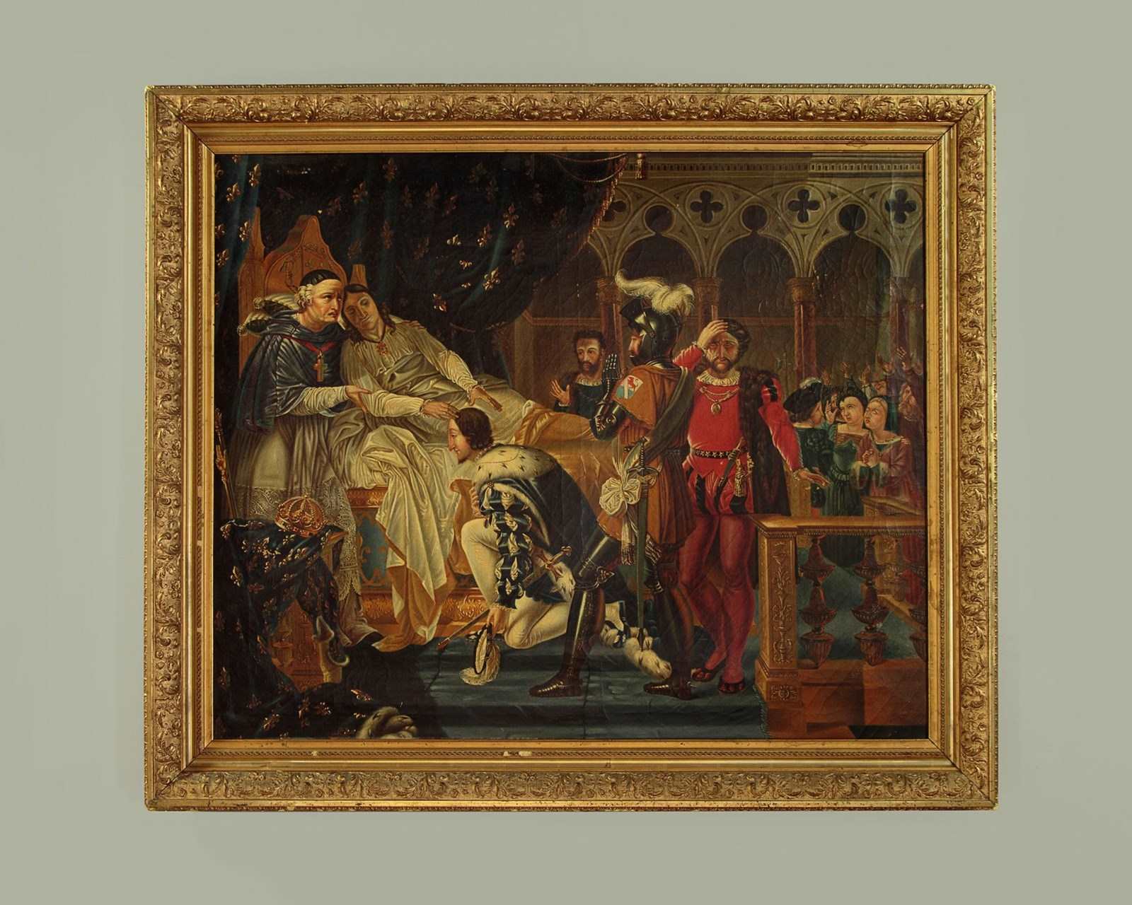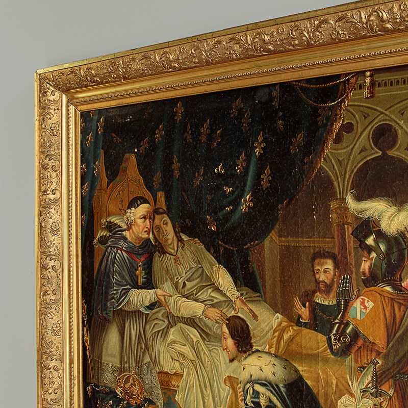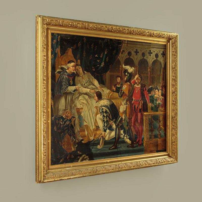 Large oil painting of the death of King Louis XII of France after the original by the acclaimed French history painter Merry-Joseph Blondel (1781-1853) c.1900. The King lies dying in a bed surrounded with drapes carrying the Fleur de Lis emblem of French royalty, with his crown and the Main de Justice sceptre by his side. With the help of a priest he bestows his blessing on a young prince, presumably his successor Francis I, whilst other grieving knights and noblemen stand at the foot of the bed. In the background, below Gothic arches, stand a group of grieving women and the common people, their hands raised in prayer for a popular king known as 'The Father of the People'. Well painted in oil on canvas. With some areas of damage but all away from the faces. Presented in the original giltwood and gesso frame which is in good condition.