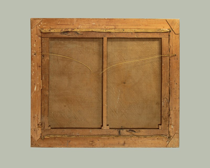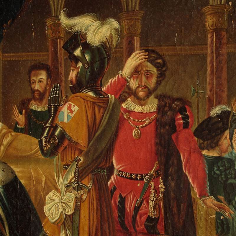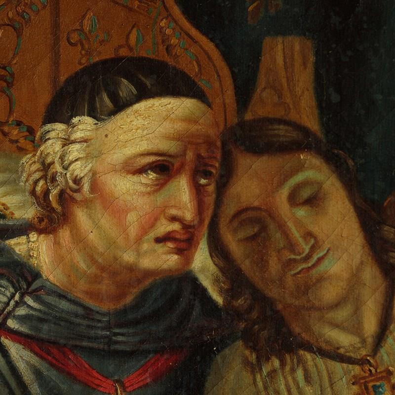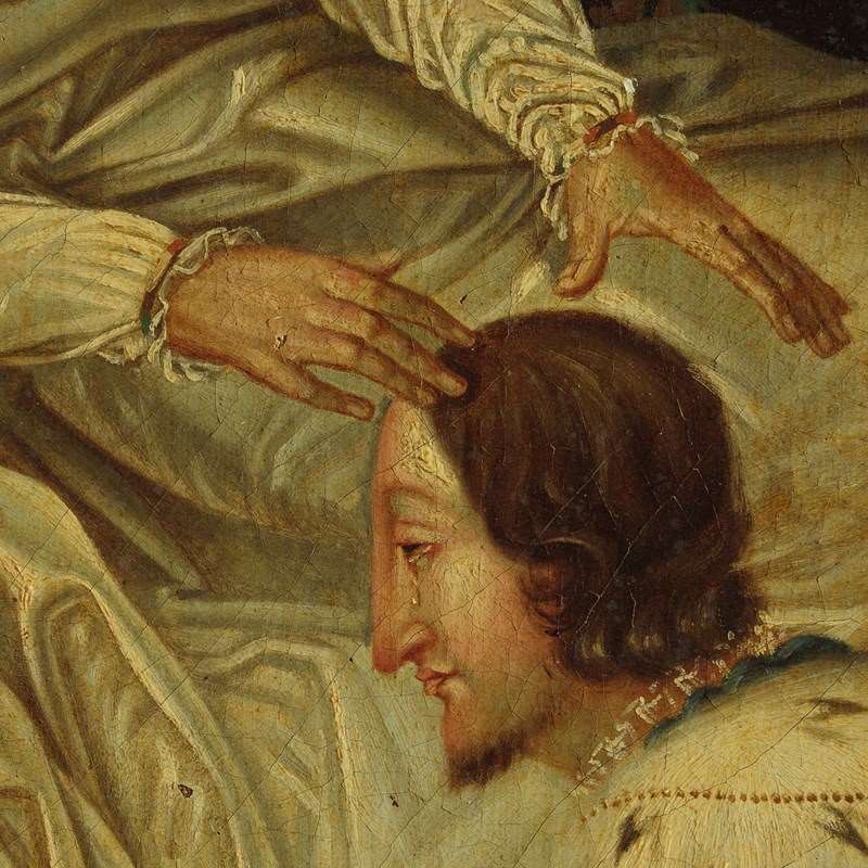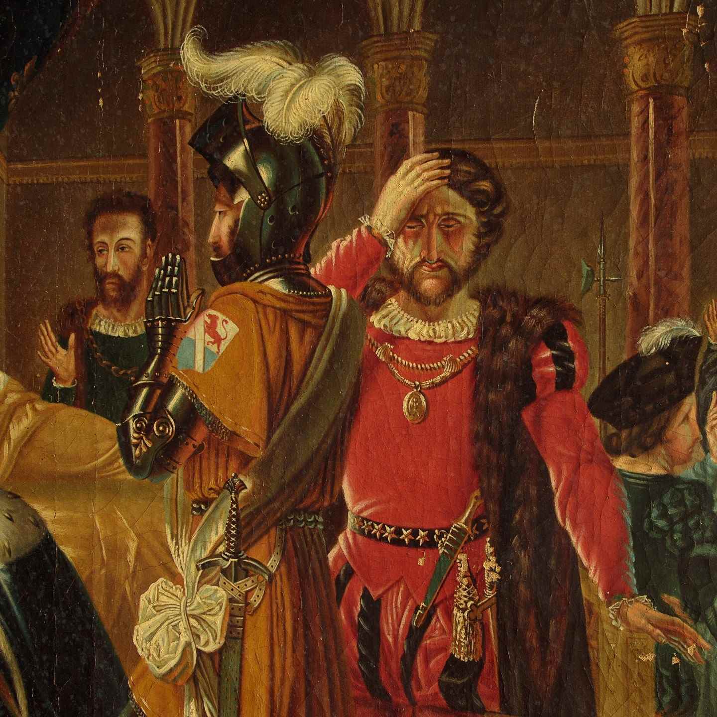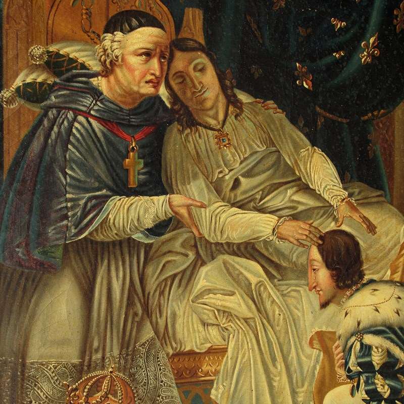 Large oil painting of the death of King Louis XII of France after the original by the acclaimed French history painter Merry-Joseph Blondel (1781-1853) c.1900. The King lies dying in a bed surrounded with drapes carrying the Fleur de Lis emblem of French royalty, with his crown and the Main de Justice sceptre by his side. With the help of a priest he bestows his blessing on a young prince, presumably his successor Francis I, whilst other grieving knights and noblemen stand at the foot of the bed. In the background, below Gothic arches, stand a group of grieving women and the common people, their hands raised in prayer for a popular king known as 'The Father of the People'. Well painted in oil on canvas. With some areas of damage but all away from the faces. Presented in the original giltwood and gesso frame which is in good condition.