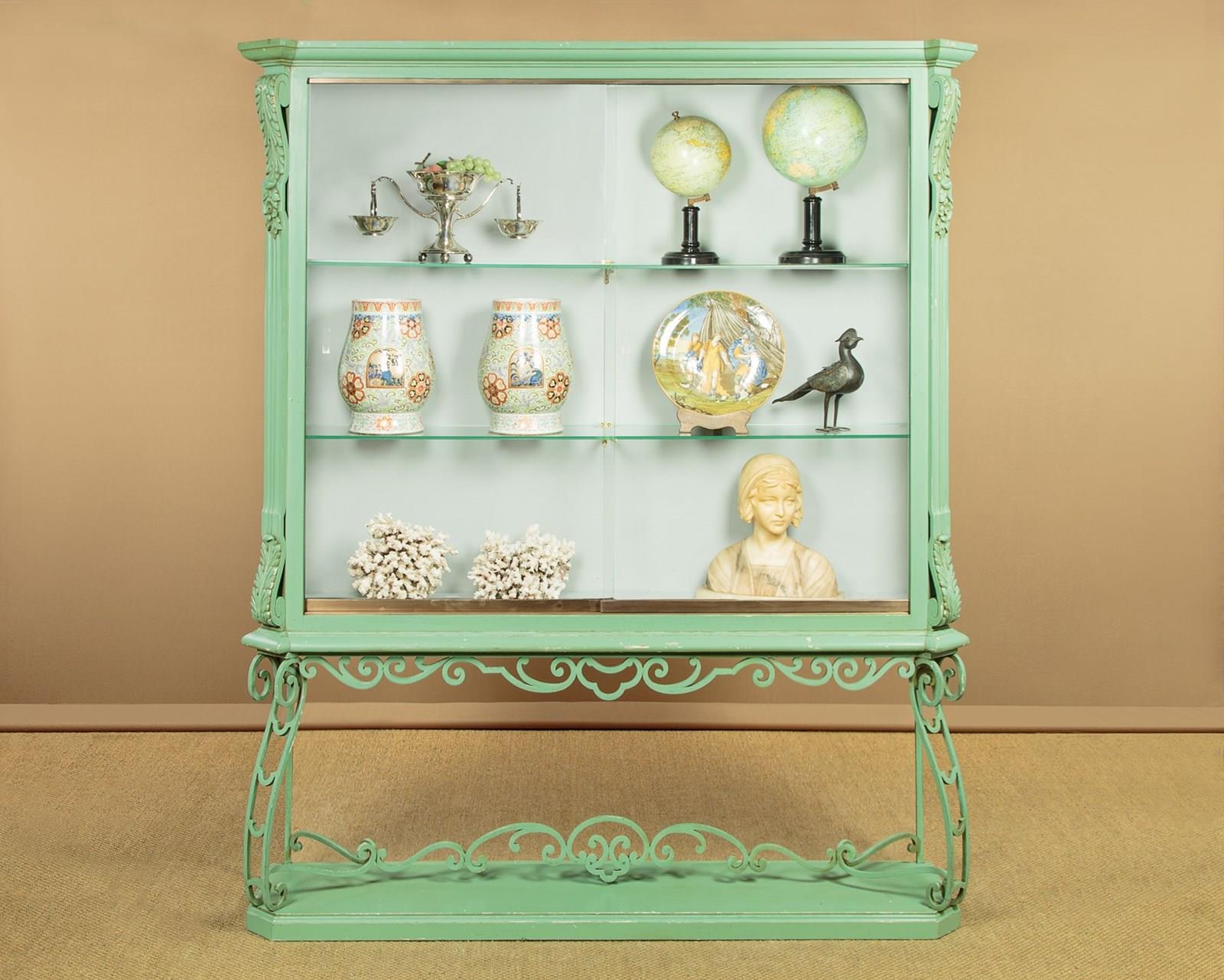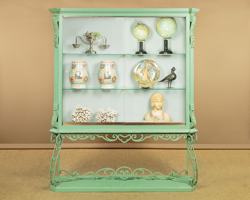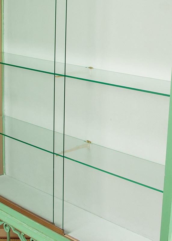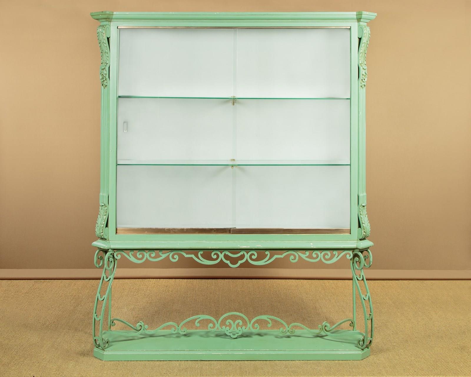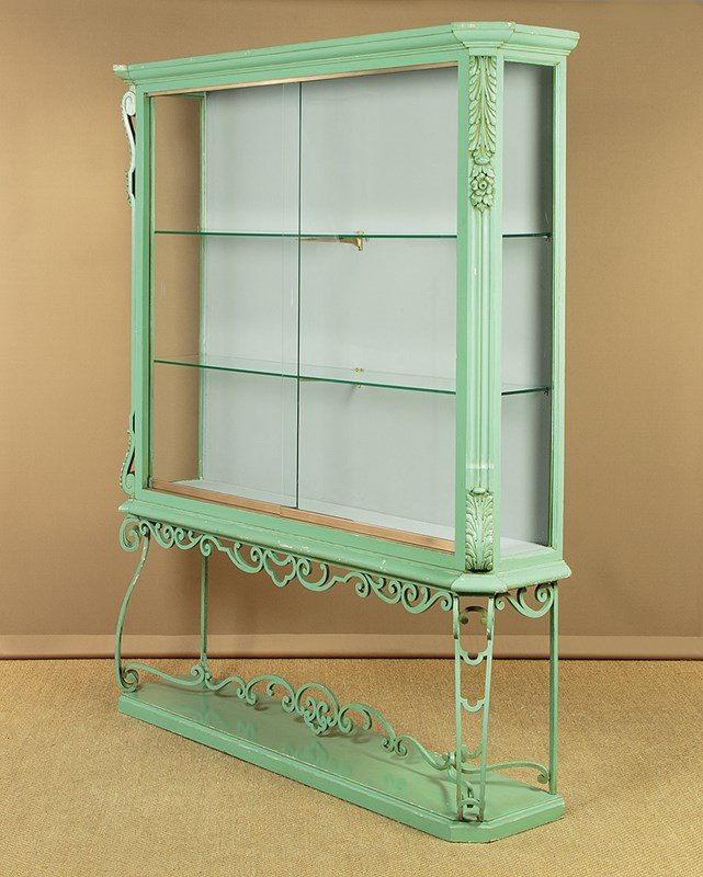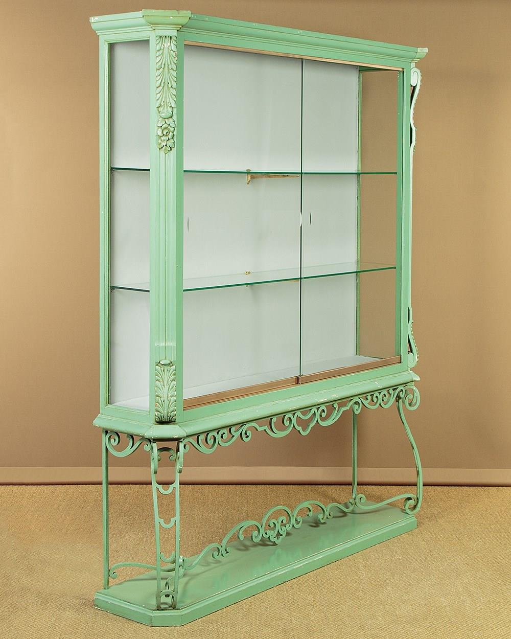 Impressively large shop display cabinet or vitrine c.1950. Glazed top with large plate glass sliding doors and fitted inside with two 8mm plate glass shelves (depth 10"). Good quality brass centre brackets, brass trim to the bottom of the doors which run smoothly on little wheels within a brass track top and bottom. Moulded cornice over canted corners with carved acanthus detail and glazed sides. Raised on a separate base with scrolling wrought iron apron, legs and stretchers over a moulded plinth. Original pale green painted exterior with some minor wear. The inside has been freshly painted pale grey. Recently fitted with spotlights in the top (untested). Very good condition.