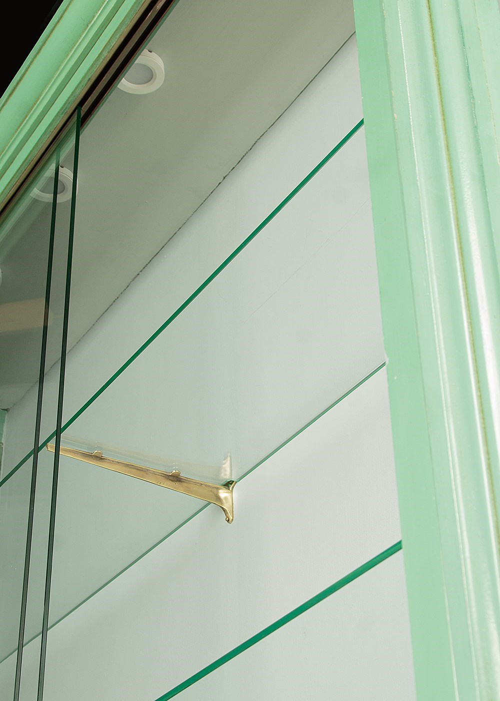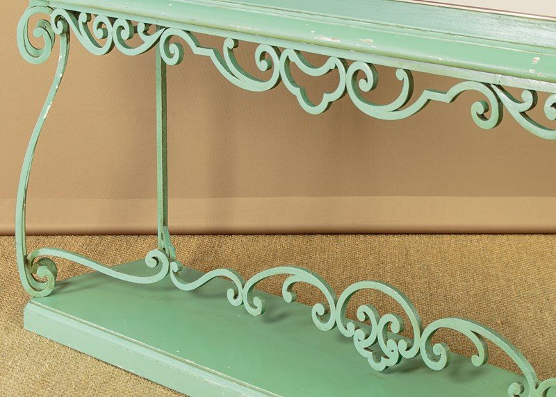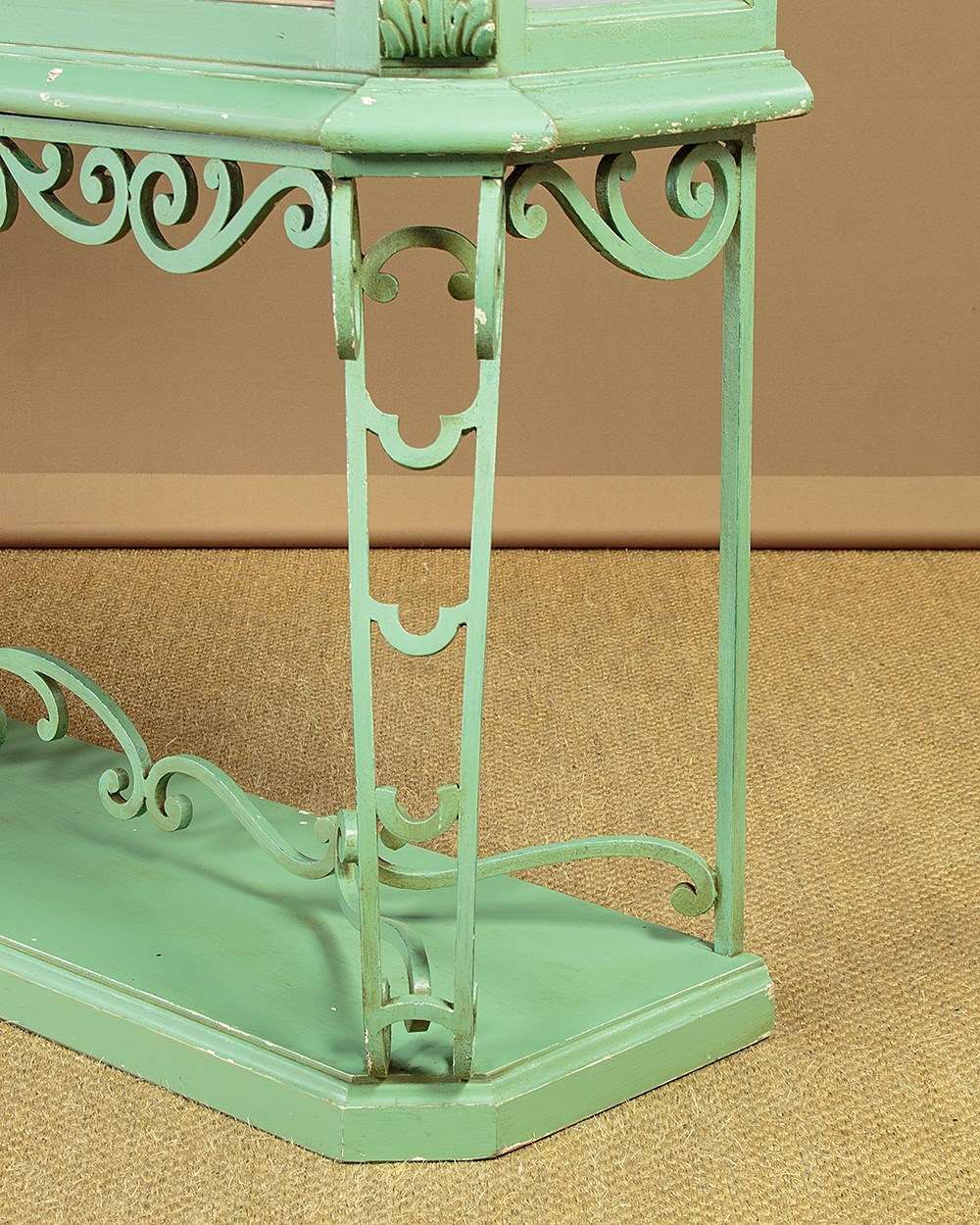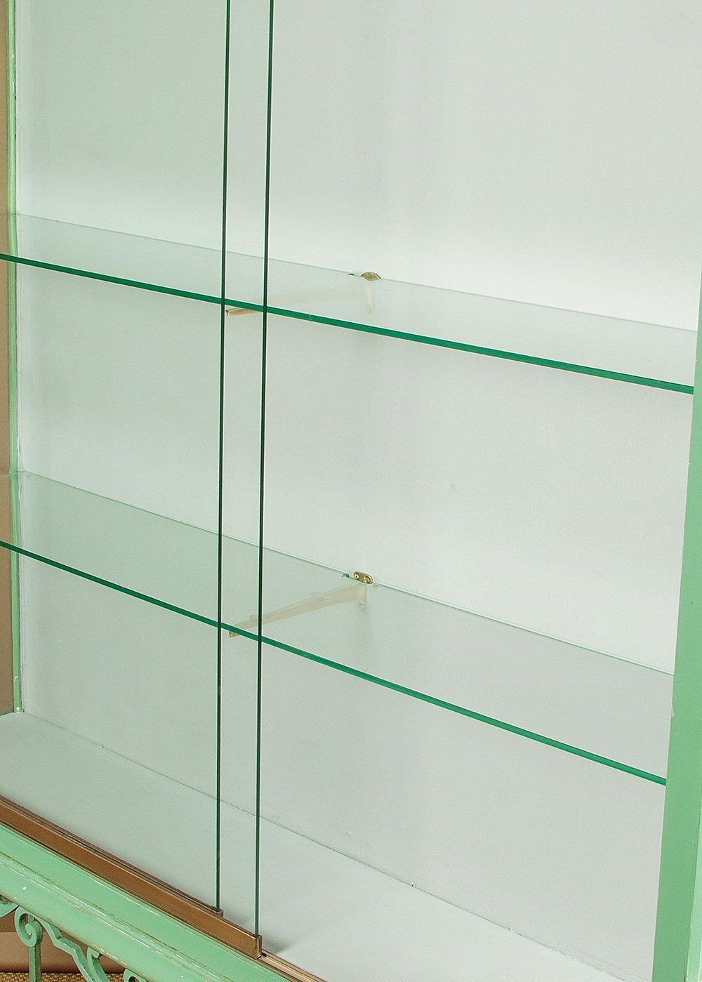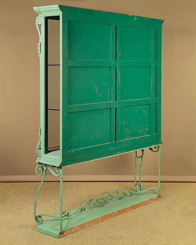 Impressively large shop display cabinet or vitrine c.1950. Glazed top with large plate glass sliding doors and fitted inside with two 8mm plate glass shelves (depth 10"). Good quality brass centre brackets, brass trim to the bottom of the doors which run smoothly on little wheels within a brass track top and bottom. Moulded cornice over canted corners with carved acanthus detail and glazed sides. Raised on a separate base with scrolling wrought iron apron, legs and stretchers over a moulded plinth. Original pale green painted exterior with some minor wear. The inside has been freshly painted pale grey. Recently fitted with spotlights in the top (untested). Very good condition.