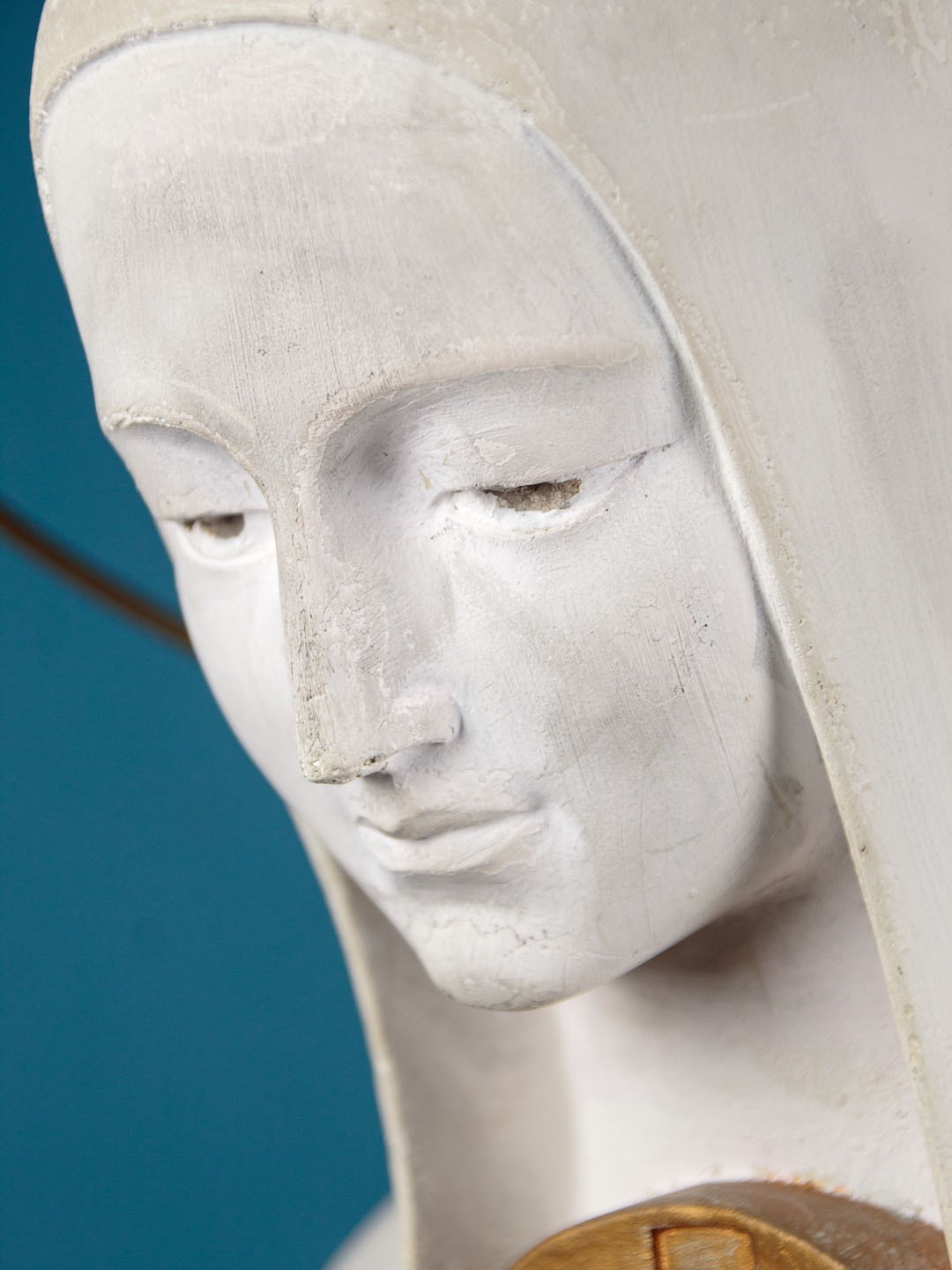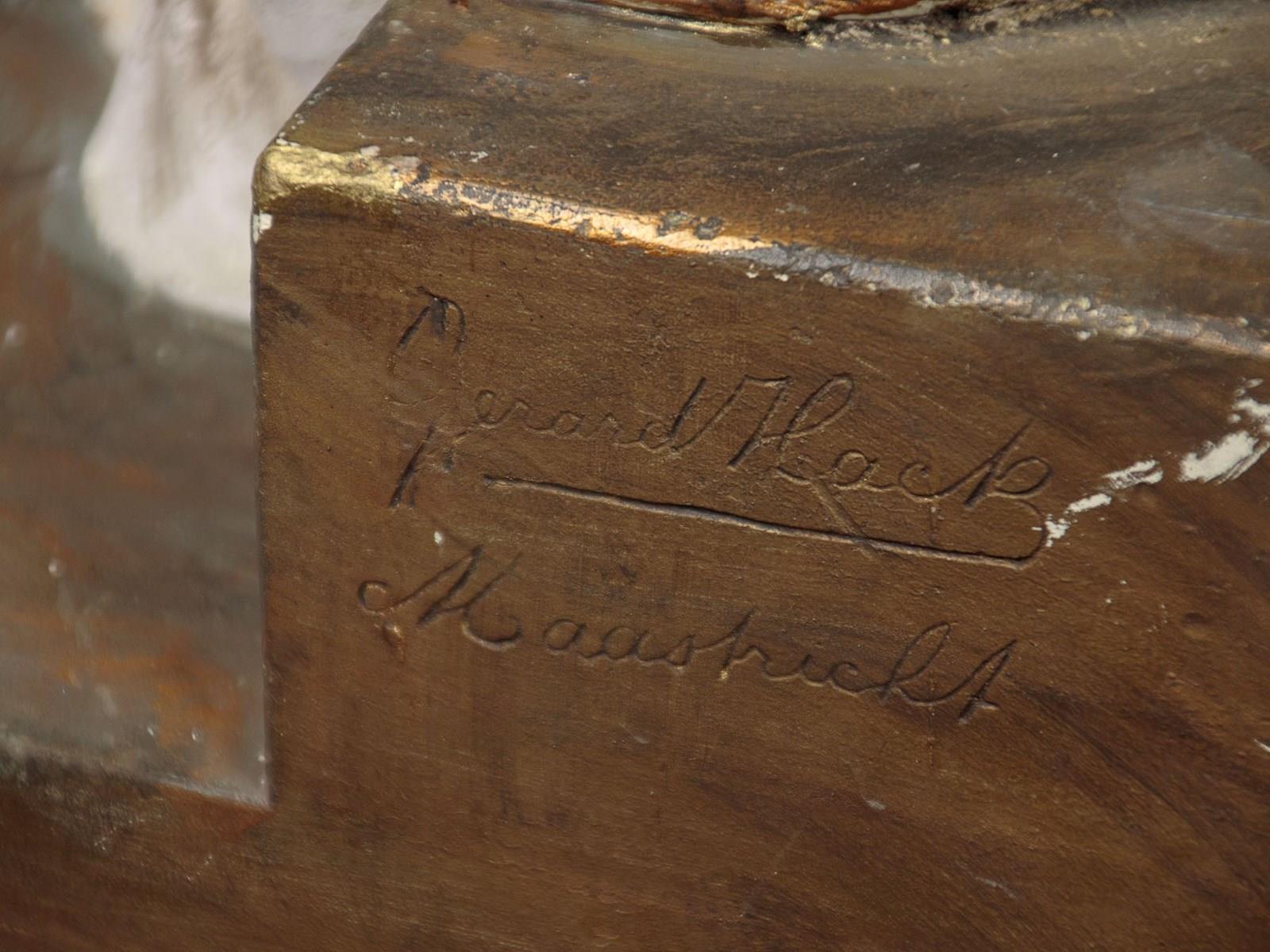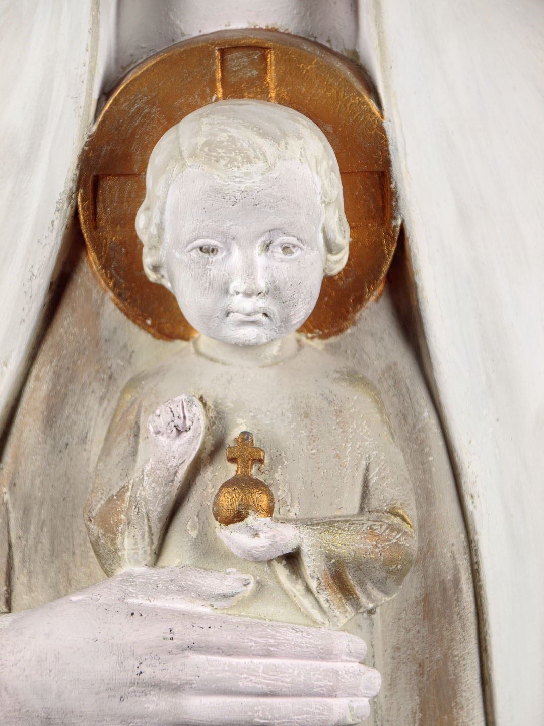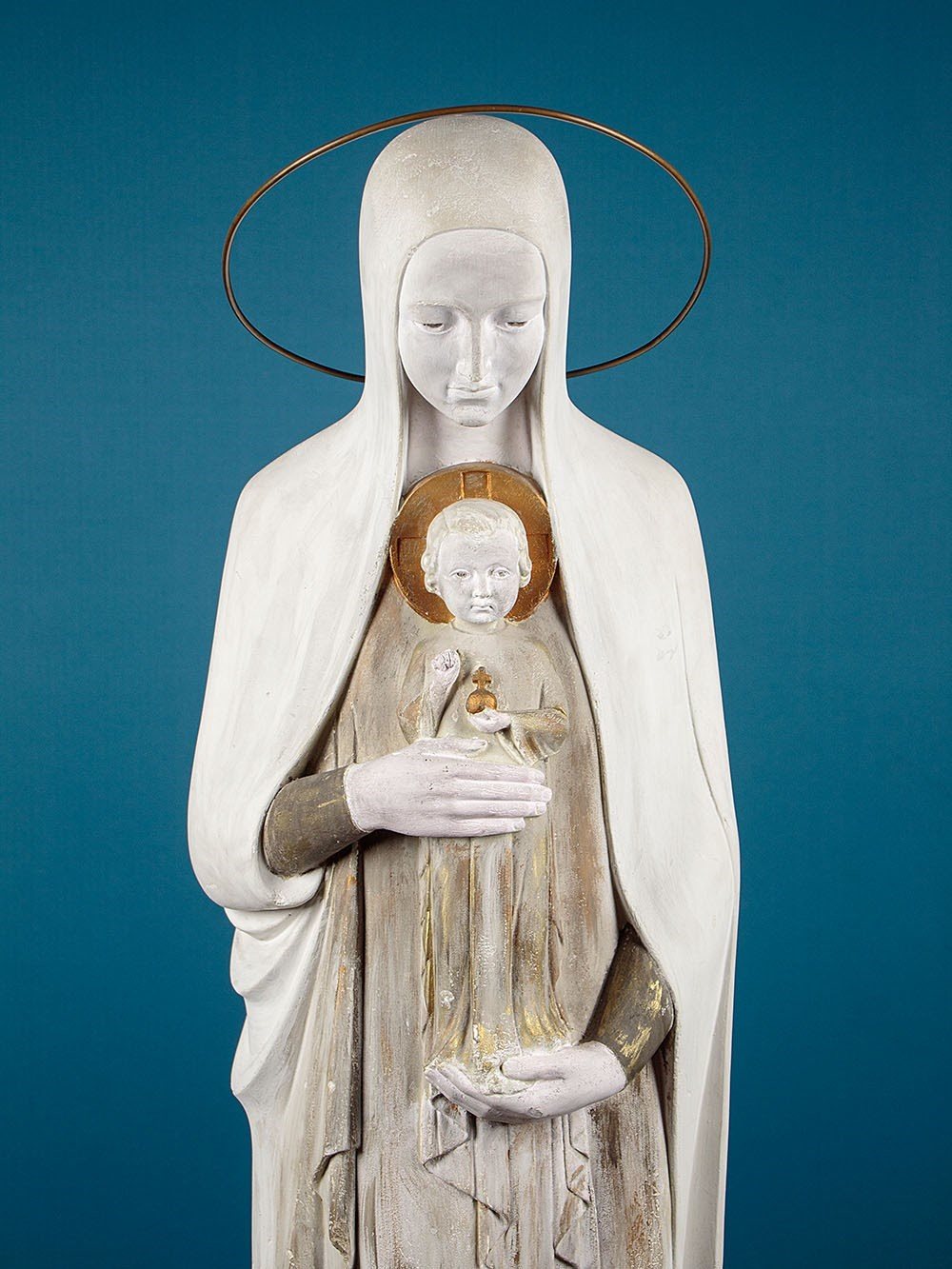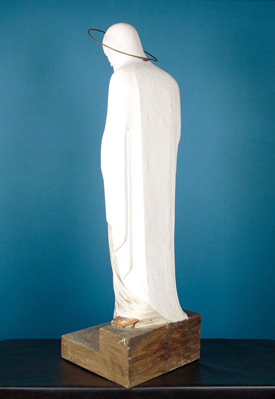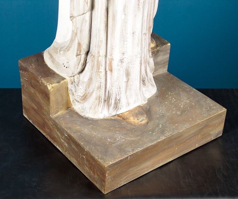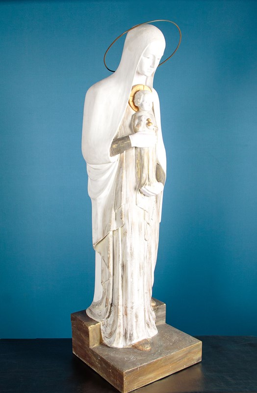 Large mid century stature of Mary and the infant Christ by the Dutch sculptor Gerard Hack (1893 - 1975) c.1960. Standing very nearly four feet tall, modelled in white plaster with gold painted detail. Full length figure of Mary in a hooded cloak and robes carrying the infant Christ with gold halo and orb with cross symbolising dominion over the word. With a brass halo over Mary's, cleverly head fitted at the rear. Signed on the base Gerard Hack Maastricht. Missing the raised figures on Christ's hand and some repairs and retouching to the base. Otherwise very good condition.