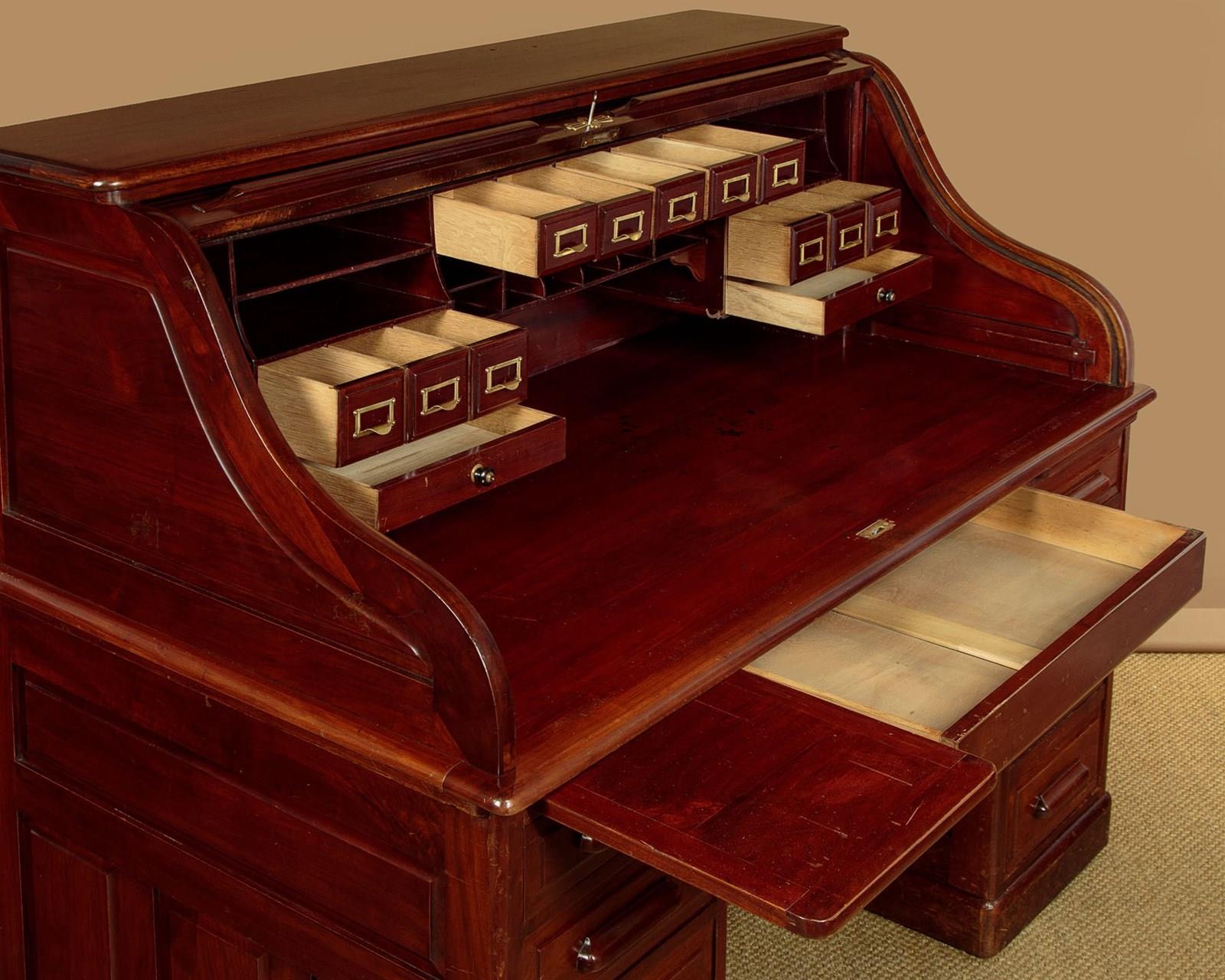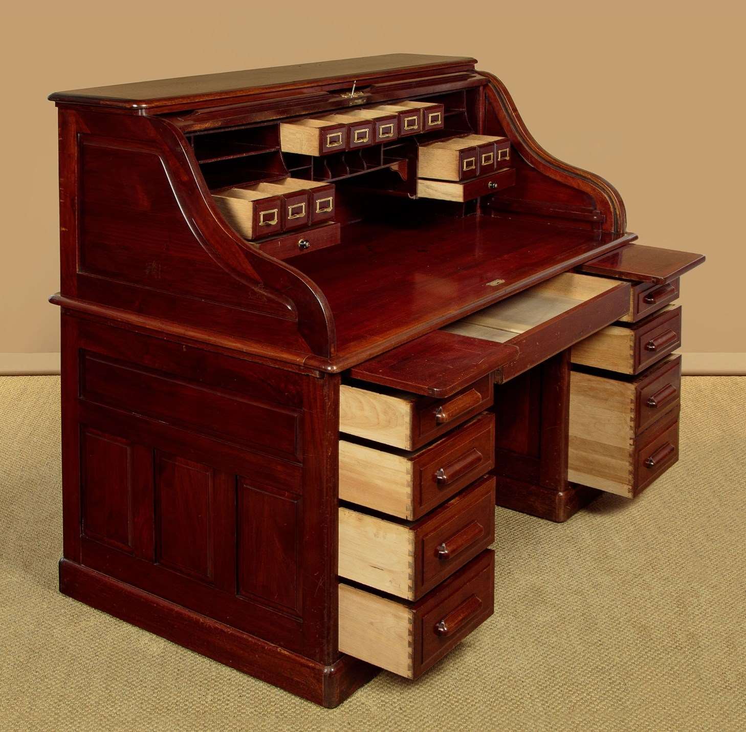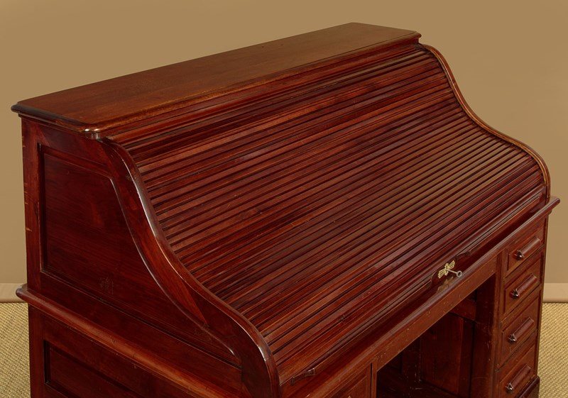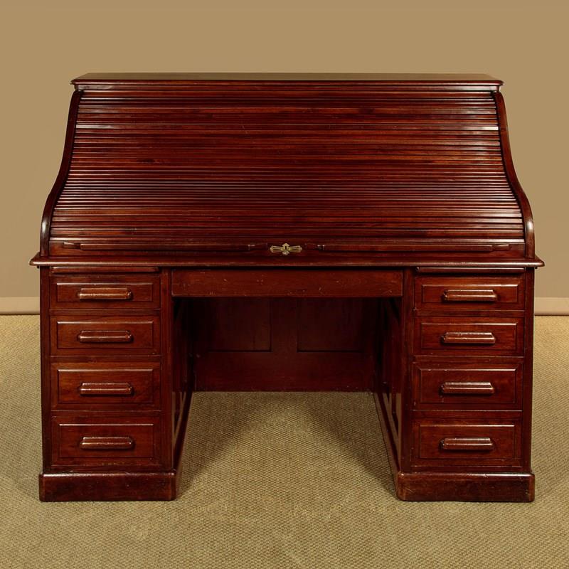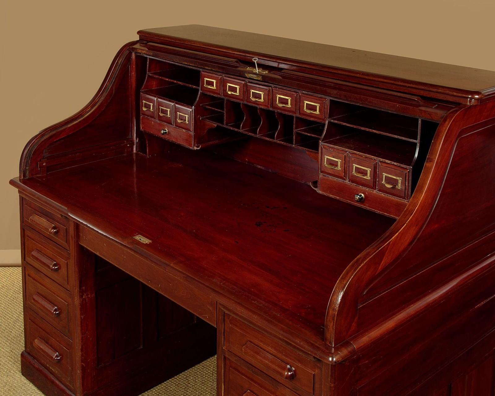 Good quality Edwardian walnut roll top desk c.1910. Lift the tamboured roll to reveal a good sized workspace (desk top height 30") and a superb fitted interior of 11 small drawers with the original brass label holder handles, plus pigeon holes, two slim stationery drawers and sliding pen trays. On drawer pedestals, each with a writing slide in the top. Note the lower drawer on the right hand pedestal is double height. Single drawer at the centre over a good sized kneehole (width 26½", height 25"). Solid walnut raised and fielded panels to the sides and rear, polished on all sides. Raised on the original metal castors. Typical old wear to the finish. Otherwise very good colour and condition, cleaned and waxed in our workshops. Desk key supplied.