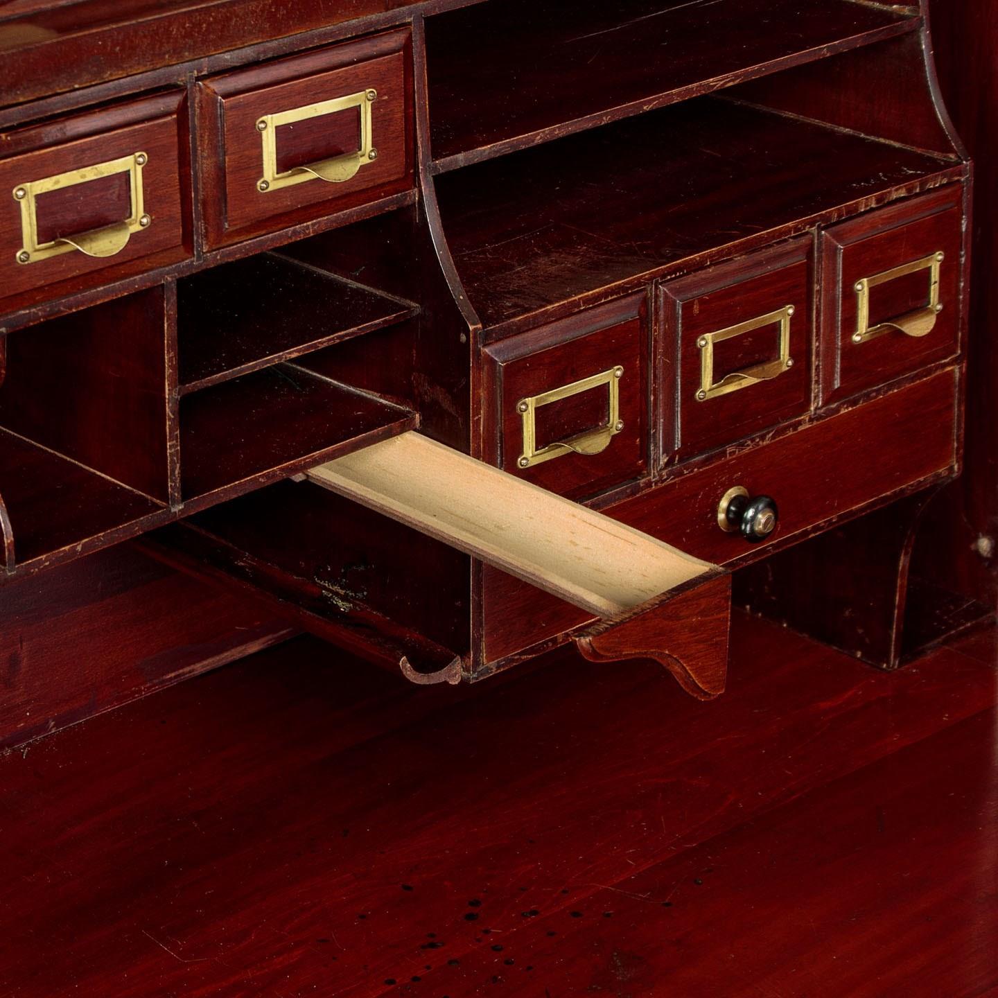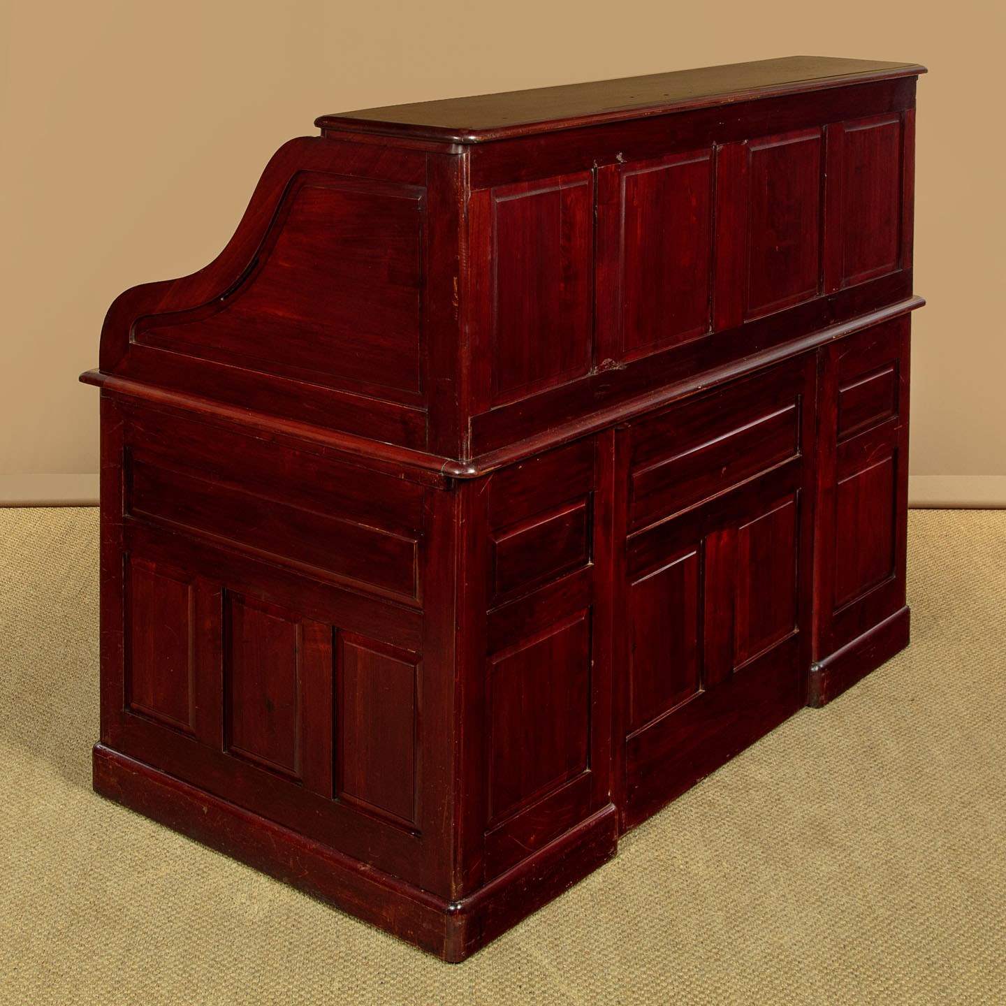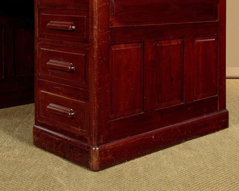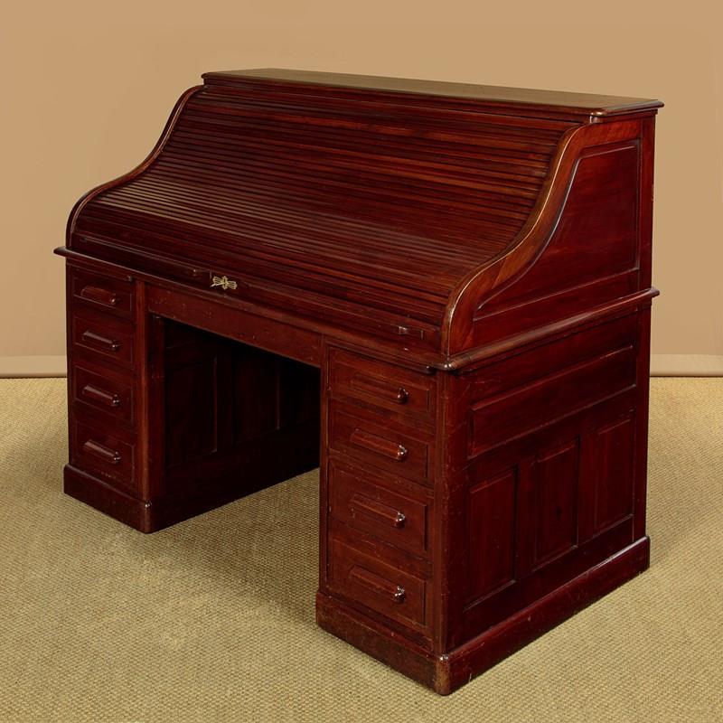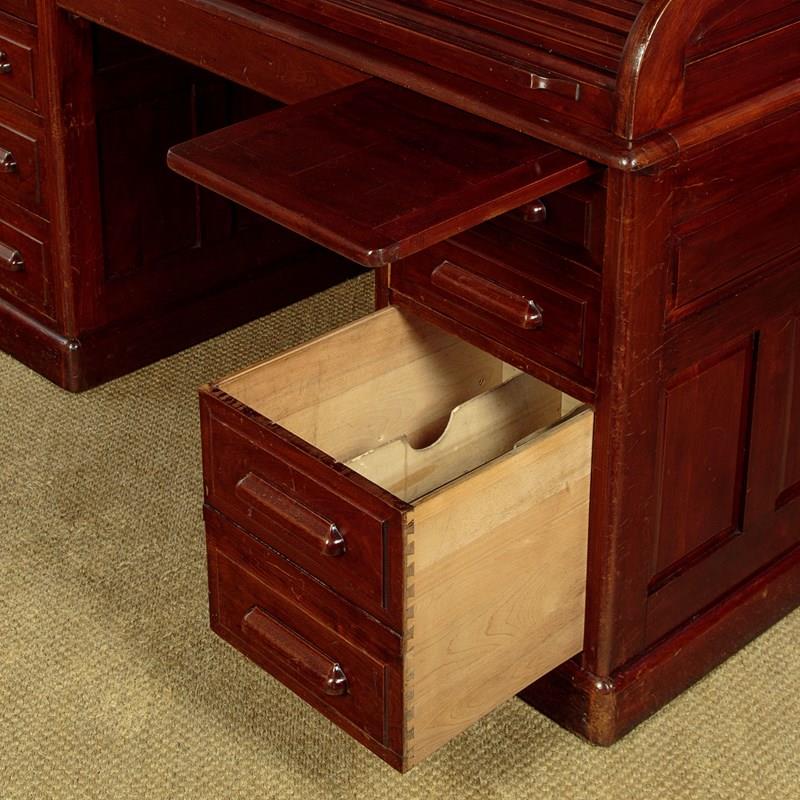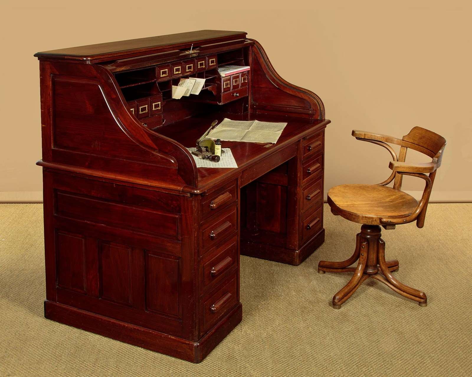 Good quality Edwardian walnut roll top desk c.1910. Lift the tamboured roll to reveal a good sized workspace (desk top height 30") and a superb fitted interior of 11 small drawers with the original brass label holder handles, plus pigeon holes, two slim stationery drawers and sliding pen trays. On drawer pedestals, each with a writing slide in the top. Note the lower drawer on the right hand pedestal is double height. Single drawer at the centre over a good sized kneehole (width 26½", height 25"). Solid walnut raised and fielded panels to the sides and rear, polished on all sides. Raised on the original metal castors. Typical old wear to the finish. Otherwise very good colour and condition, cleaned and waxed in our workshops. Desk key supplied.