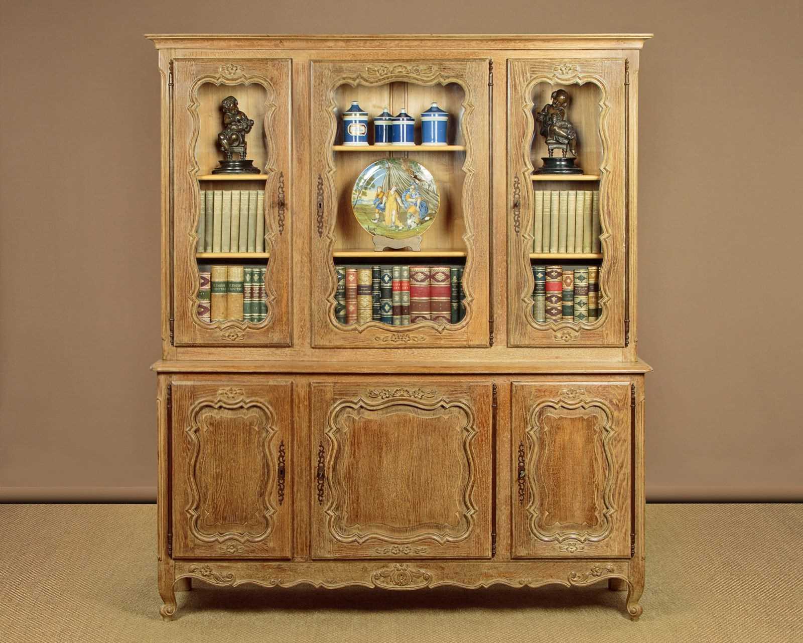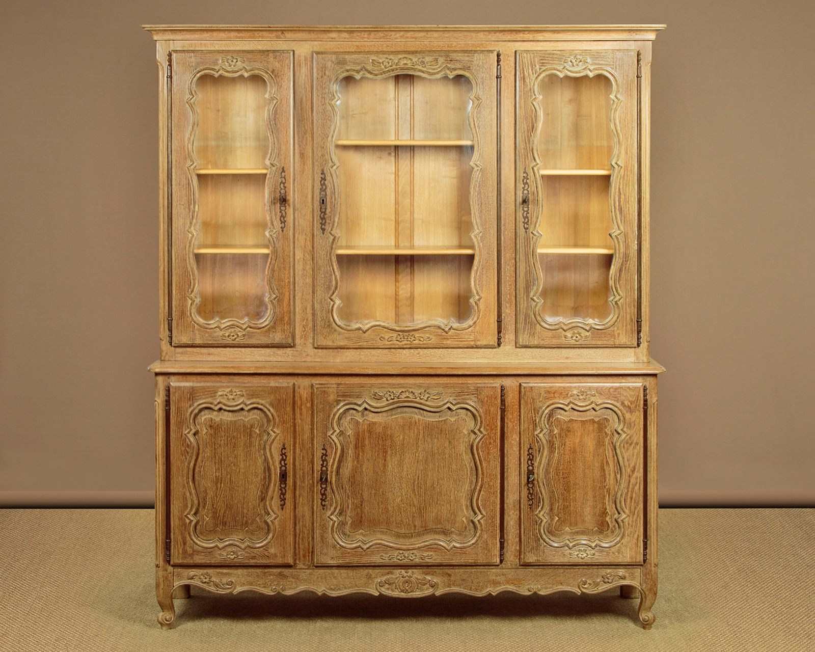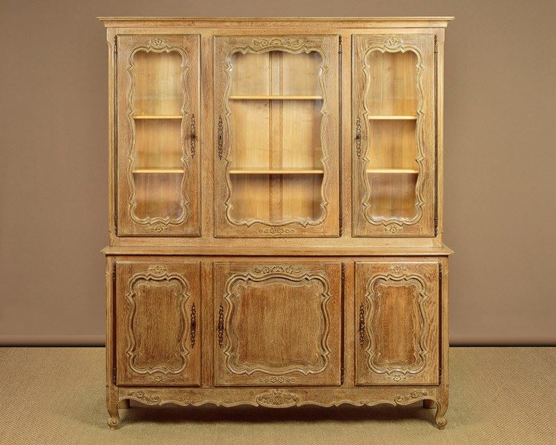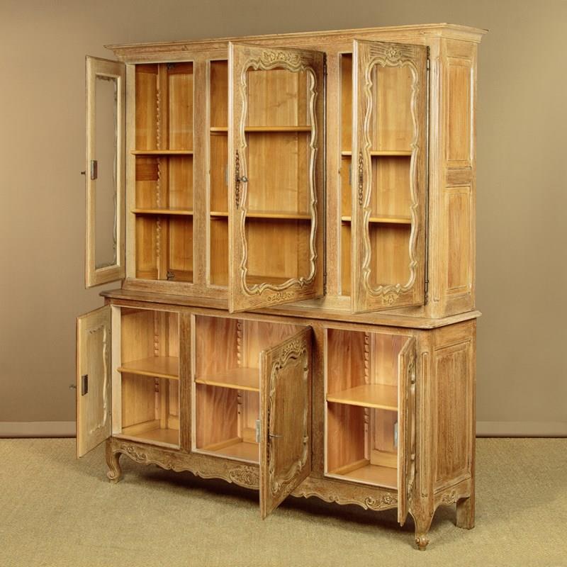 Large French limed oak bookcase. In two pieces, the three door glazed bookcase top with two adjustable shelves to each section (internal depth 10½"). Over a deeper blind door cupboard base with a single adjustable shelf to each section (internal depth 14"). Moulded cornice over attractively shaped door panels with moulded surround and carved floral detail. Long steel hinges and escutcheons to each door. Shaped and carved apron to the front and sides, scroll carved front feet. Solid oak carcass, raised and fielded oak panelled sides, ash back panels. Excellent condition, cleaned and waxed in our workshops. Keys supplied.