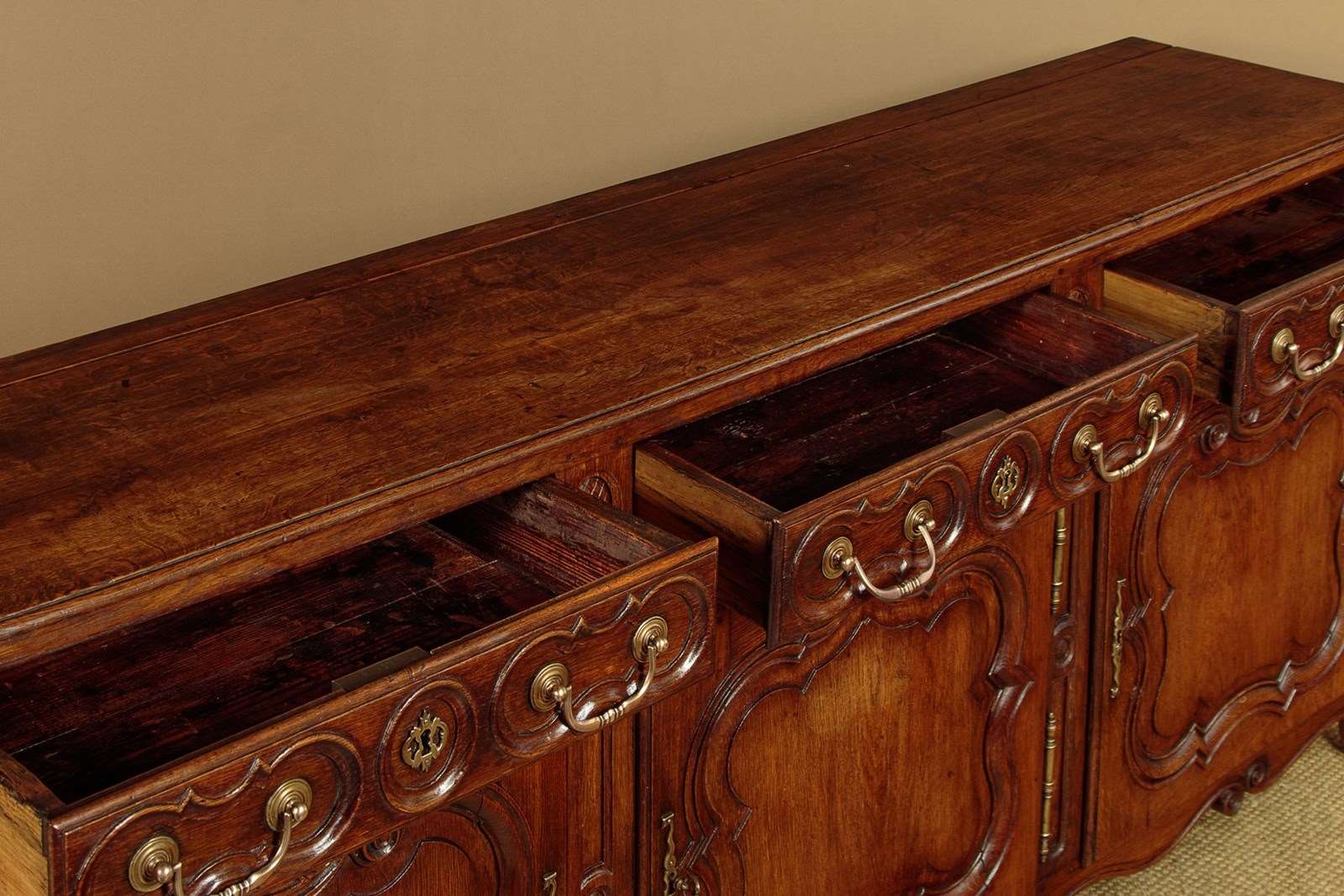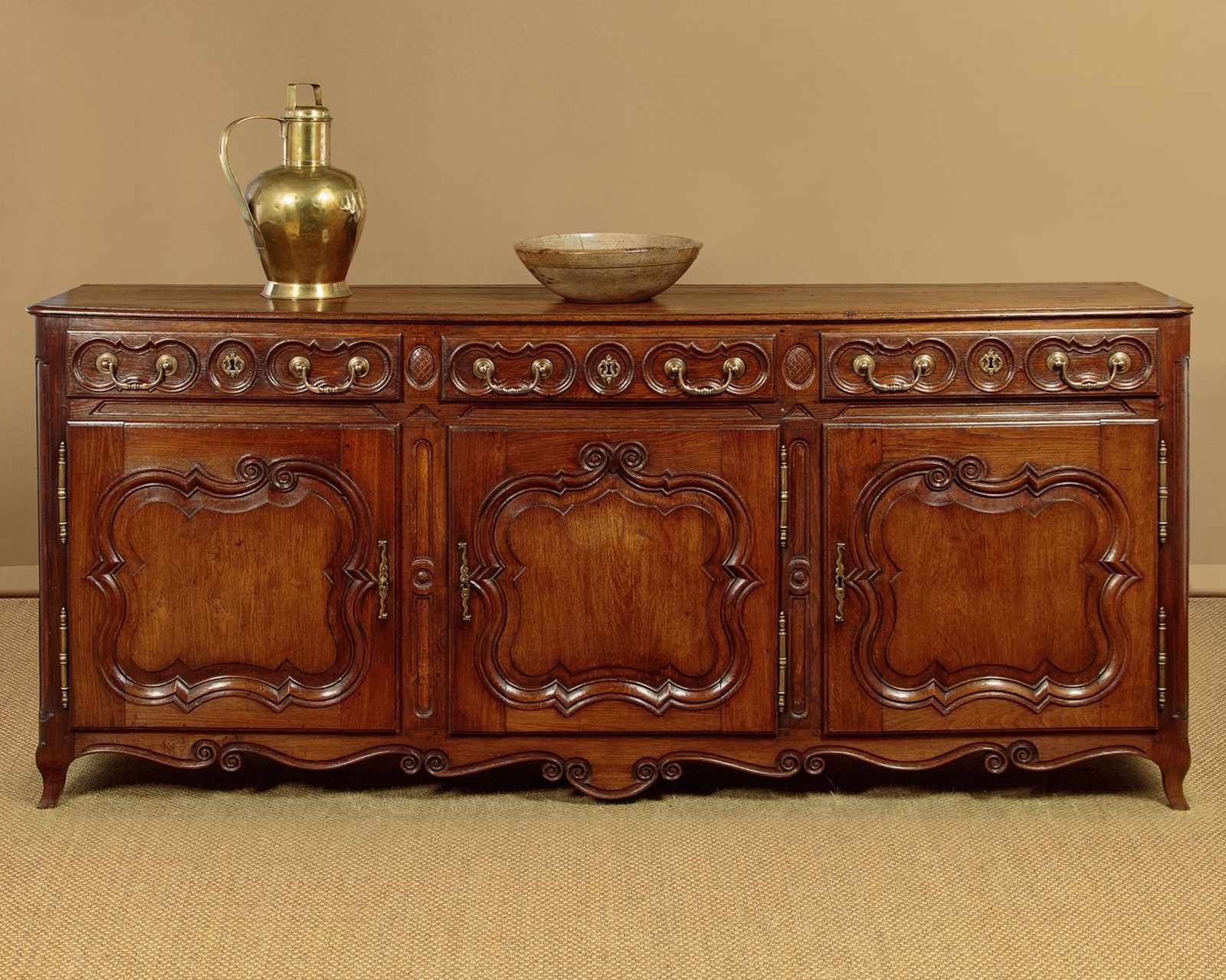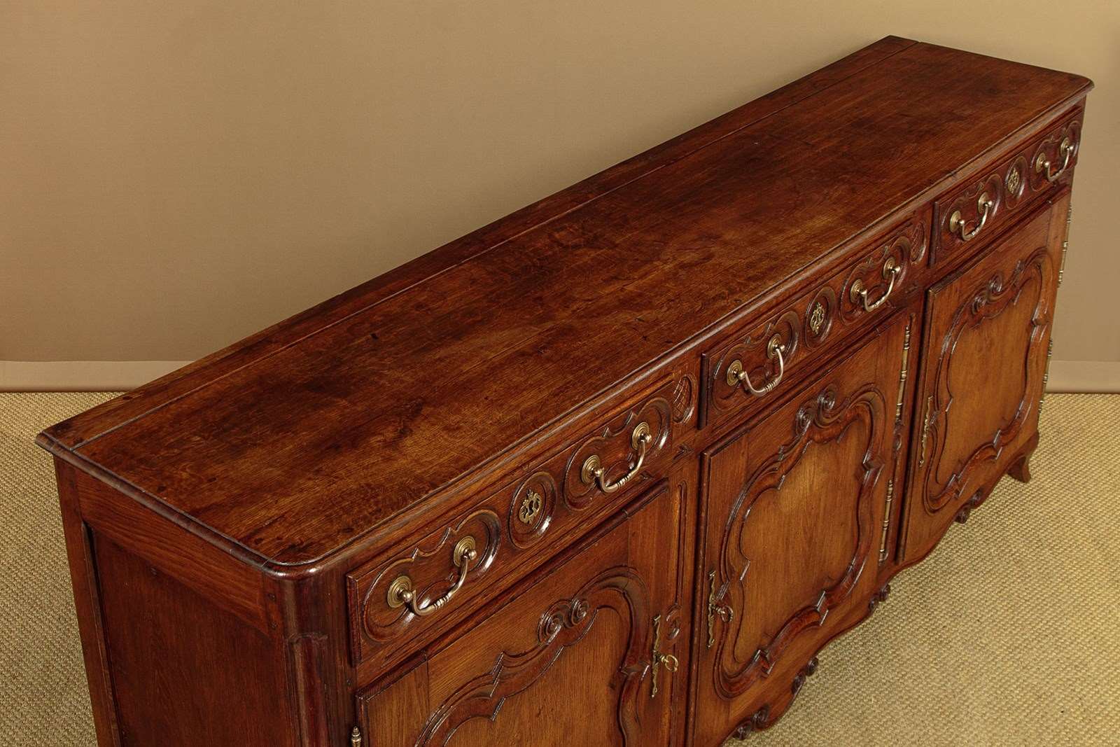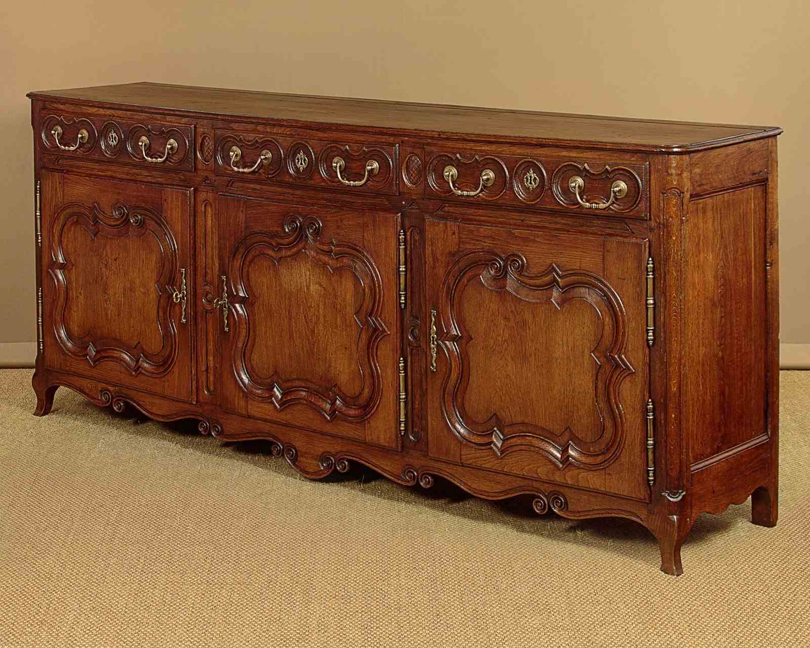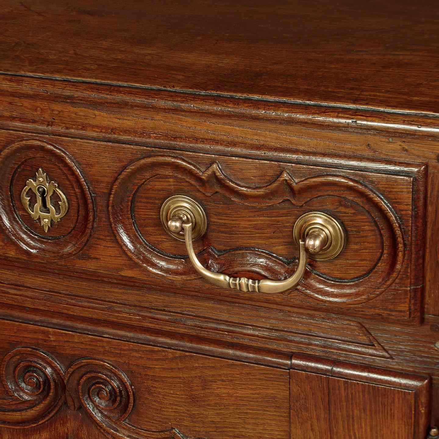Unusually long late 18th.c. French oak sideboard or dresser c.1780. Very nearly seven and half feet long. Single piece top with rounded corners, a moulded edge and a plate groove along the back. Over three drawers and three cupboards, each fitted with a single shelf inside (internal depth 16"). Good decorative front with carved drawer fronts and shaped door panels within carved surround and a shaped and carved apron. Large brass handles, hinges and escutcheon plates. Oak panelled sides, pine drawer linings and backboards. Excellent colour and condition, cleaned and waxed in our workshops. Cupboard keys supplied.