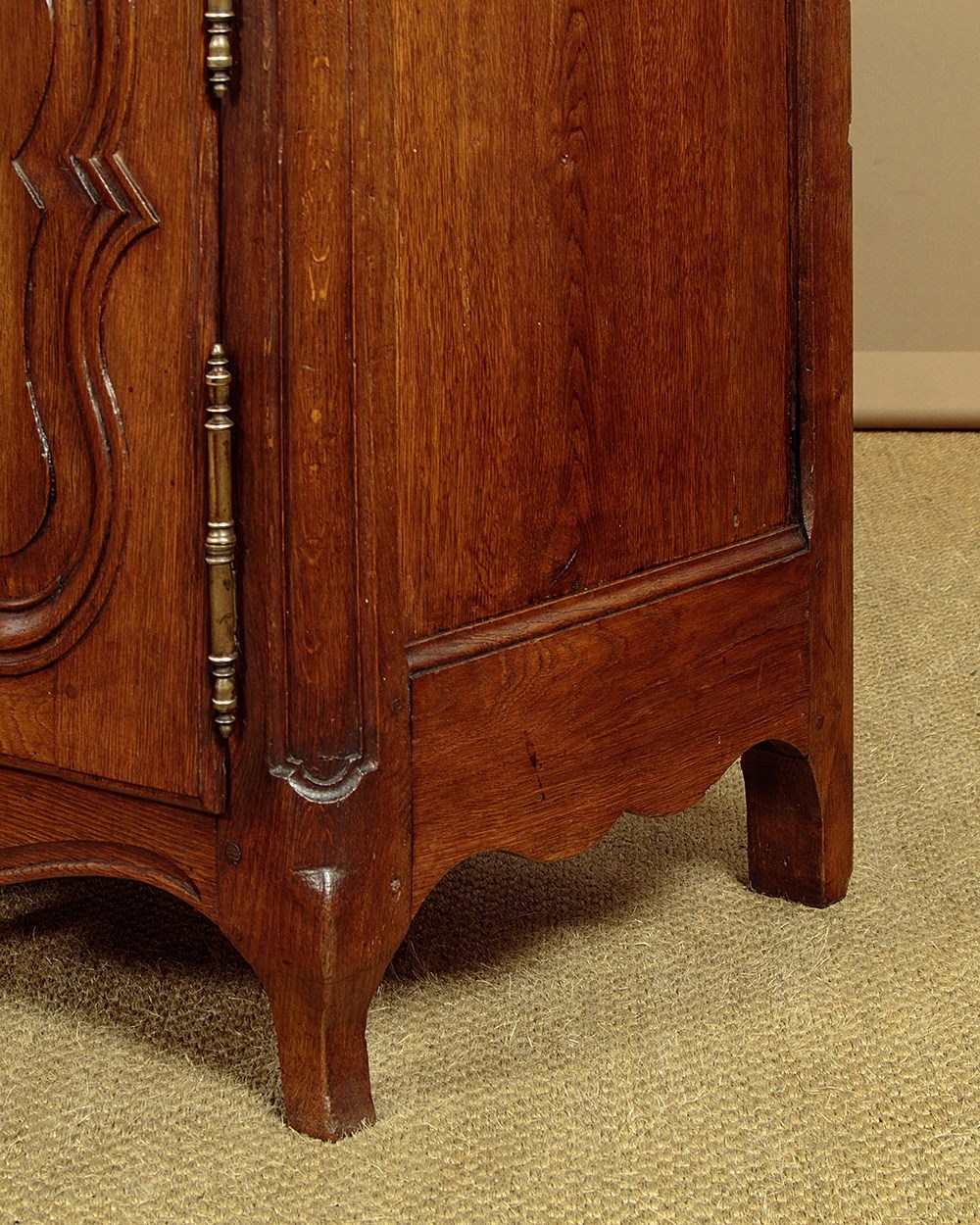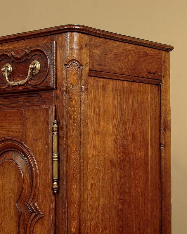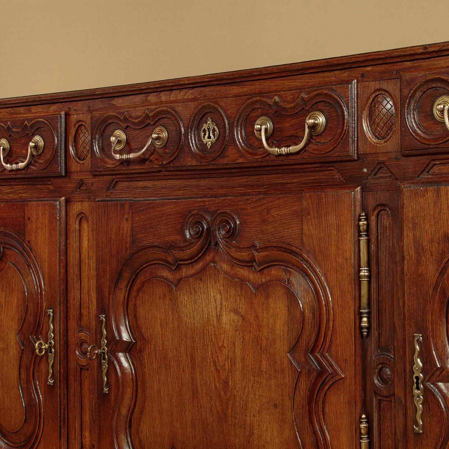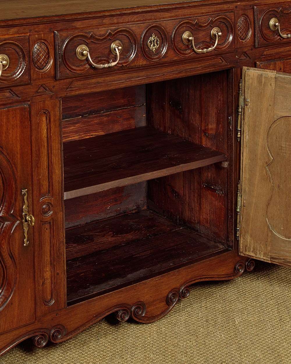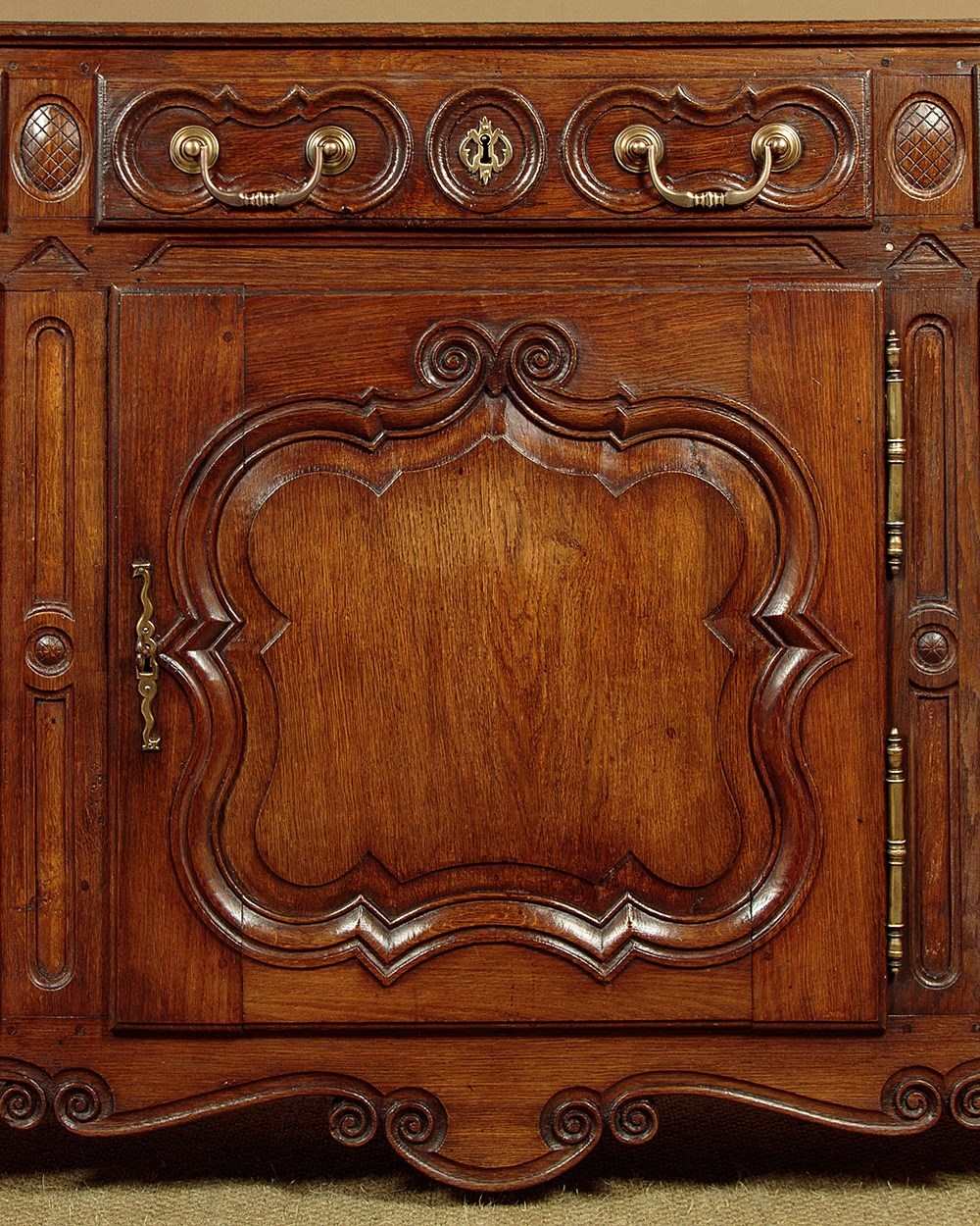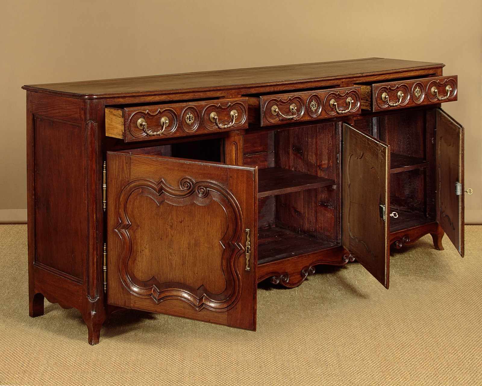 Unusually long late 18th.c. French oak sideboard or dresser c.1780. Very nearly seven and half feet long. Single piece top with rounded corners, a moulded edge and a plate groove along the back. Over three drawers and three cupboards, each fitted with a single shelf inside (internal depth 16"). Good decorative front with carved drawer fronts and shaped door panels within carved surround and a shaped and carved apron. Large brass handles, hinges and escutcheon plates. Oak panelled sides, pine drawer linings and backboards. Excellent colour and condition, cleaned and waxed in our workshops. Cupboard keys supplied.