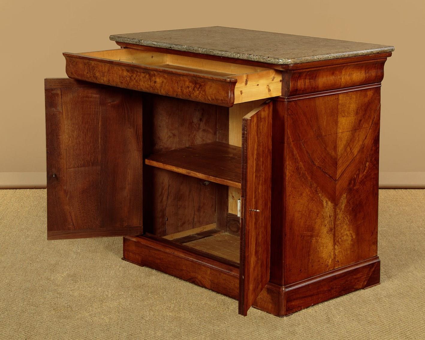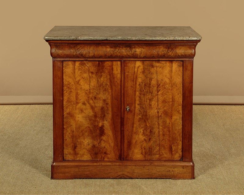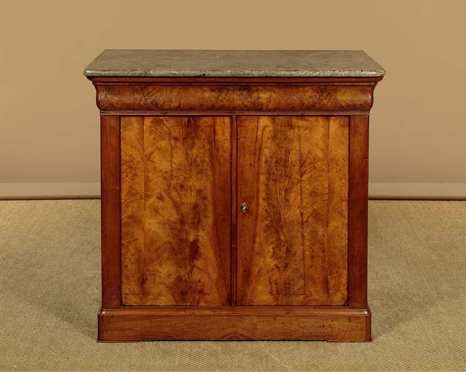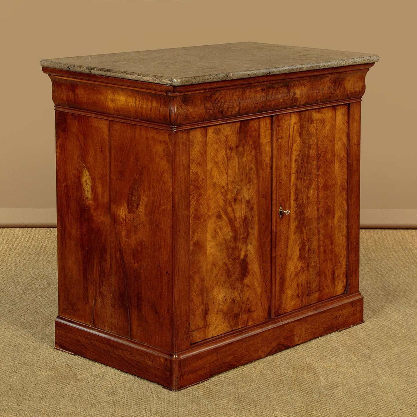 Unusual little French Louis Philippe era walnut and marble top side cabinet c.1840. Beautifully figured grey marble top with a rounded edge. Over a two door cabinet fitted with a single shelf inside (internal depth 18") and with a single drawer above. Minimal applied decoration focusses attention on the highly figured walnut timber used as a symmetrically arranged veneer on the drawer and door fronts and as solid boards (also symmetrically arranged) on the sides. Moulded plinth raised on slim pads. Very good colour and condition, restored cleaned and waxed in our workshops. Key supplied.