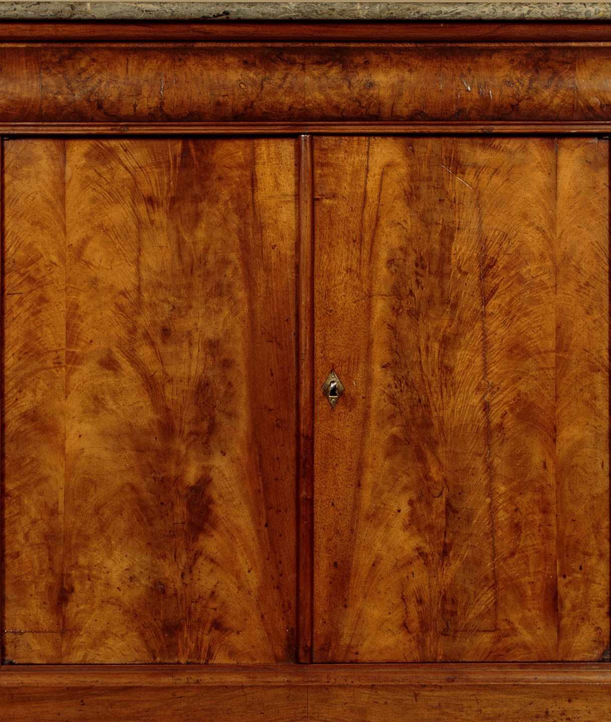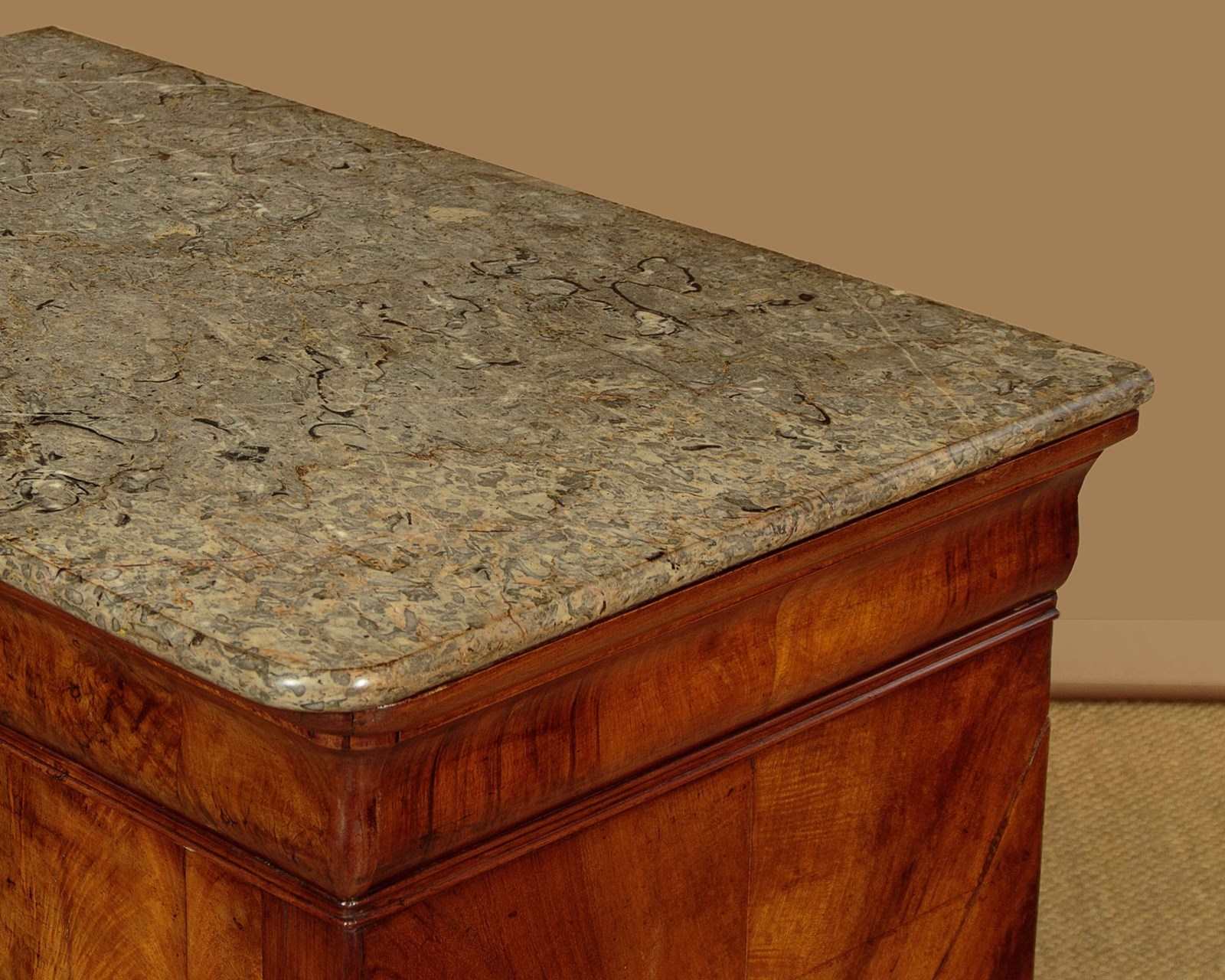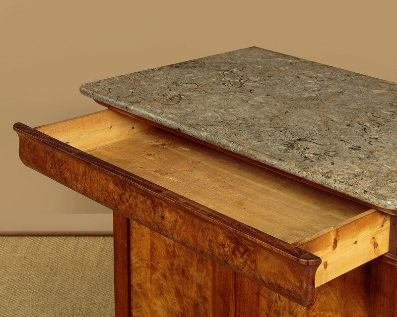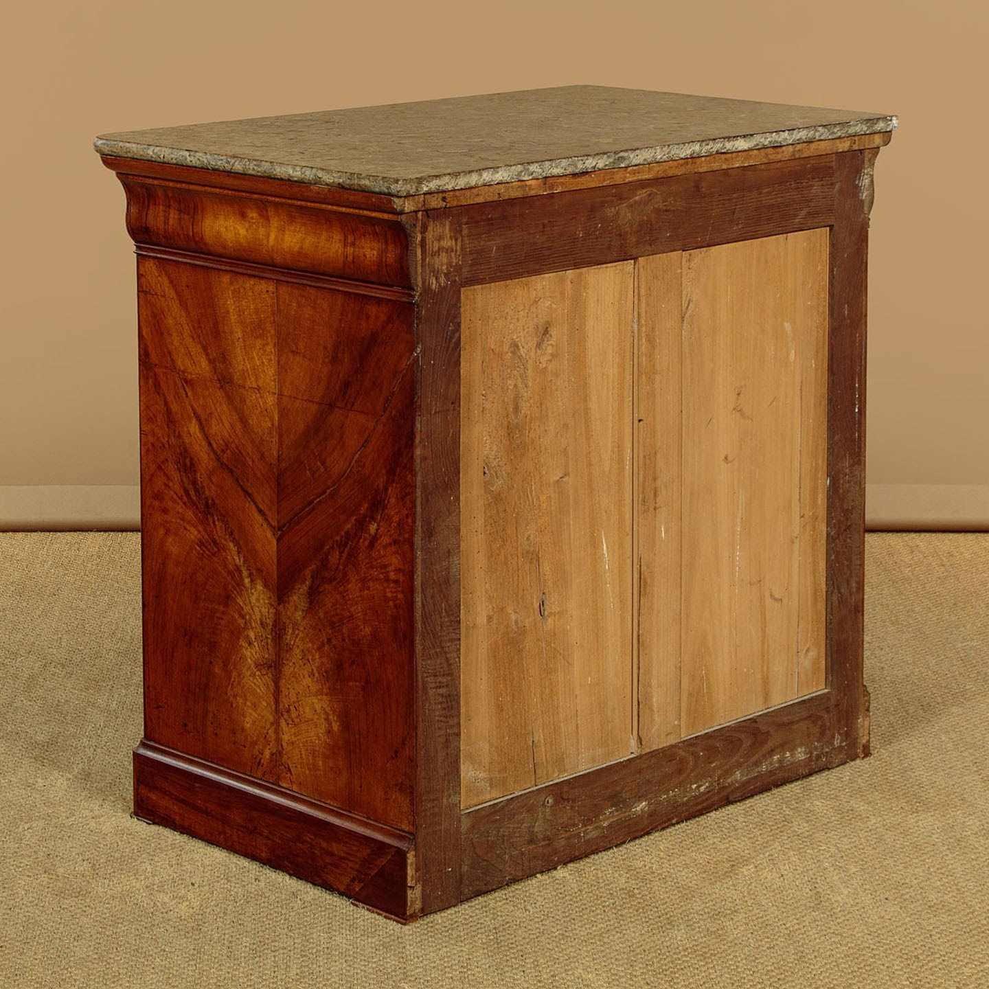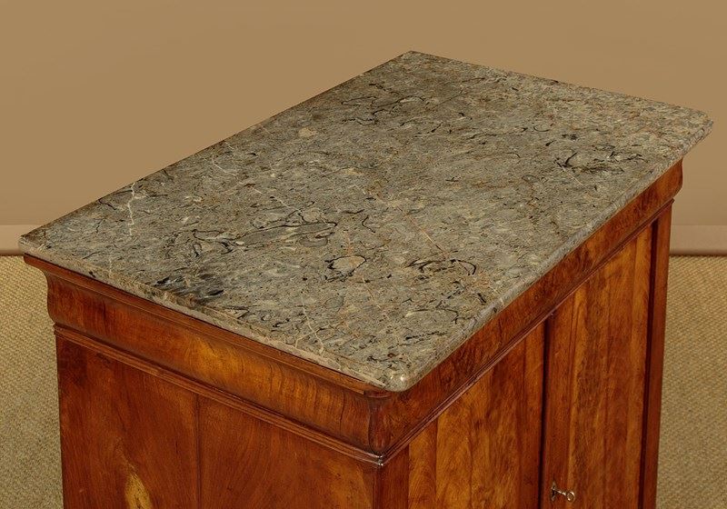 Unusual little French Louis Philippe era walnut and marble top side cabinet c.1840. Beautifully figured grey marble top with a rounded edge. Over a two door cabinet fitted with a single shelf inside (internal depth 18") and with a single drawer above. Minimal applied decoration focusses attention on the highly figured walnut timber used as a symmetrically arranged veneer on the drawer and door fronts and as solid boards (also symmetrically arranged) on the sides. Moulded plinth raised on slim pads. Very good colour and condition, restored cleaned and waxed in our workshops. Key supplied.