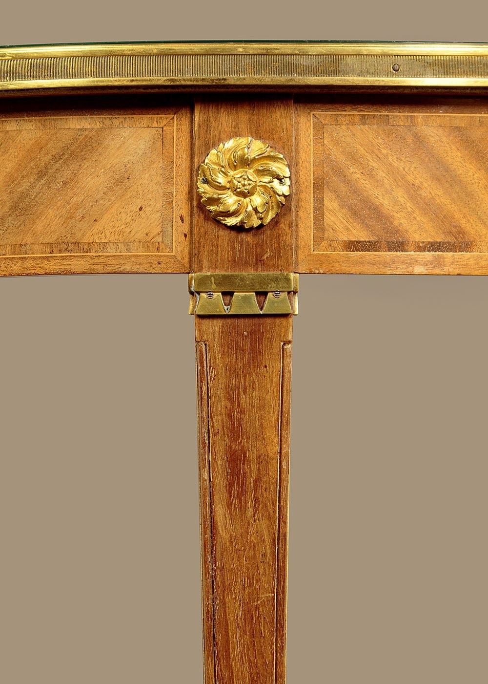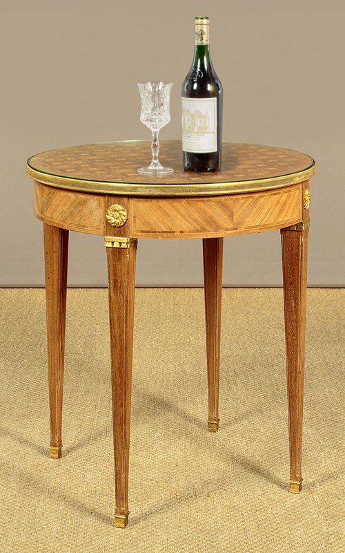 Smart little French Louis XVI style inlaid side table c.1960. Superb top with repeated inlaid detail into the parquetry work ground and with a reeded brass edge moulding which holds a loose glass top snugly in place. Over an inlaid and veneered apron with brass flower head roundels. Raised on slim tapering legs with moulded edges, brass mounts and feet. Very good condition.