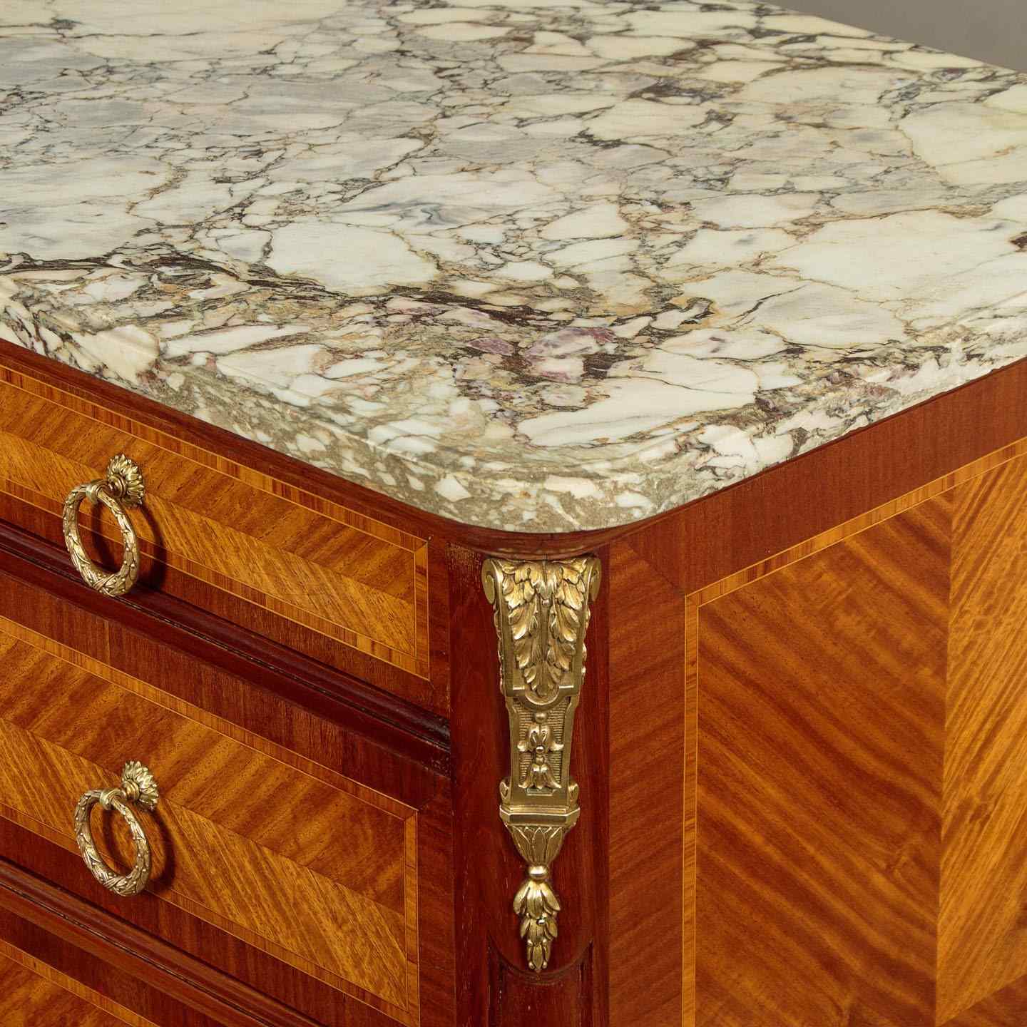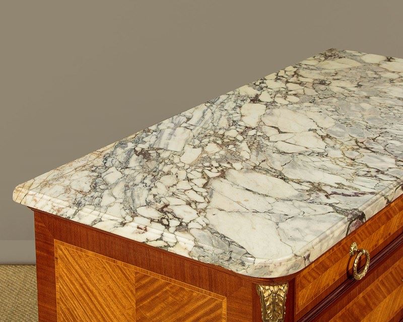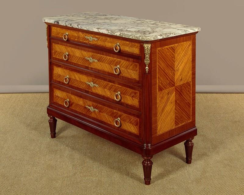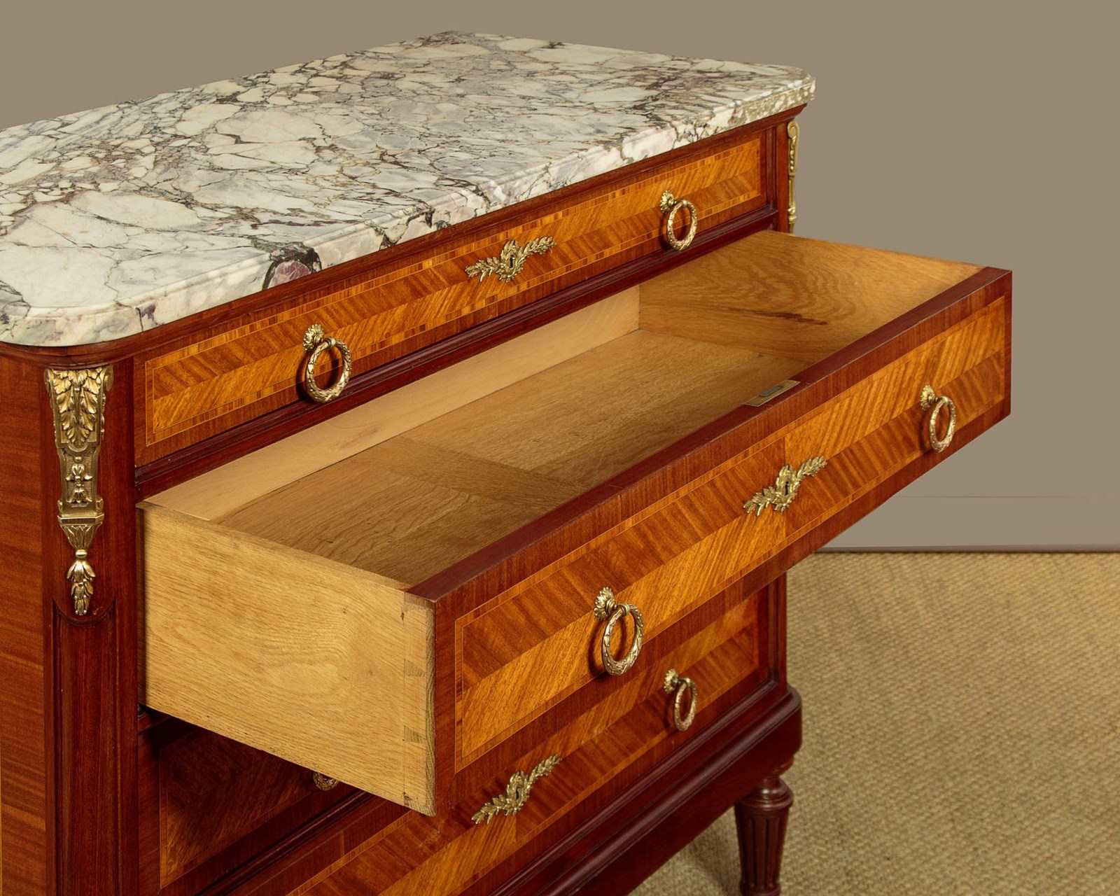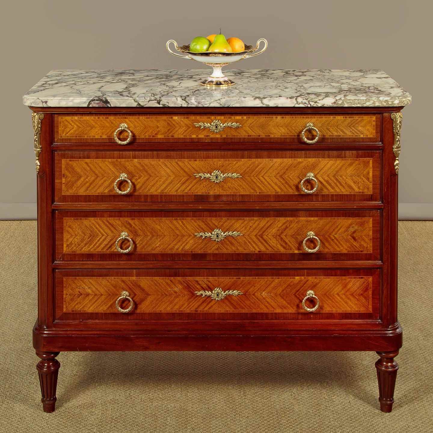 Very smart French Louis XVI style marble top commode or chest of drawers c.1960. Superb marble top with pronounced grey and purple figuring, rounded front corners and a moulded edge. Over a chest of four drawers. Sparkling tulipwood veneers arranged in a symmetrical pattern on the drawer fronts with inlaid stringing and mahogany crossbanding. Quality gilded brass laurel wreath ring handles and escutcheons. Gilded brass mounts to the shoulders. Cabinet ends veneered to match. Raised on short mahogany tapering, turned and fluted legs front and rear. Oak drawer linings and back. Excellent colour and condition, cleaned and waxed in our workshops.