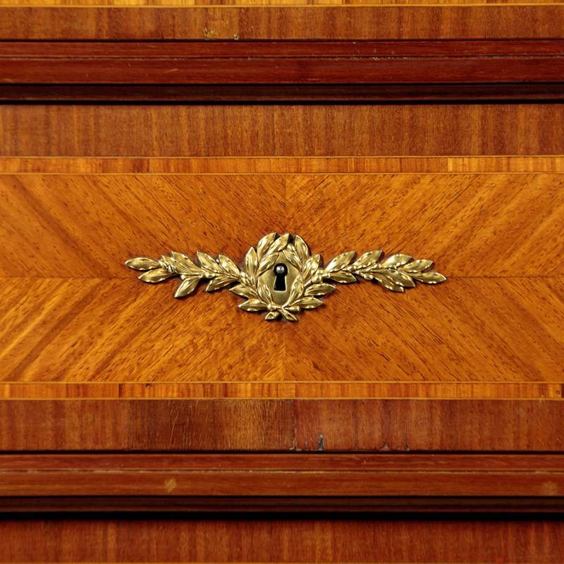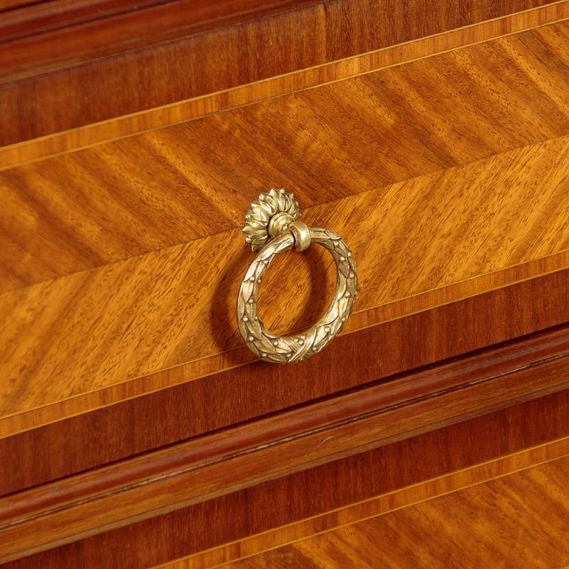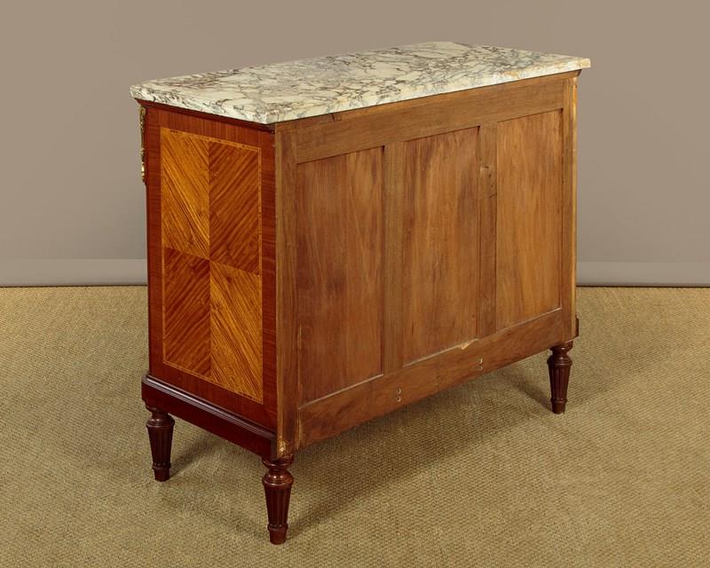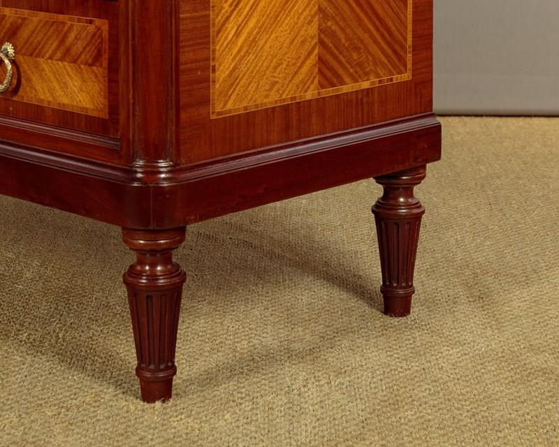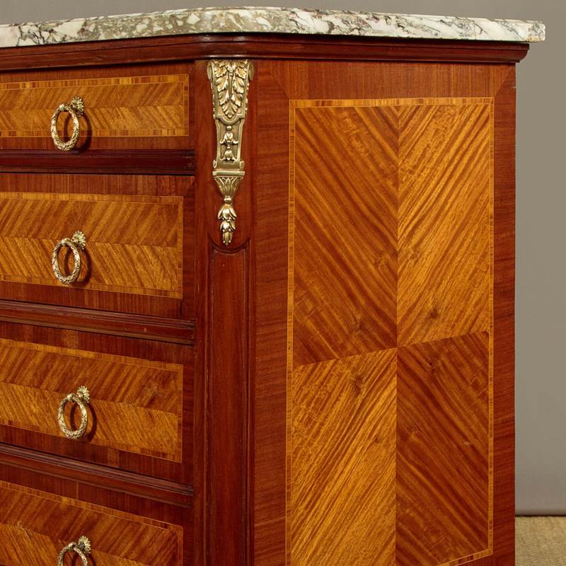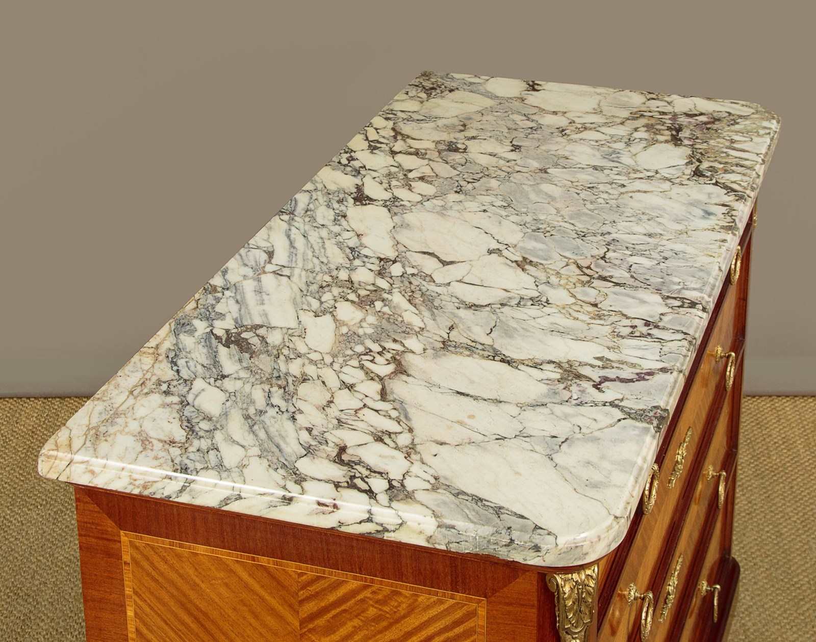 Very smart French Louis XVI style marble top commode or chest of drawers c.1960. Superb marble top with pronounced grey and purple figuring, rounded front corners and a moulded edge. Over a chest of four drawers. Sparkling tulipwood veneers arranged in a symmetrical pattern on the drawer fronts with inlaid stringing and mahogany crossbanding. Quality gilded brass laurel wreath ring handles and escutcheons. Gilded brass mounts to the shoulders. Cabinet ends veneered to match. Raised on short mahogany tapering, turned and fluted legs front and rear. Oak drawer linings and back. Excellent colour and condition, cleaned and waxed in our workshops.