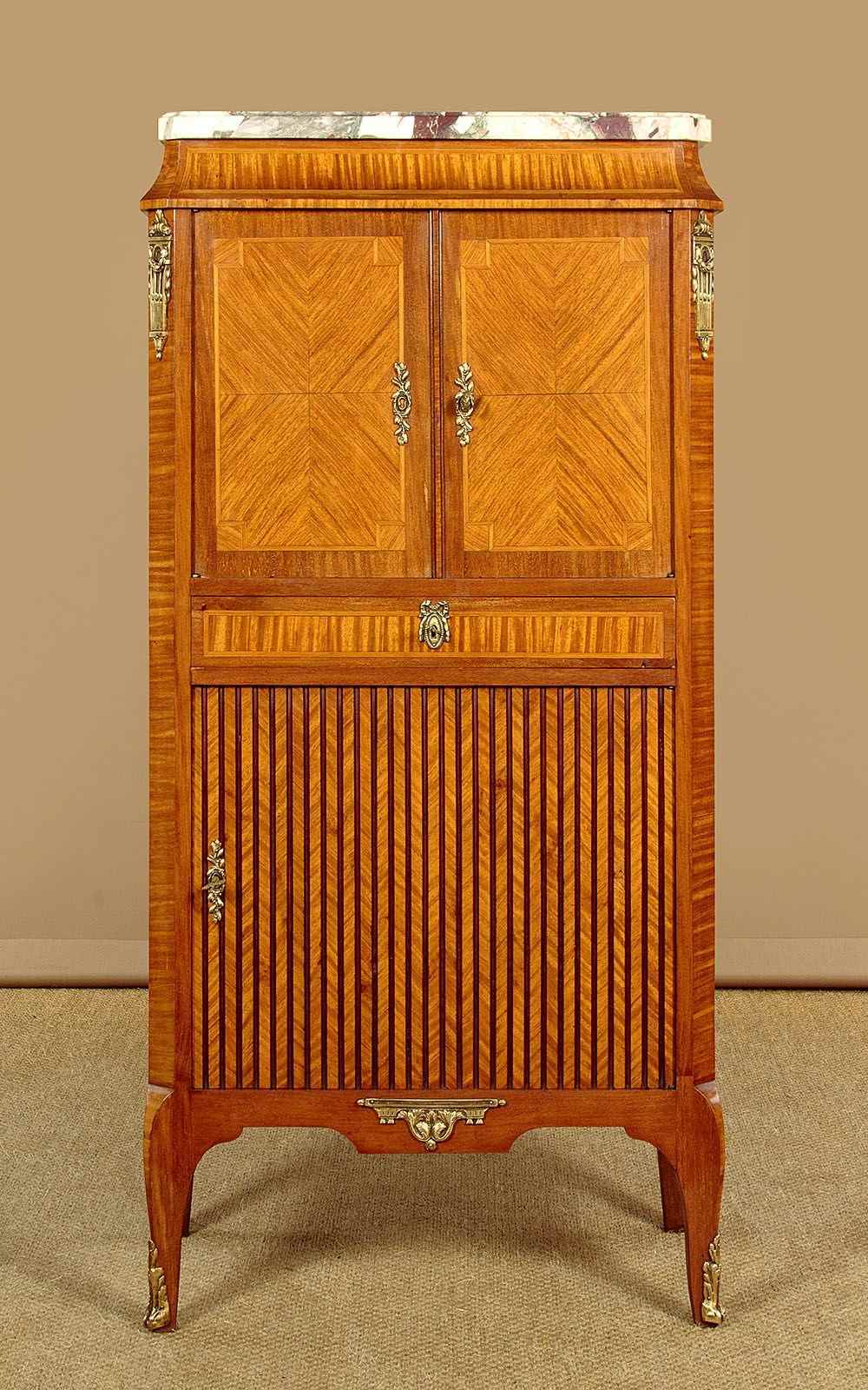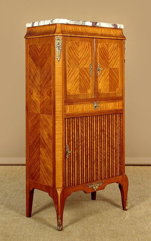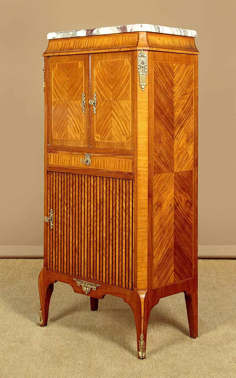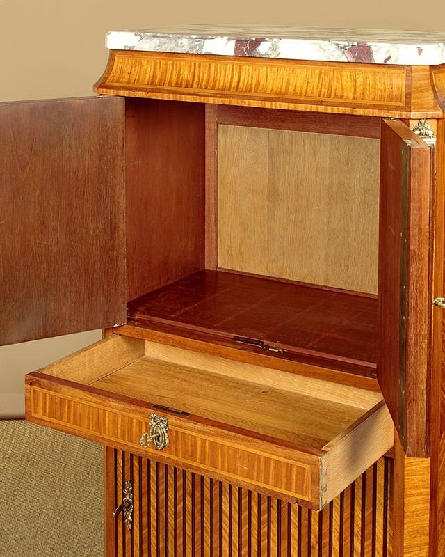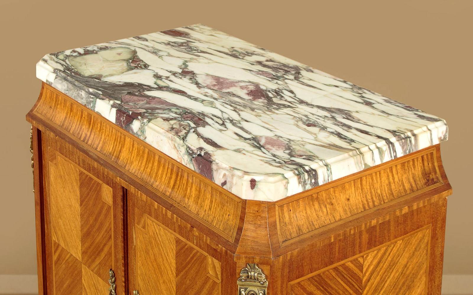 Very smart early 20th.c. French Louis XVI style side cabinet c.1930. Highly figured 1¼" thick marble top with canted corners and a moulded edge. Over a two door cabinet (internal depth 12"), a single drawer and a single door cabinet in the base fitted with a shelf inside. Bright tulipwood veneers arranged in a crossbanded and symmetrical pattern across the front and sides, with inlaid borders and decorative brass mounts and escutcheons. Note the vertical moulding on the lower door to resemble the slats of a tambour. Shaped apron with a brass mount at the centre and shaped front legs with a crossbanded edge brass mounts to the feet. Superior quality with solid mahogany groundwork, oak drawer linings and back panels. Excellent colour and condition, keys supplied for all three locks.