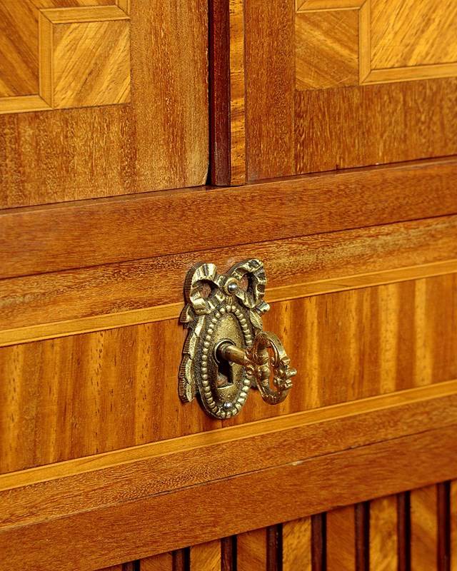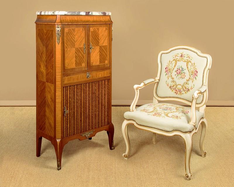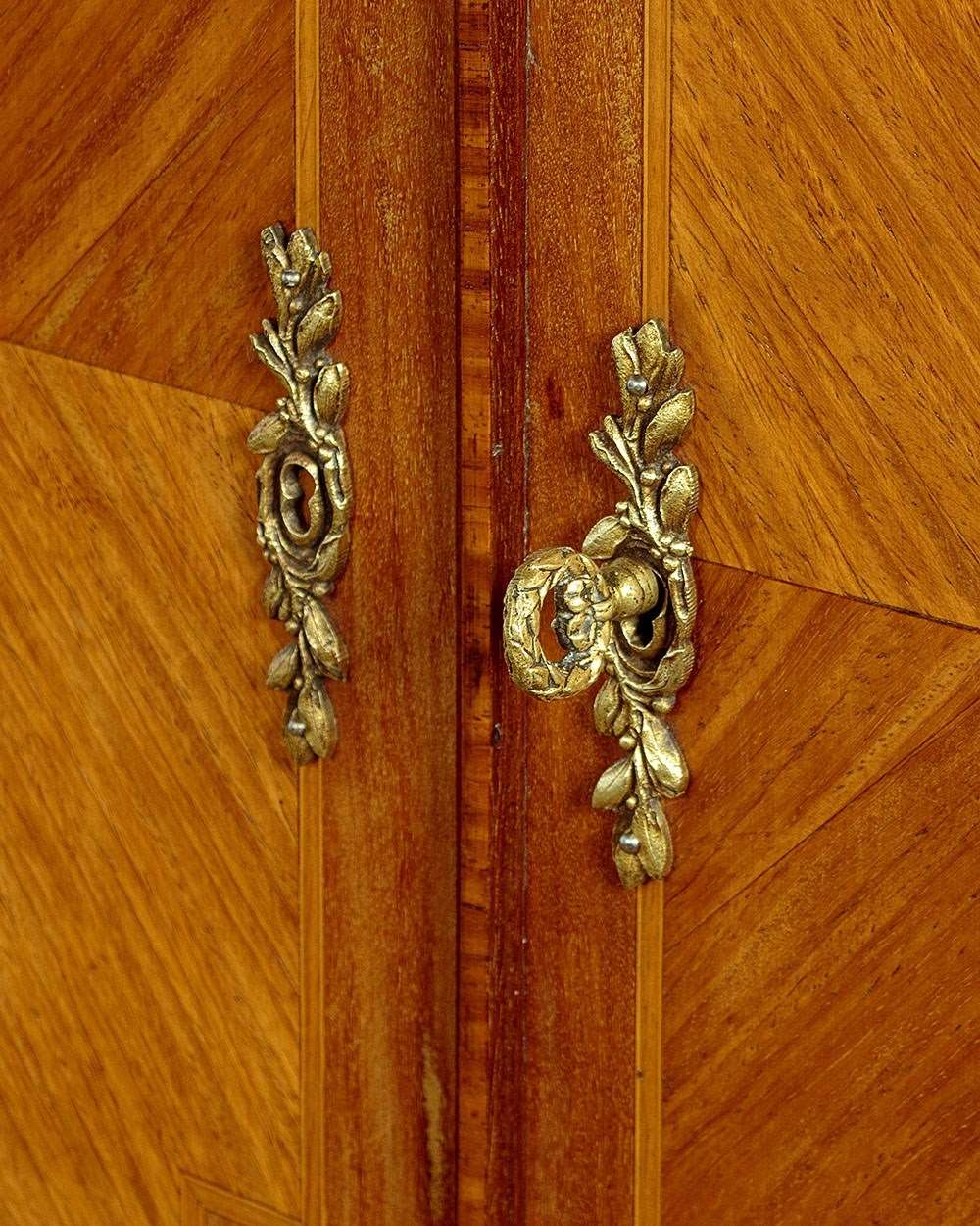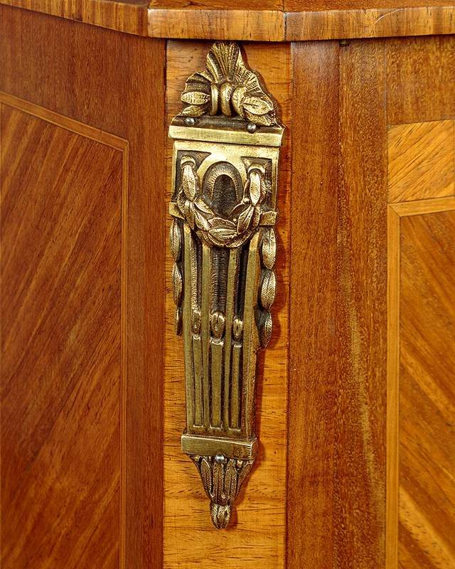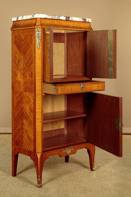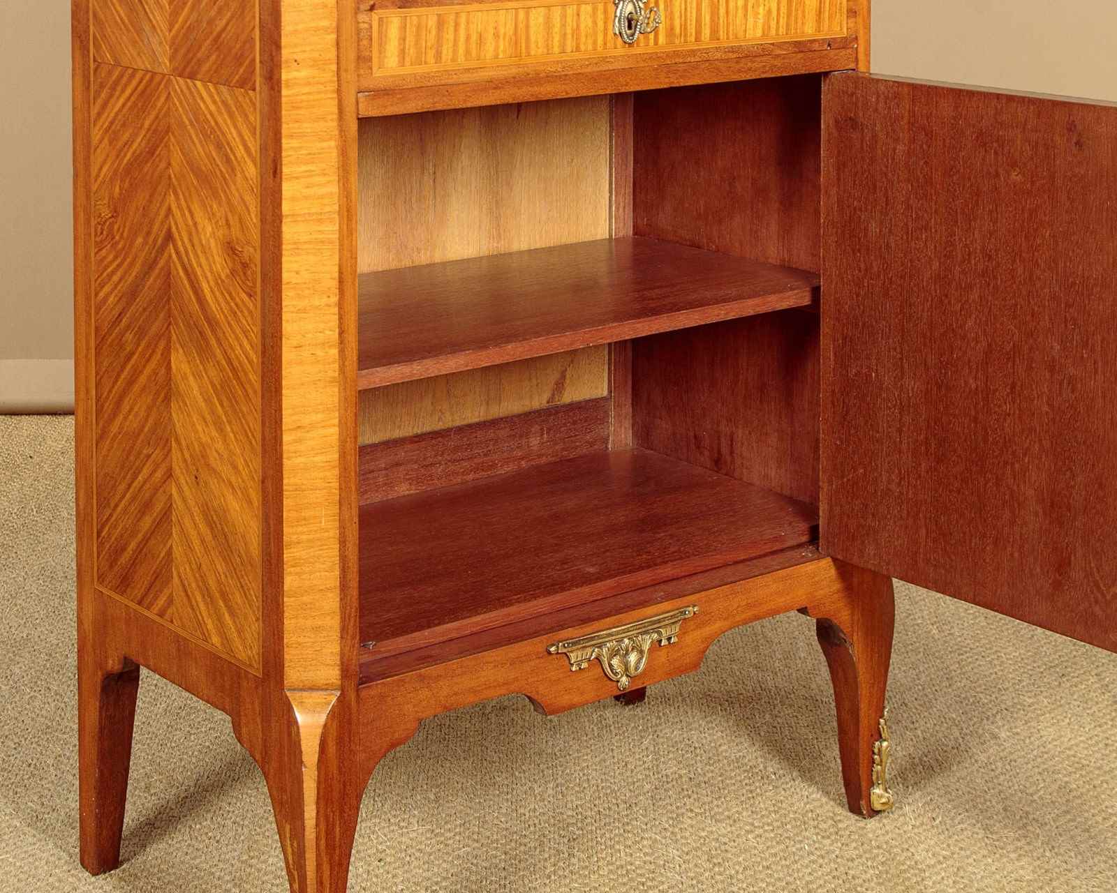 Very smart early 20th.c. French Louis XVI style side cabinet c.1930. Highly figured 1¼" thick marble top with canted corners and a moulded edge. Over a two door cabinet (internal depth 12"), a single drawer and a single door cabinet in the base fitted with a shelf inside. Bright tulipwood veneers arranged in a crossbanded and symmetrical pattern across the front and sides, with inlaid borders and decorative brass mounts and escutcheons. Note the vertical moulding on the lower door to resemble the slats of a tambour. Shaped apron with a brass mount at the centre and shaped front legs with a crossbanded edge brass mounts to the feet. Superior quality with solid mahogany groundwork, oak drawer linings and back panels. Excellent colour and condition, keys supplied for all three locks.