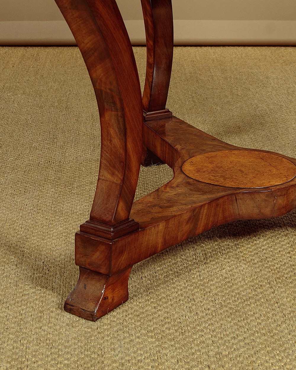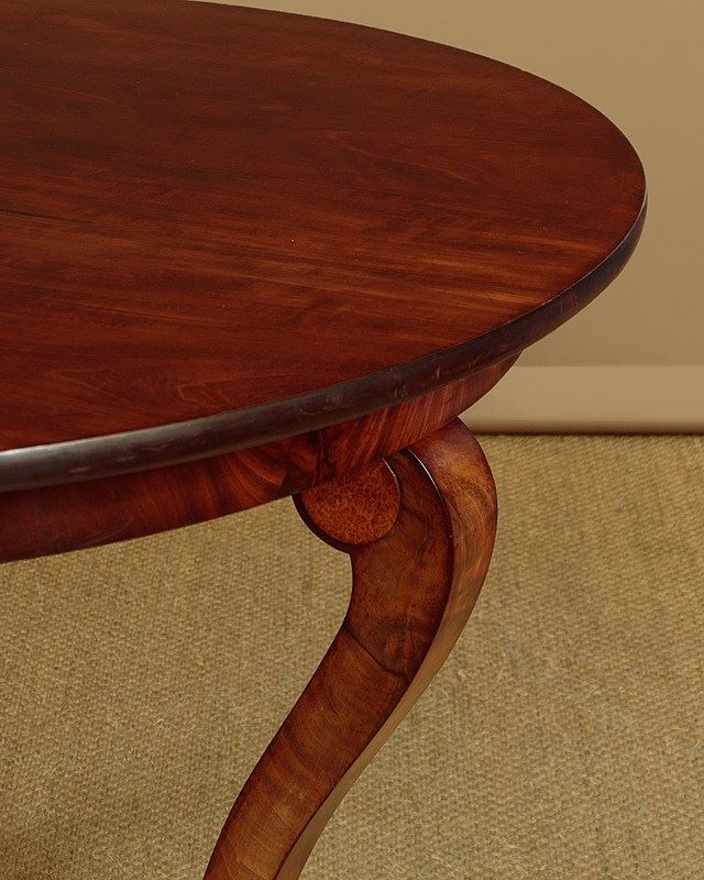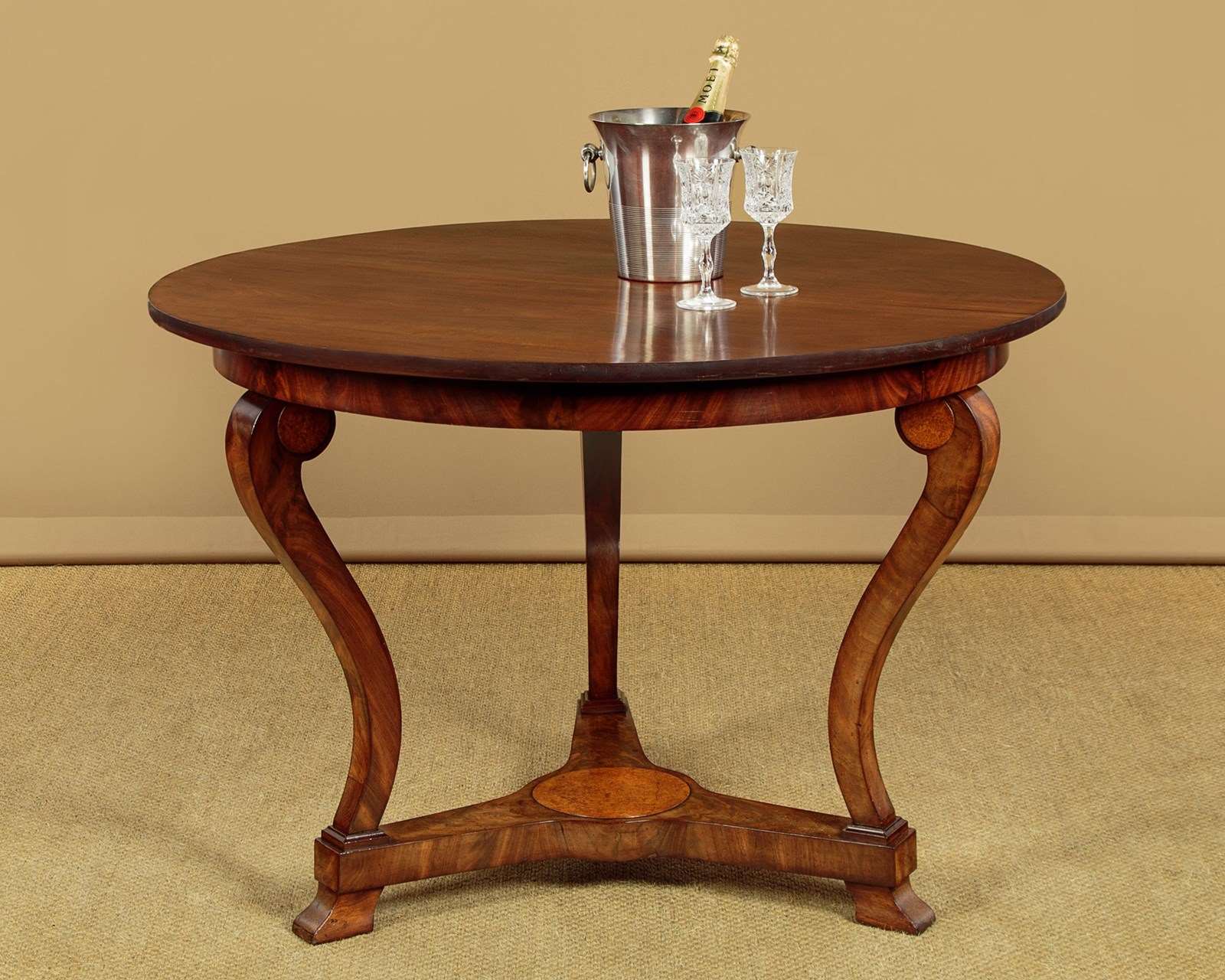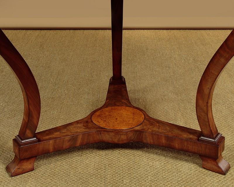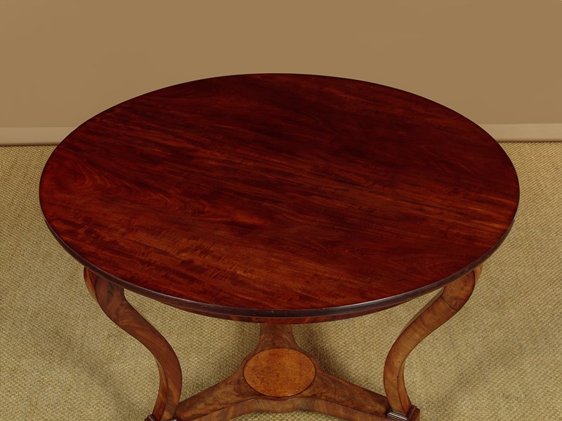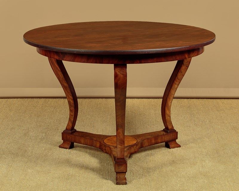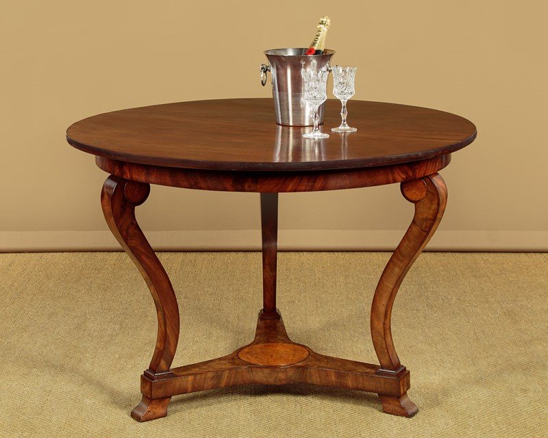 Very elegant French mahogany centre table c.1860. 44½" diameter top made from two solid mahogany boards. Over a shallow mahogany veneered apron with oak groundwork. Raised on three swept and tapering legs with amboyna burr veneered roundels at the tops. Joined with a tricorn plinth stretcher, veneered to match and also with oak groundwork, raised on moulded feet. Excellent colour and condition, cleaned and waxed in our workshops.
