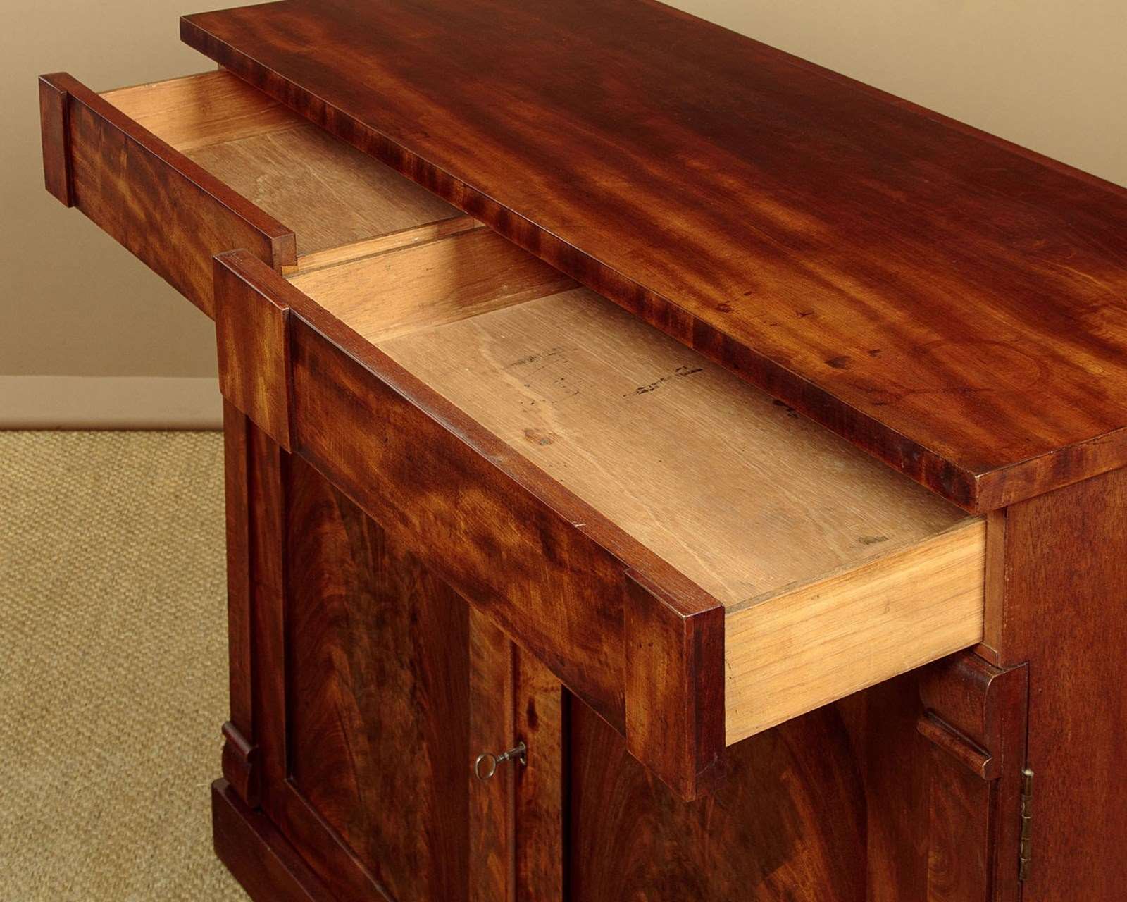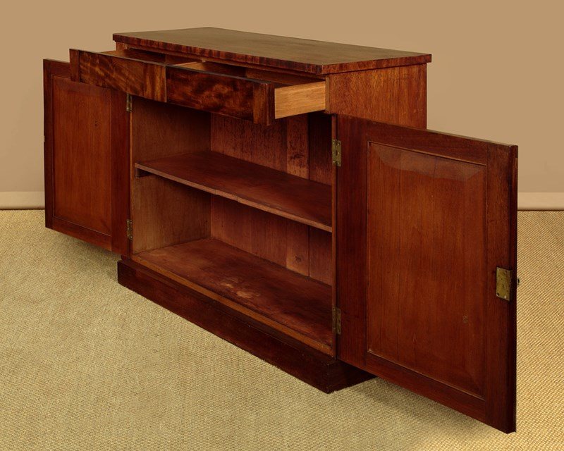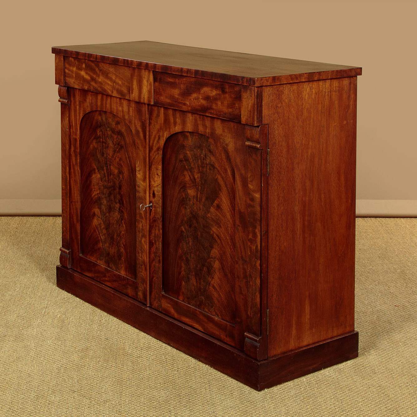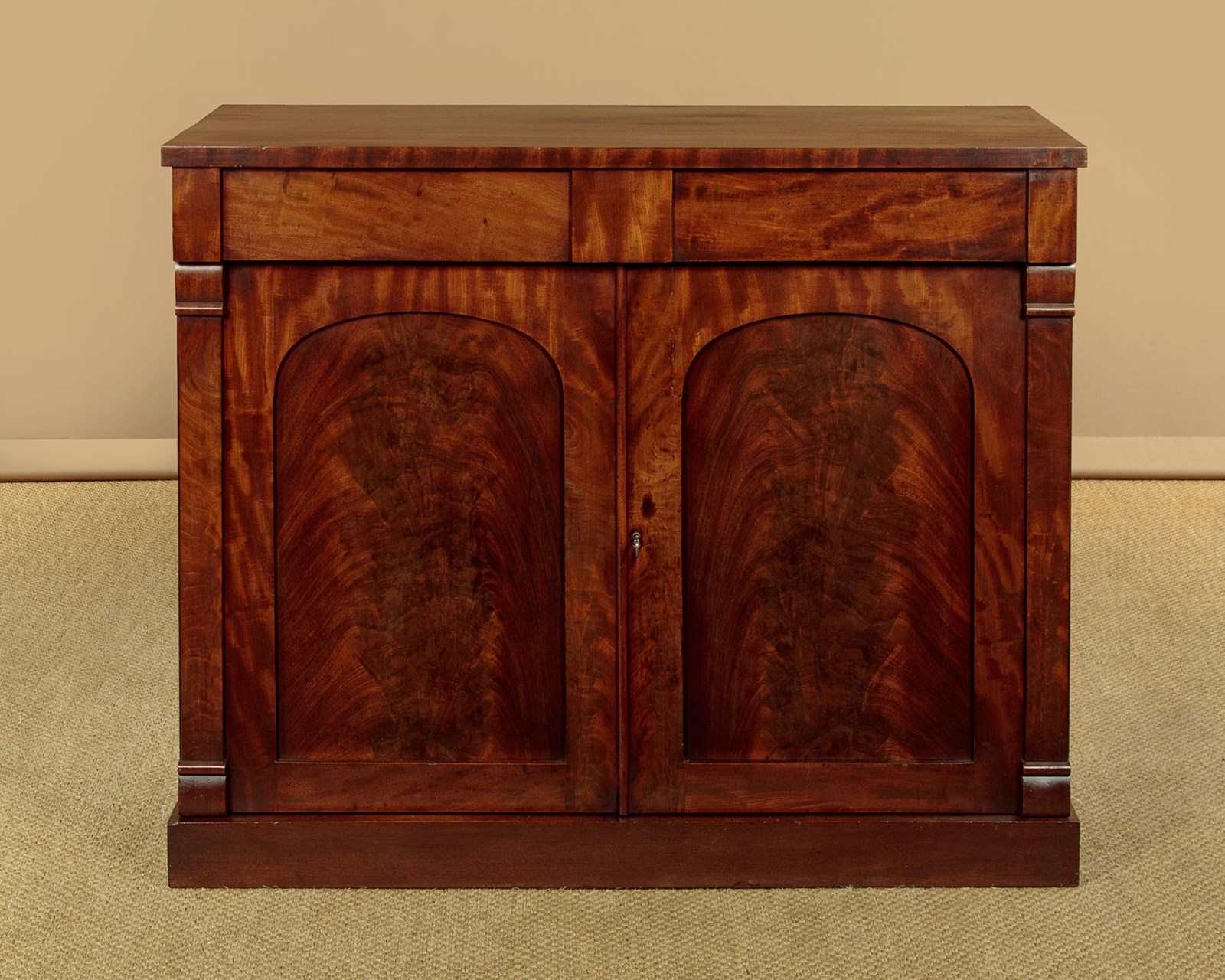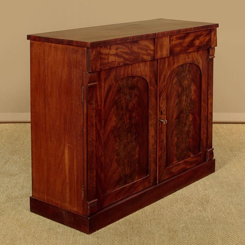 Useful mid 19th.c. mahogany chiffonier side cabinet c.1860. Flame mahogany veneered top with a crossbanded edge. Over two drawers and a two door cupboard base fitted with a single shelf inside (internal depth 13½"). With little applied decoration save for the flame mahogany veneered door panels flanked with flat column pilasters. Raised on a square plinth. Solid mahogany sides and drawer linings. Patched repairs to the top, otherwise excellent colour and condition, cleaned and waxed in our workshops. Key supplied.