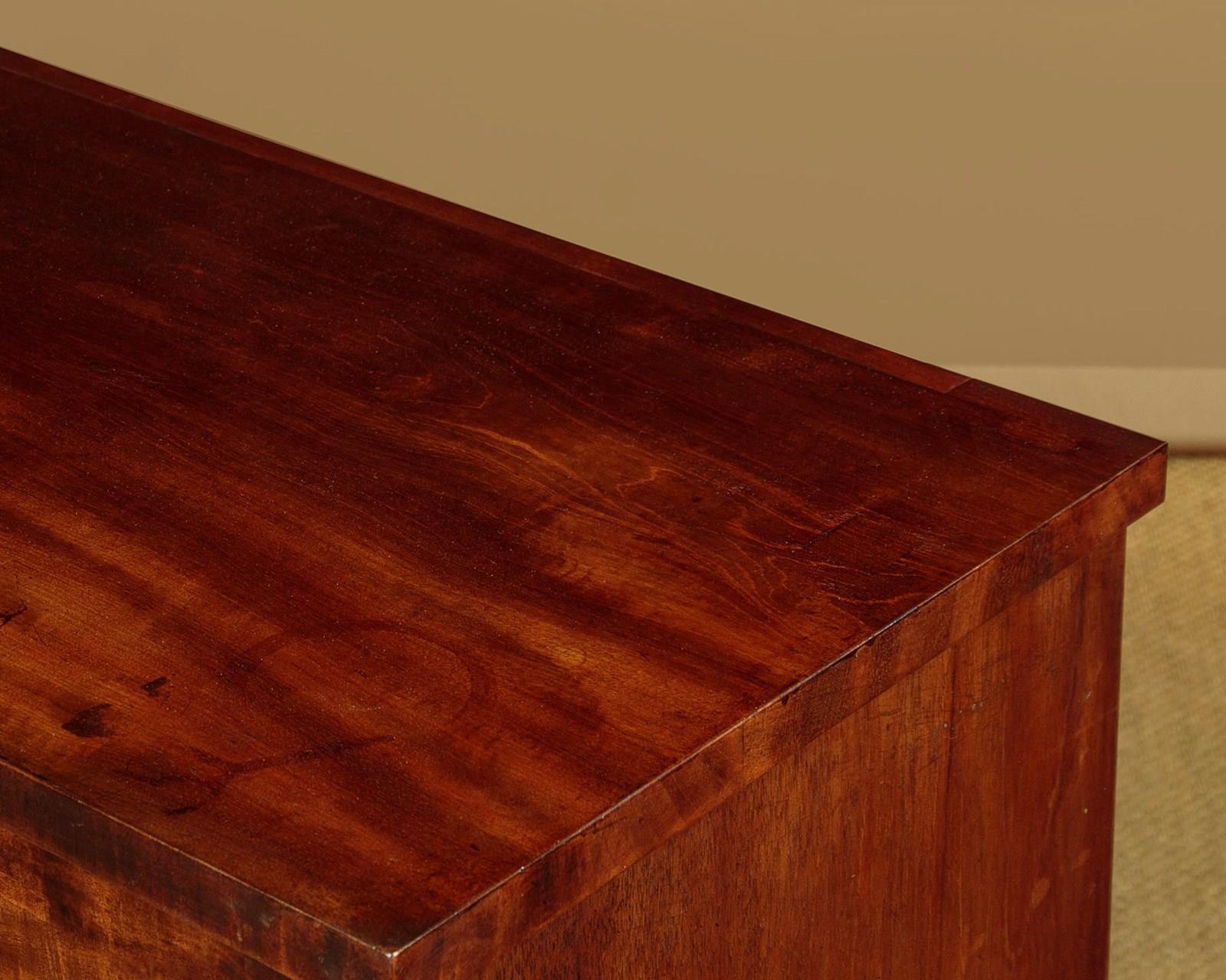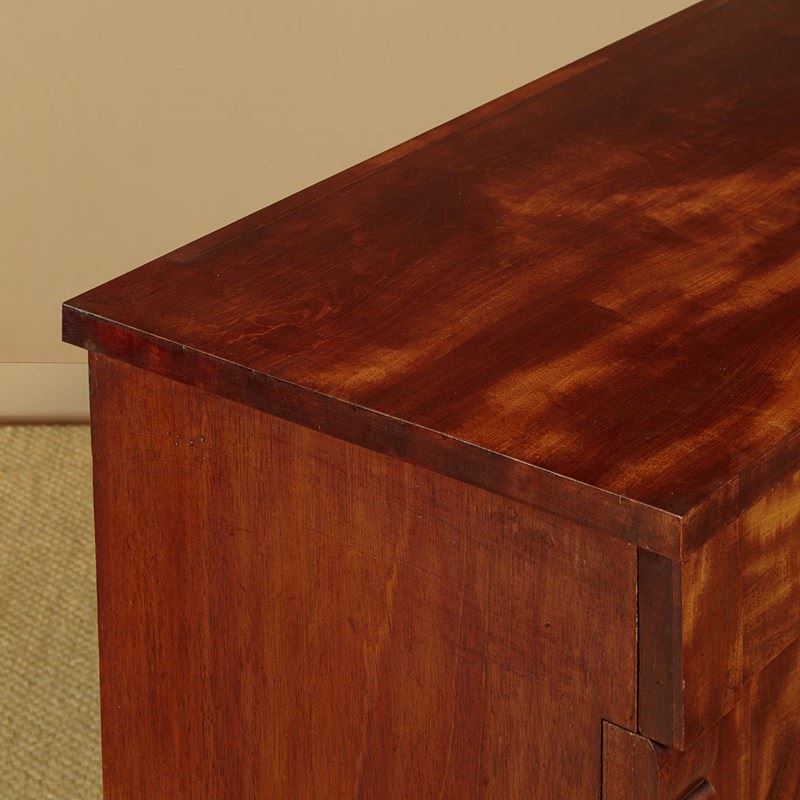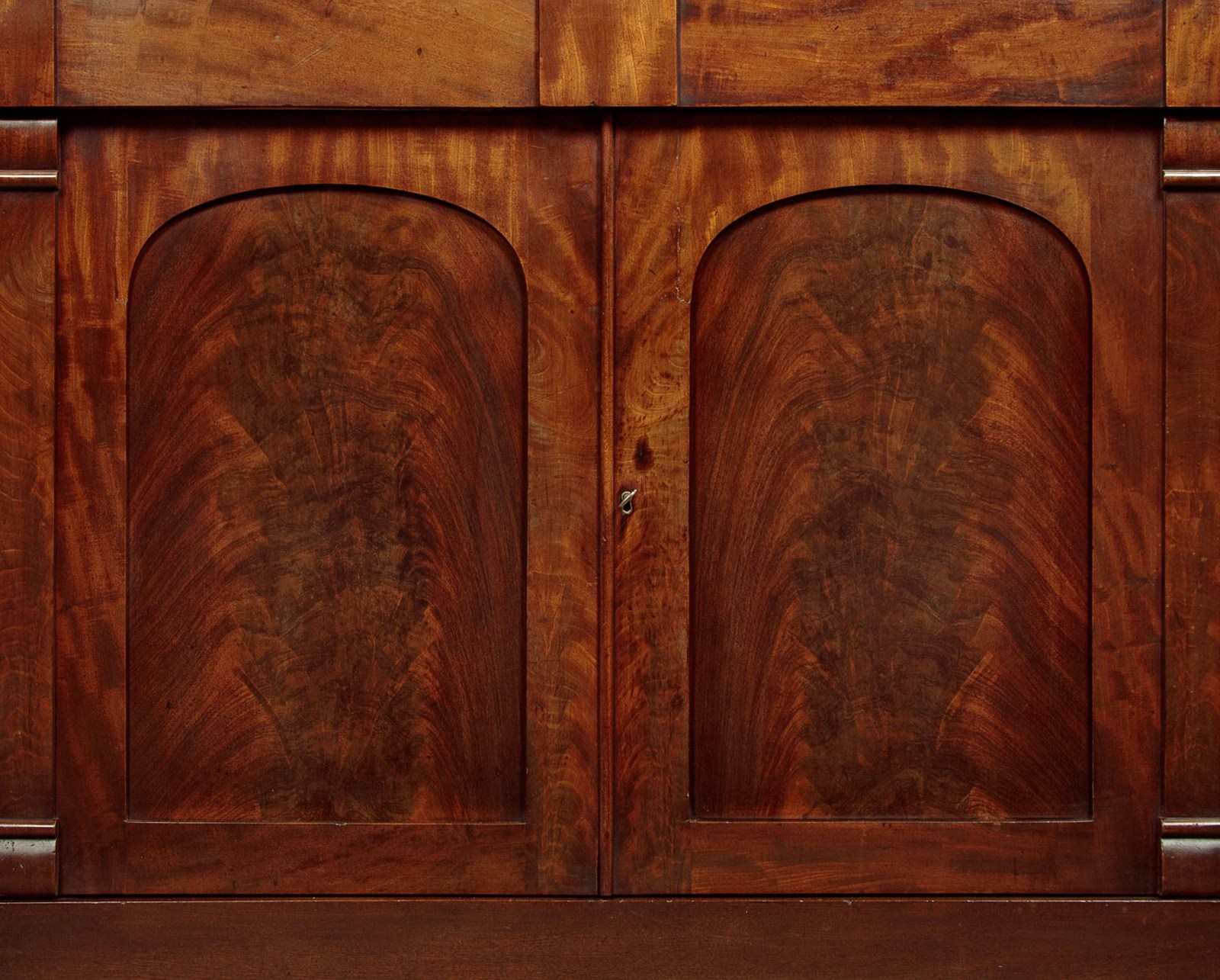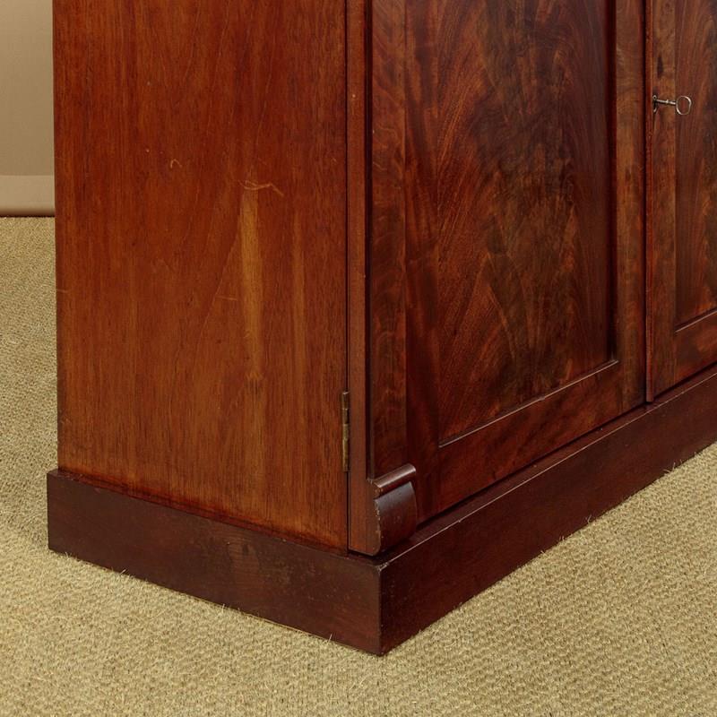 Useful mid 19th.c. mahogany chiffonier side cabinet c.1860. Flame mahogany veneered top with a crossbanded edge. Over two drawers and a two door cupboard base fitted with a single shelf inside (internal depth 13½"). With little applied decoration save for the flame mahogany veneered door panels flanked with flat column pilasters. Raised on a square plinth. Solid mahogany sides and drawer linings. Patched repairs to the top, otherwise excellent colour and condition, cleaned and waxed in our workshops. Key supplied.