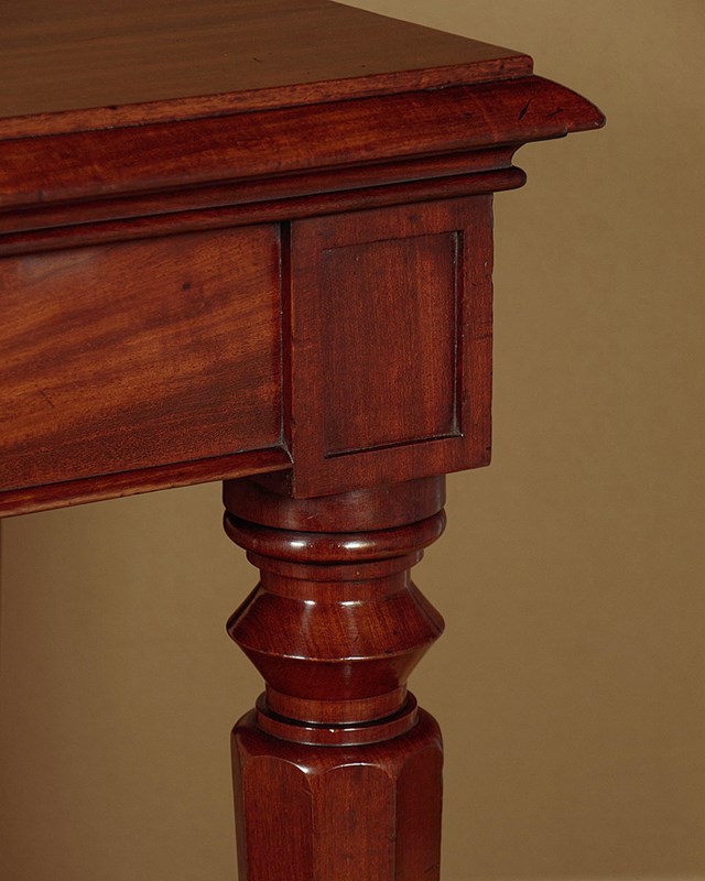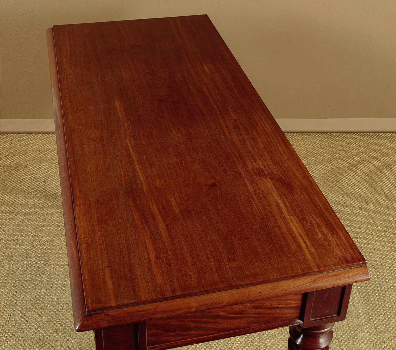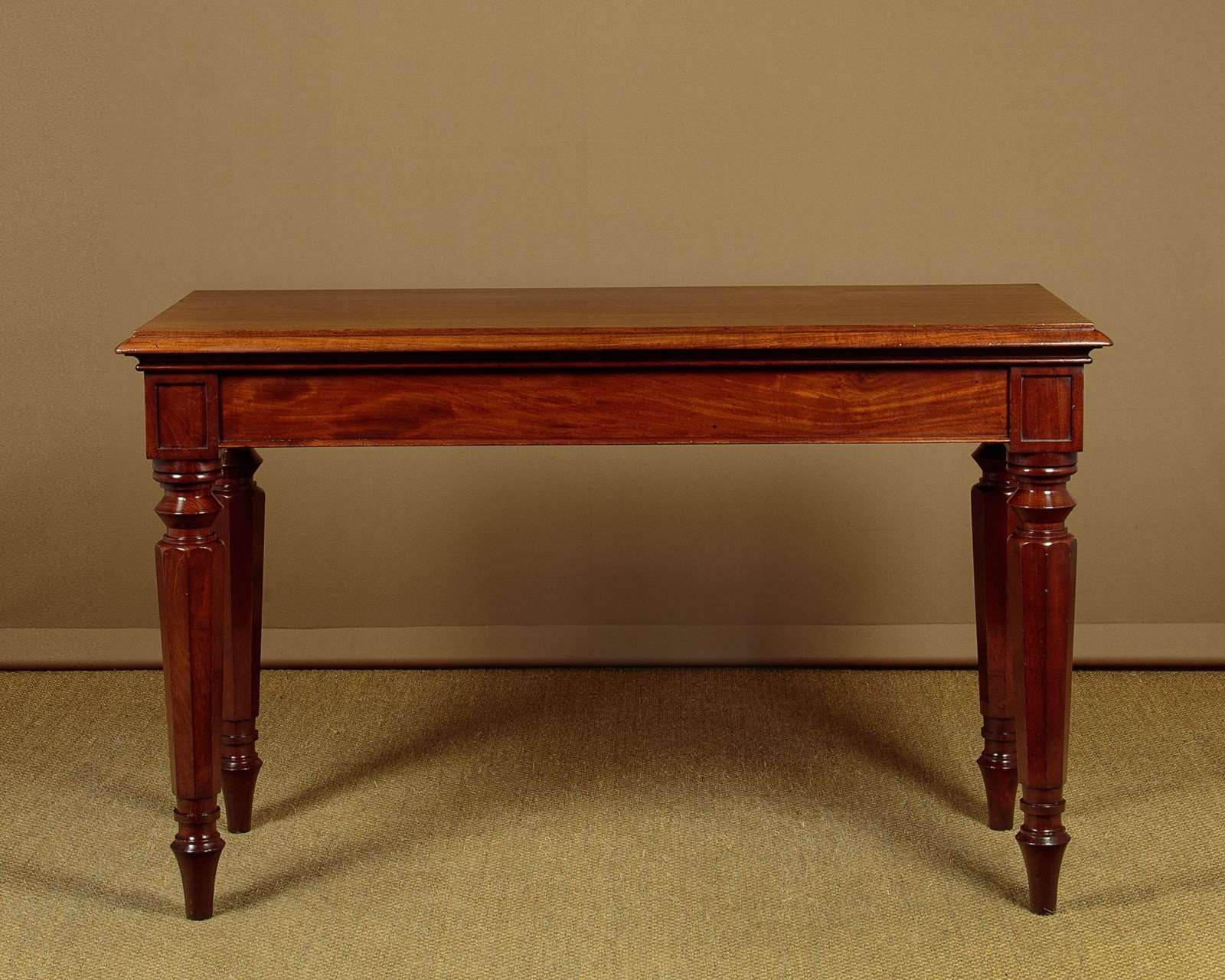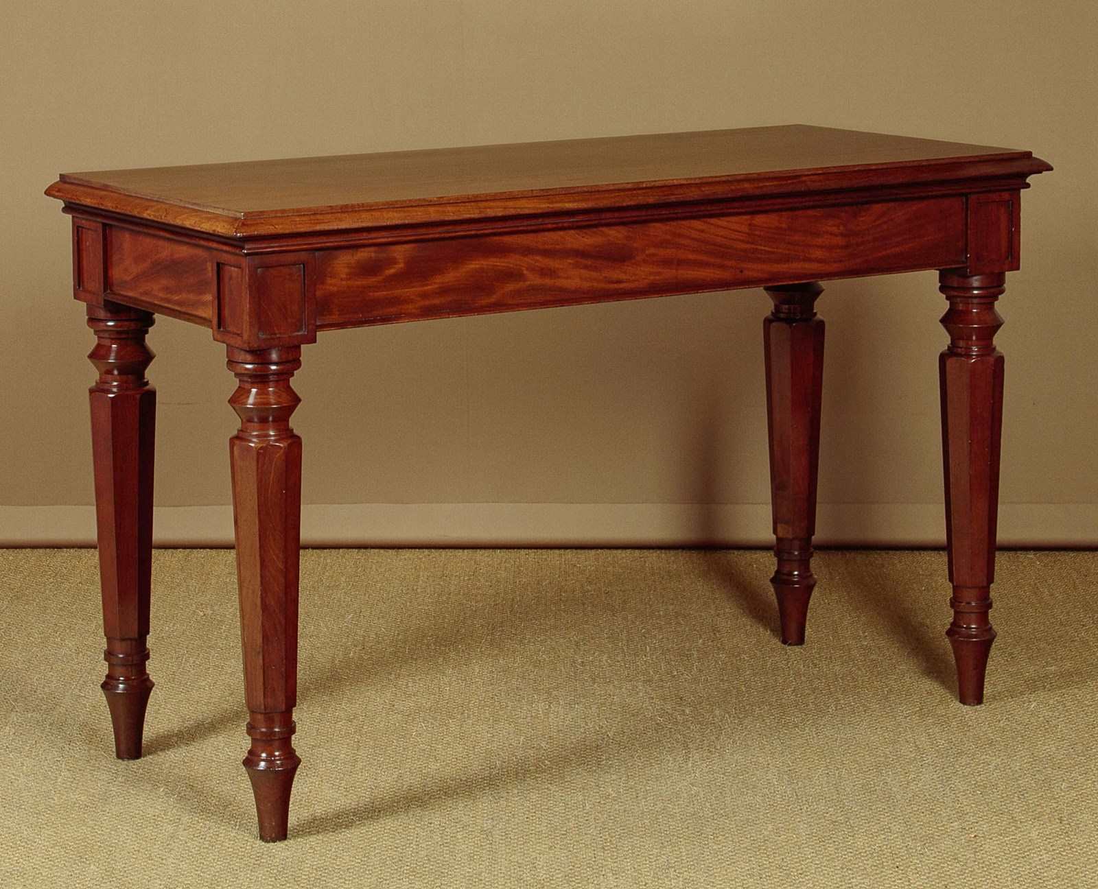 Splendid large 19th.c. mahogany console table c.1840. Single piece solid mahogany top with a deep applied edge moulding. Over a veneered apron to the front and sides with moulded corners. Raised on large tapering octagonal legs with turned tops and feet. Excellent colour and condition, cleaned and waxed in our workshops.