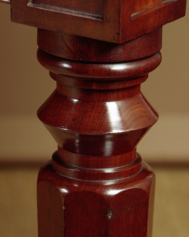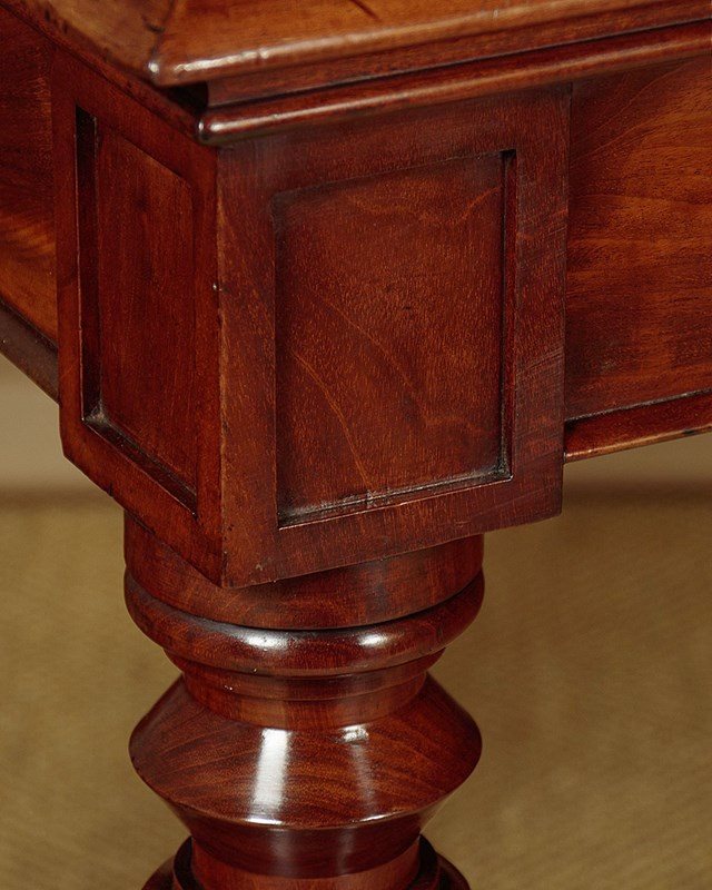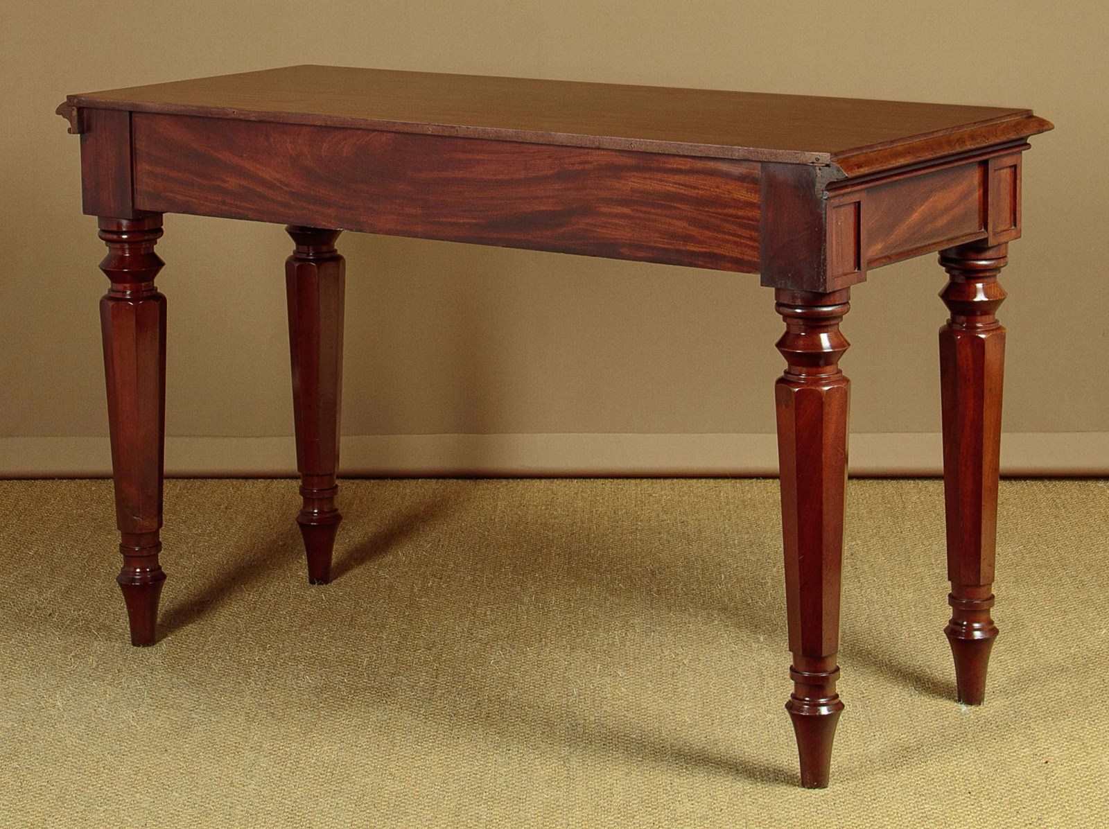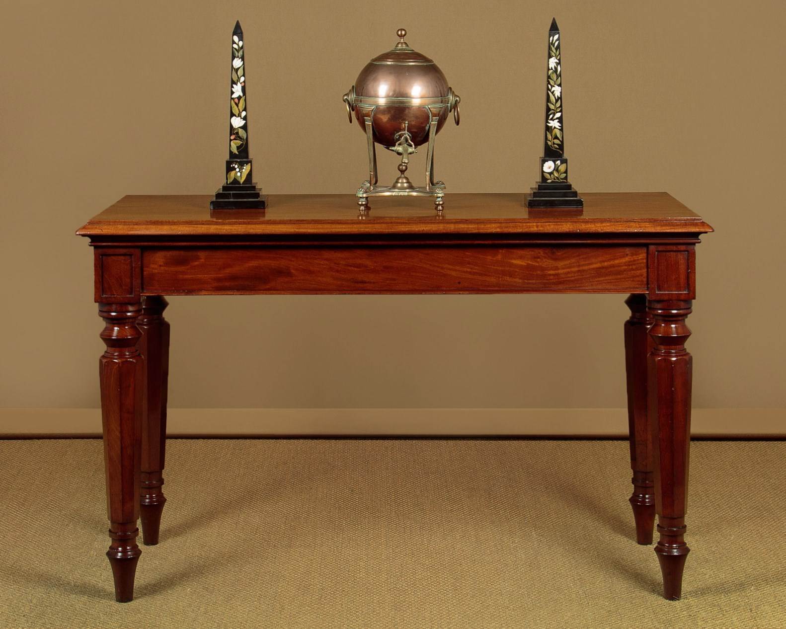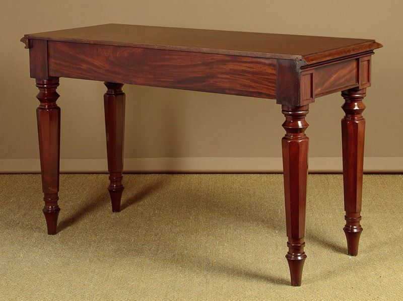 Splendid large 19th.c. mahogany console table c.1840. Single piece solid mahogany top with a deep applied edge moulding. Over a veneered apron to the front and sides with moulded corners. Raised on large tapering octagonal legs with turned tops and feet. Excellent colour and condition, cleaned and waxed in our workshops.