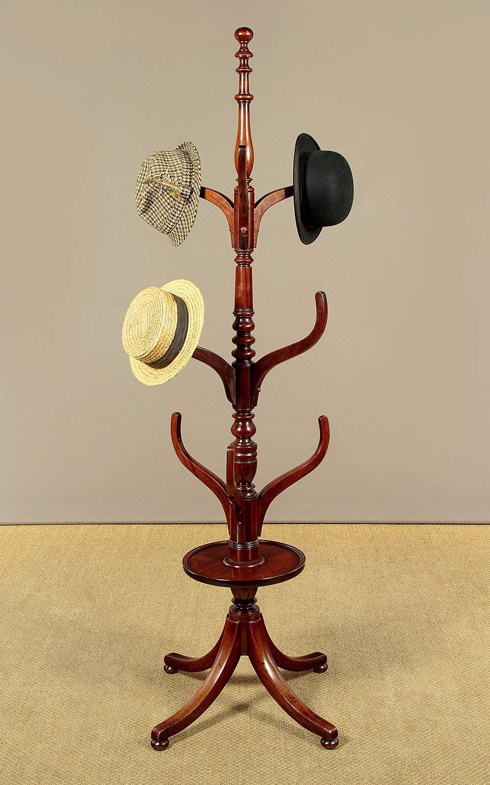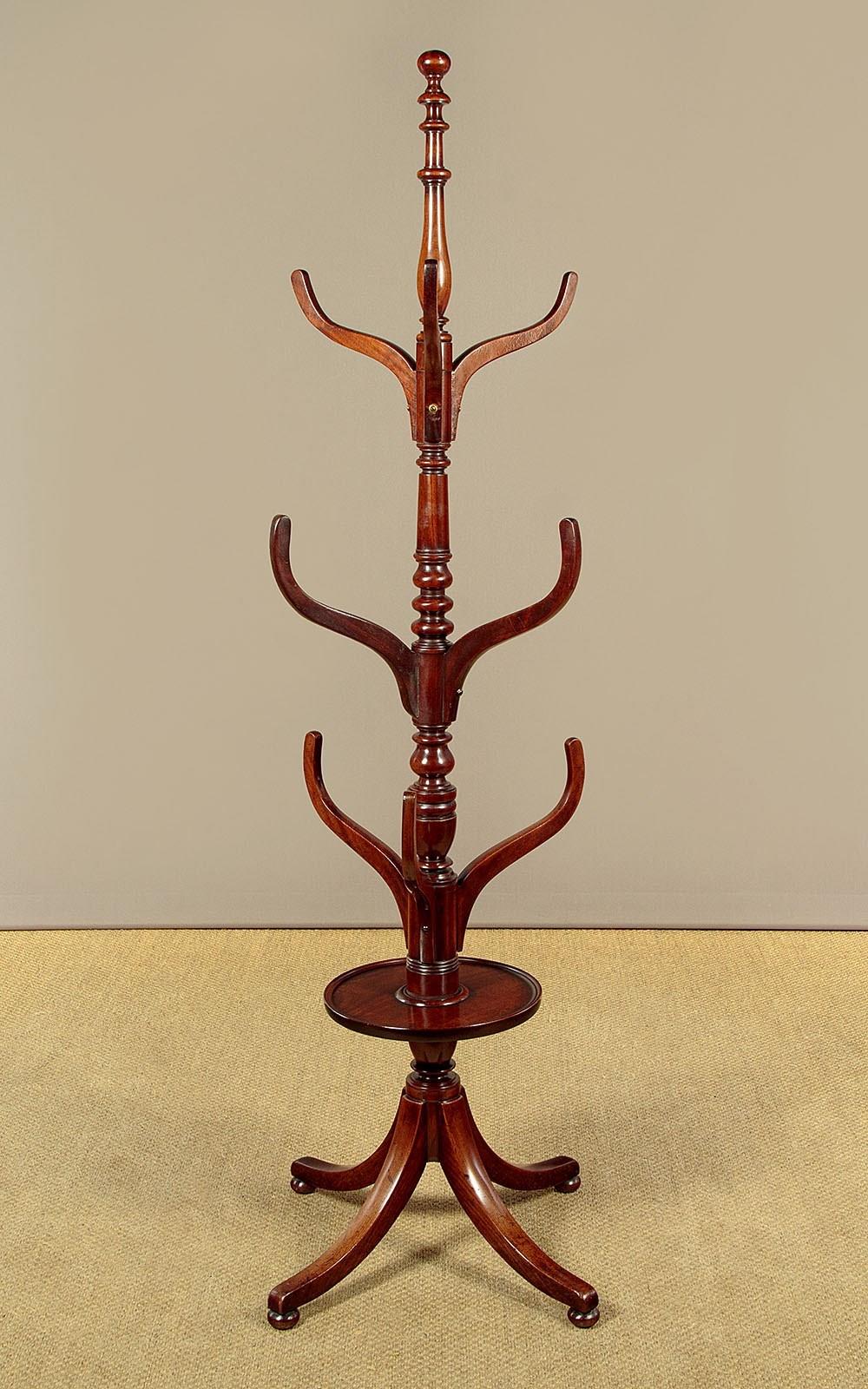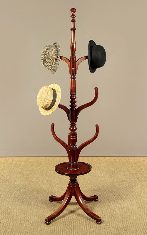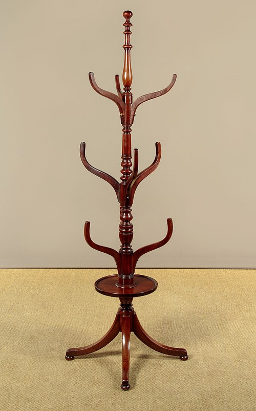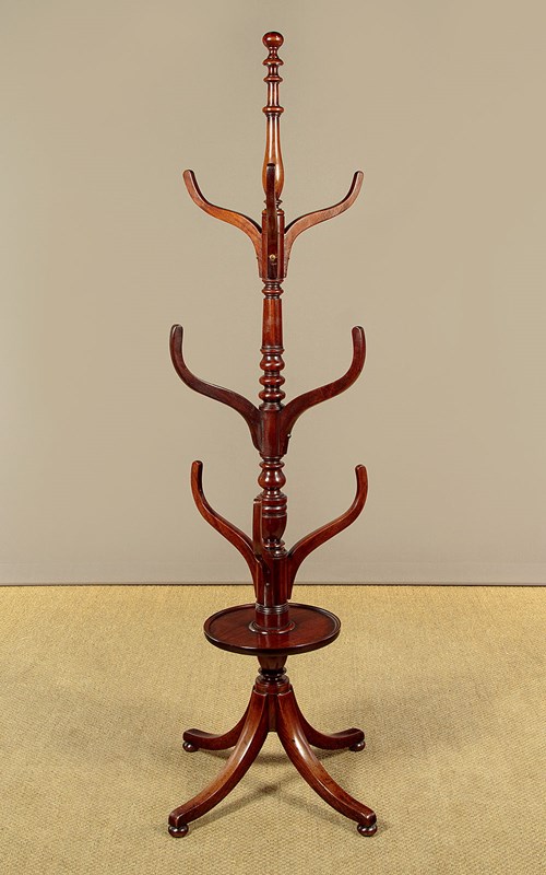 Smart 19th.c. mahogany hall tree or hat and coat stand c.1860. Nine curving branches arranged in three tiers to hold hats and coats etc over a small circular table or glove tray with a raised edge. On a crisply turned column topped with a ball finial. Four legged base raised on low bun feet. Solid mahogany throughout. Excellent colour and condition, cleaned and waxed in our workshops.