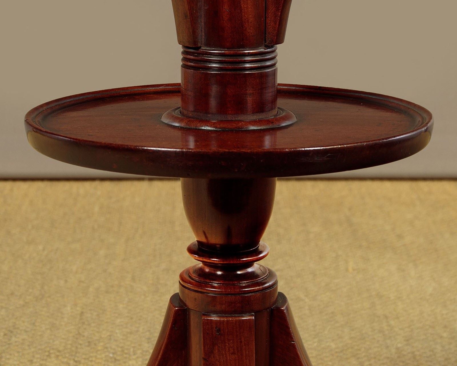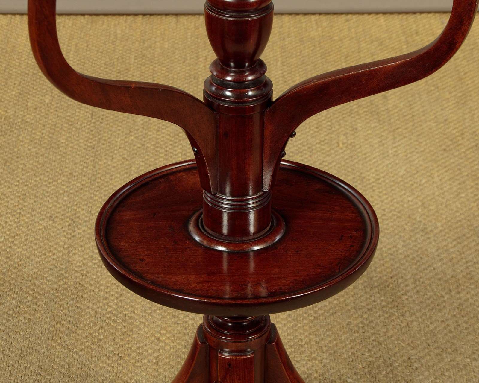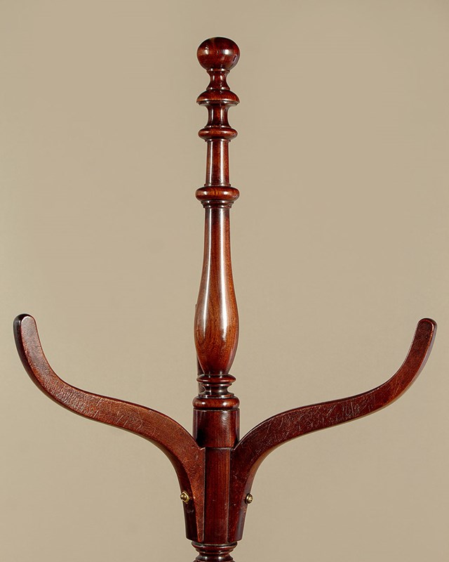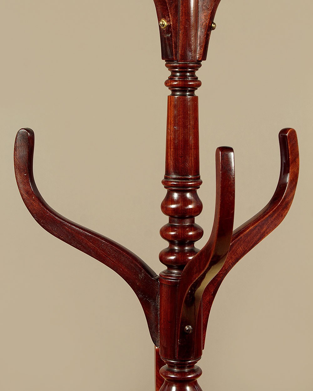 Smart 19th.c. mahogany hall tree or hat and coat stand c.1860. Nine curving branches arranged in three tiers to hold hats and coats etc over a small circular table or glove tray with a raised edge. On a crisply turned column topped with a ball finial. Four legged base raised on low bun feet. Solid mahogany throughout. Excellent colour and condition, cleaned and waxed in our workshops.