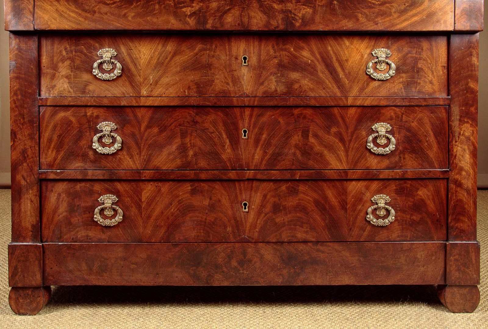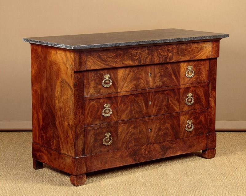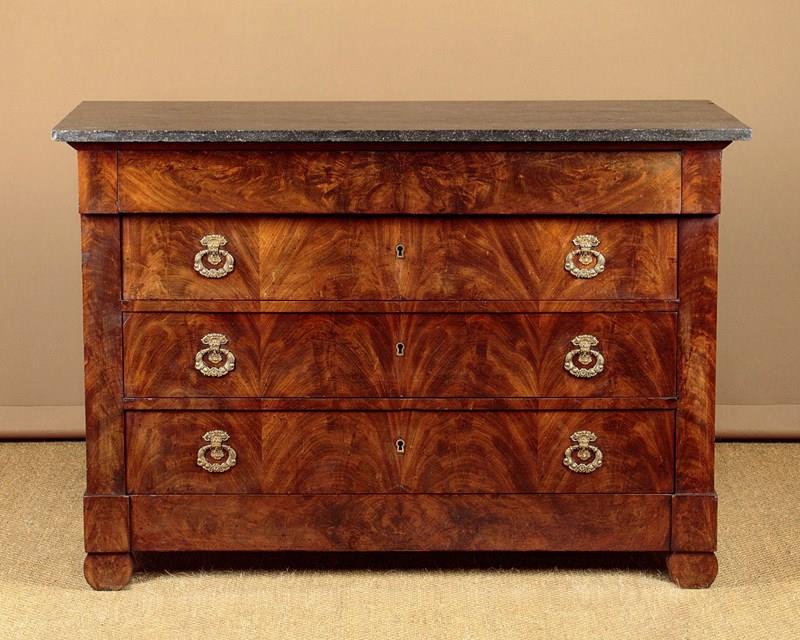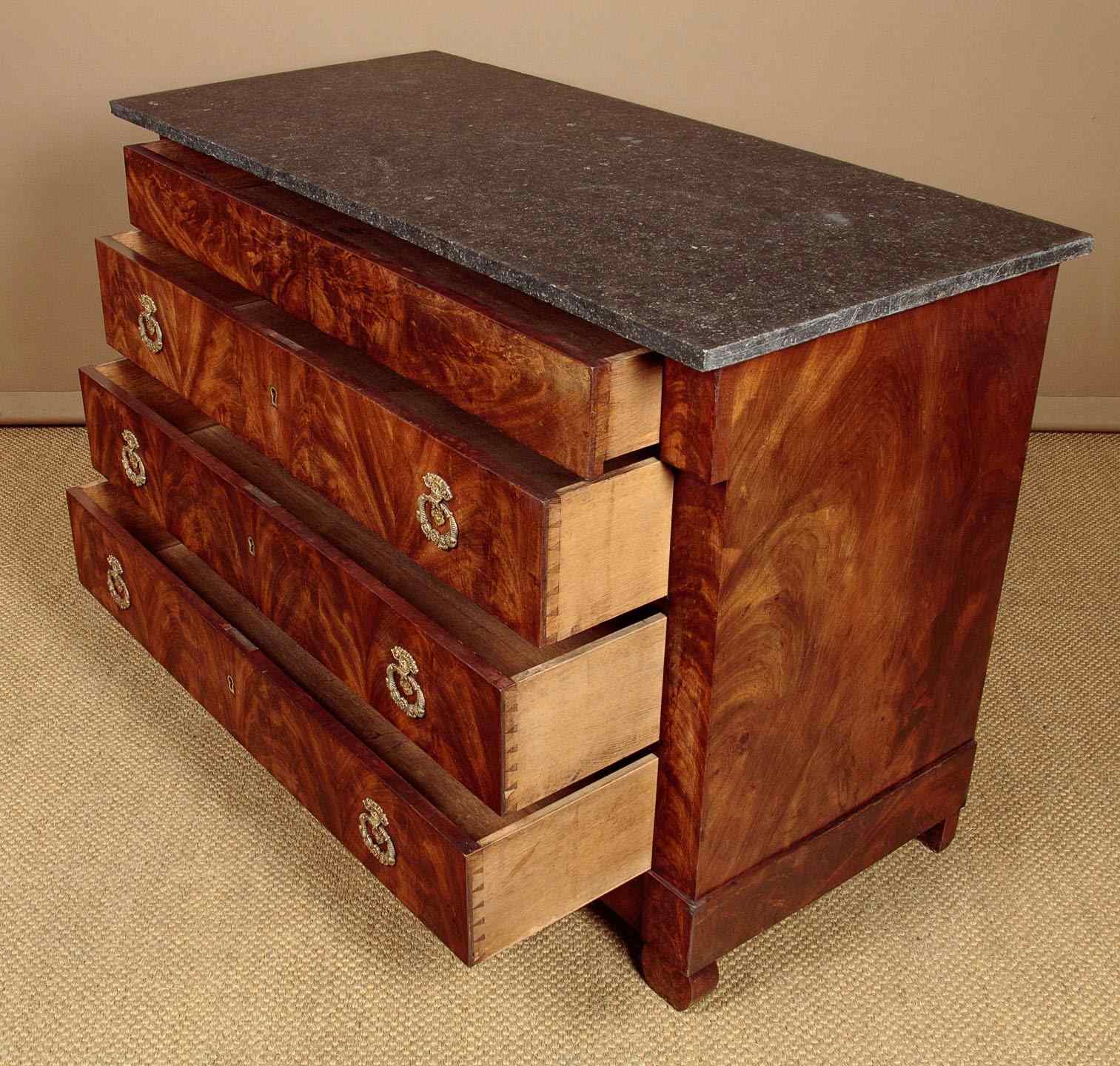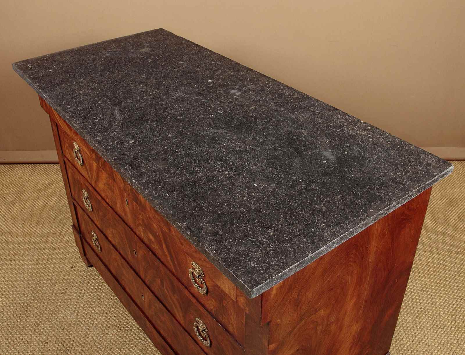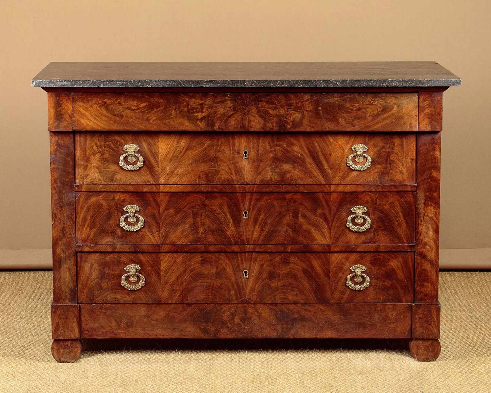 Early 19th.c. French mahogany and marble top commode chest of drawers c.1820. Black marble top with tiny white fossils embedded within. Over four long oak lined drawers. Highly figured flame mahogany veneers arranged in a striking symmetrical pattern across the front and sides. Large decorative Empire style handles to the the lower drawers (recessed hand grips in the overhanging edge of the upper drawer). On a square plinth, also veneered to match, and original feet. A good quality example of the form with oak groundwork, carcass and back panels. Some wear to the marble and minor repairs to the veneers. Generally excellent colour and condition, cleaned and waxed in our workshops.