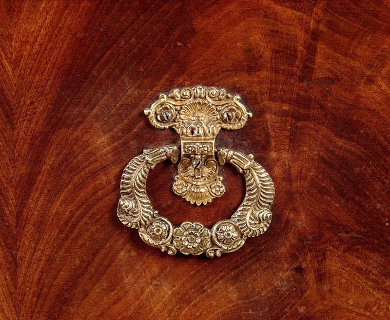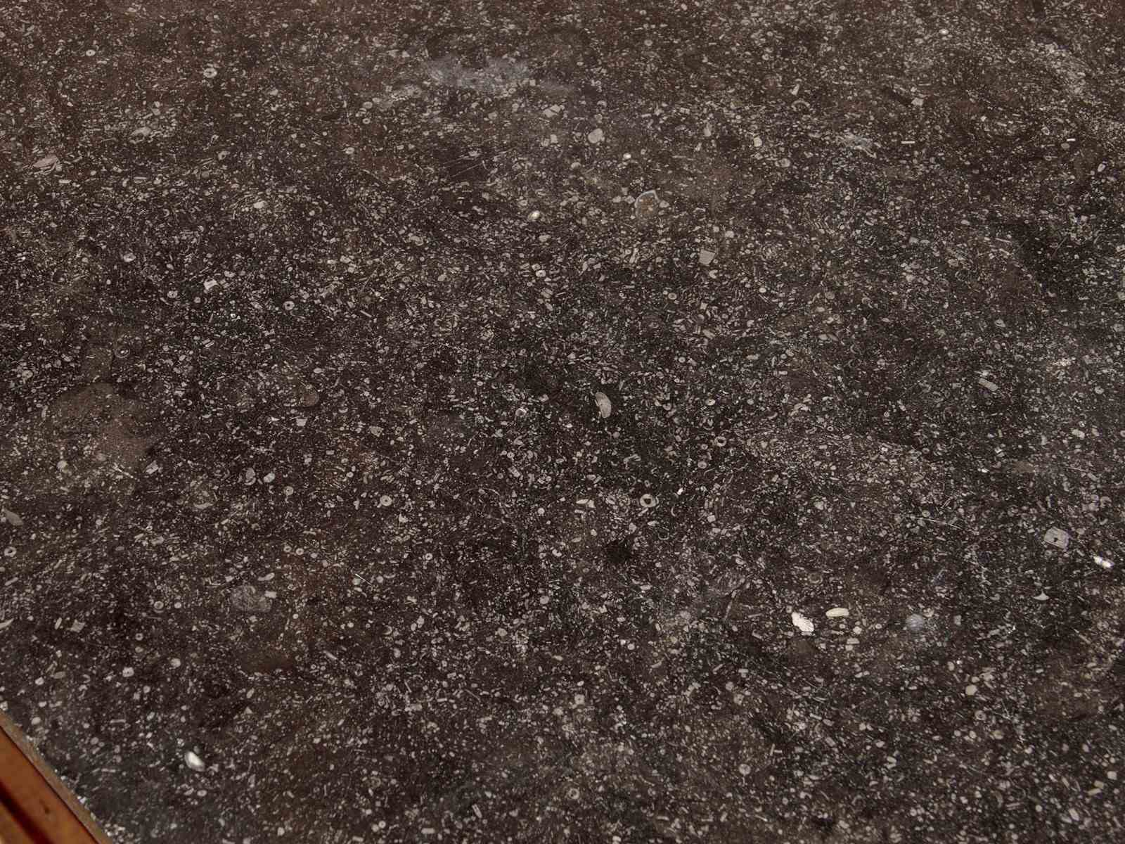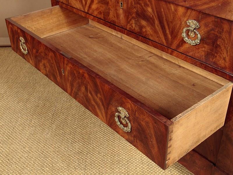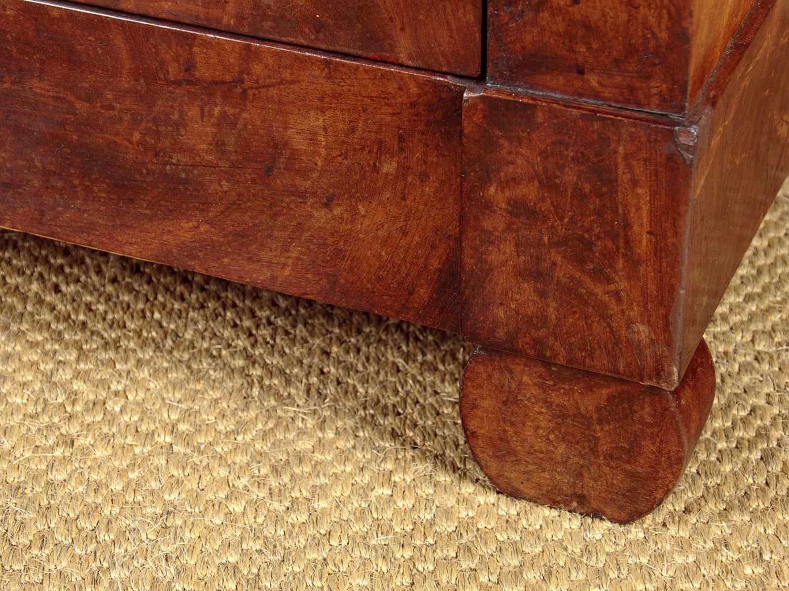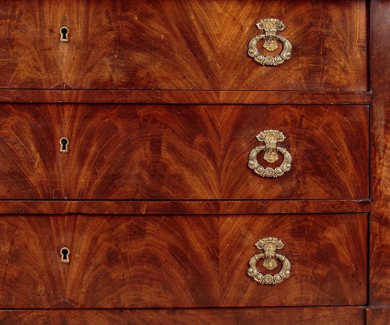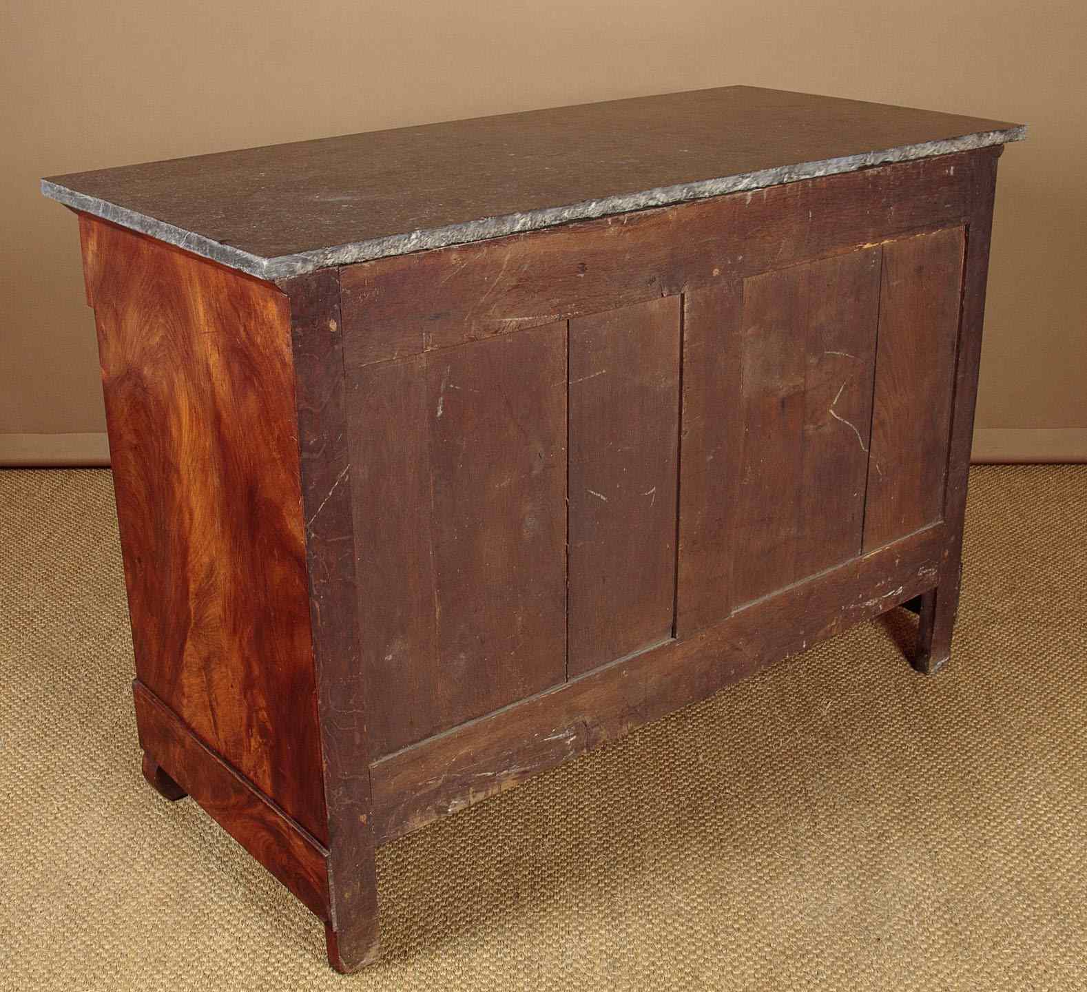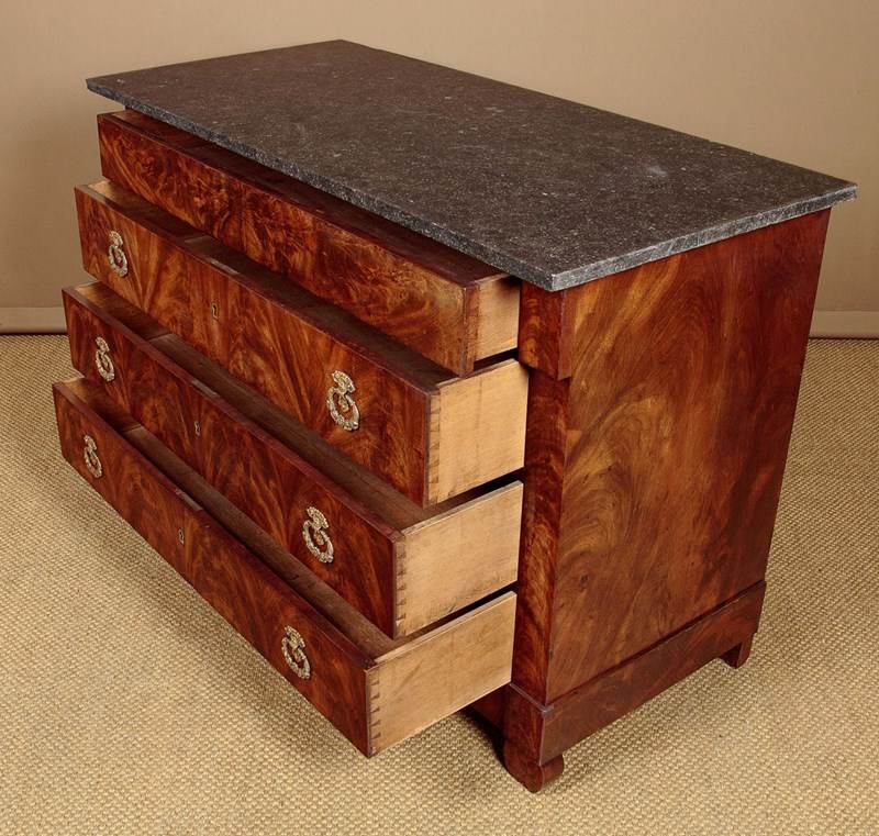 Early 19th.c. French mahogany and marble top commode chest of drawers c.1820. Black marble top with tiny white fossils embedded within. Over four long oak lined drawers. Highly figured flame mahogany veneers arranged in a striking symmetrical pattern across the front and sides. Large decorative Empire style handles to the the lower drawers (recessed hand grips in the overhanging edge of the upper drawer). On a square plinth, also veneered to match, and original feet. A good quality example of the form with oak groundwork, carcass and back panels. Some wear to the marble and minor repairs to the veneers. Generally excellent colour and condition, cleaned and waxed in our workshops.