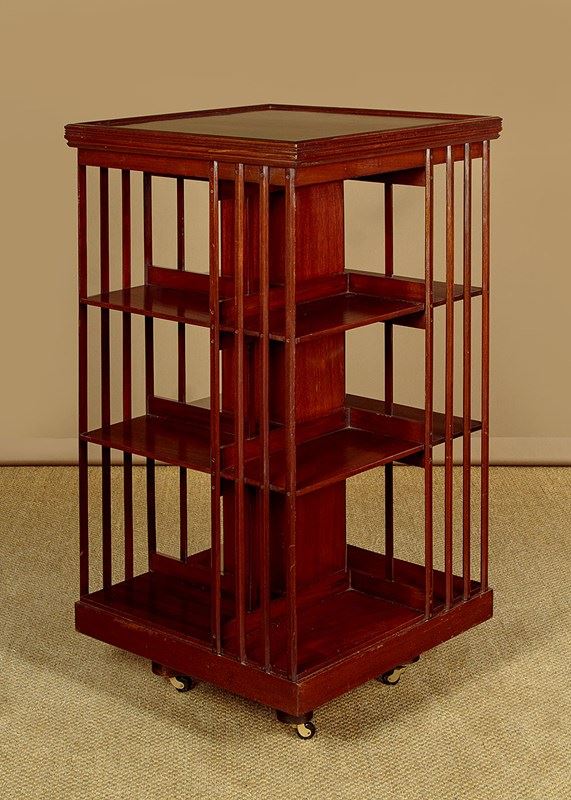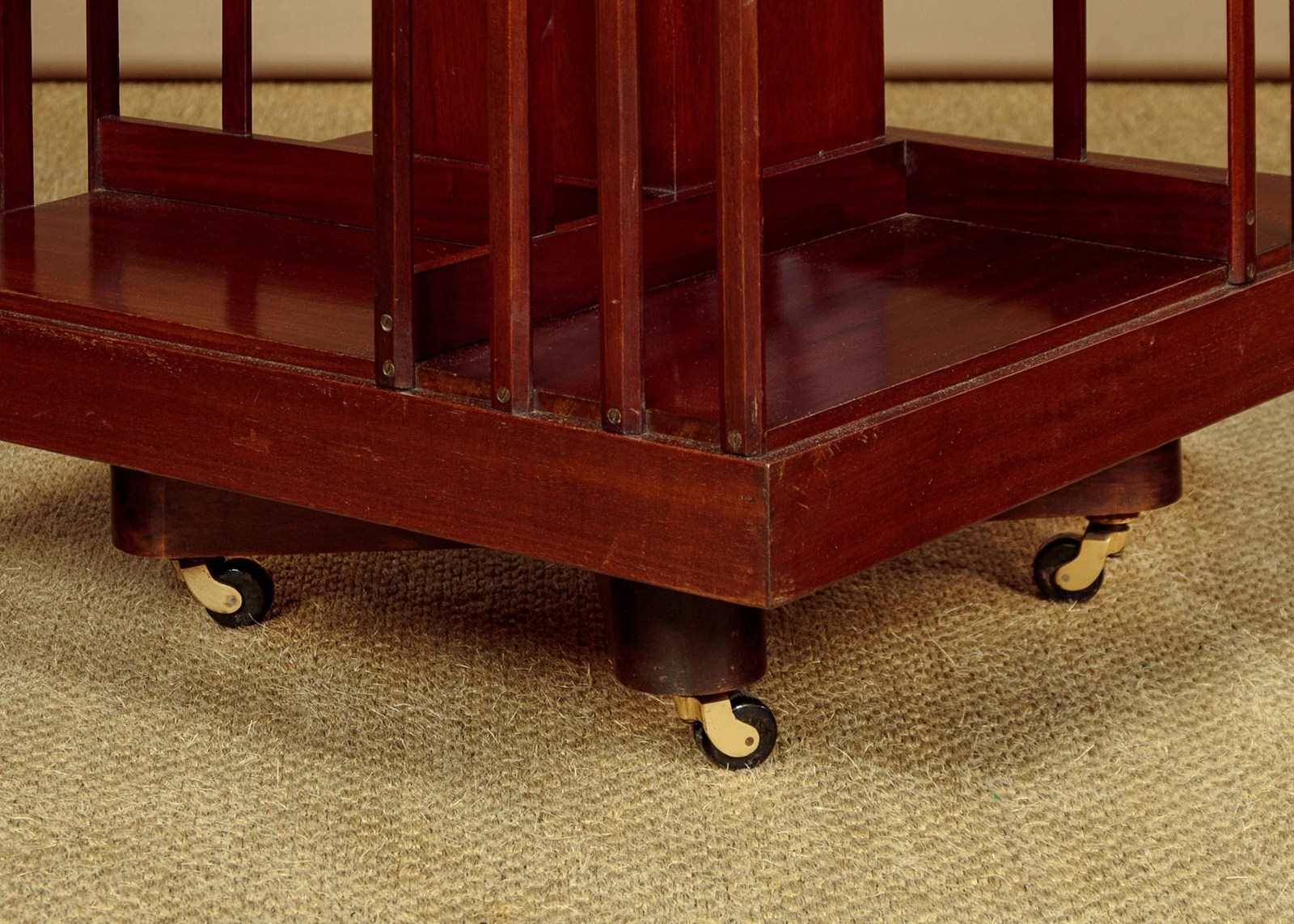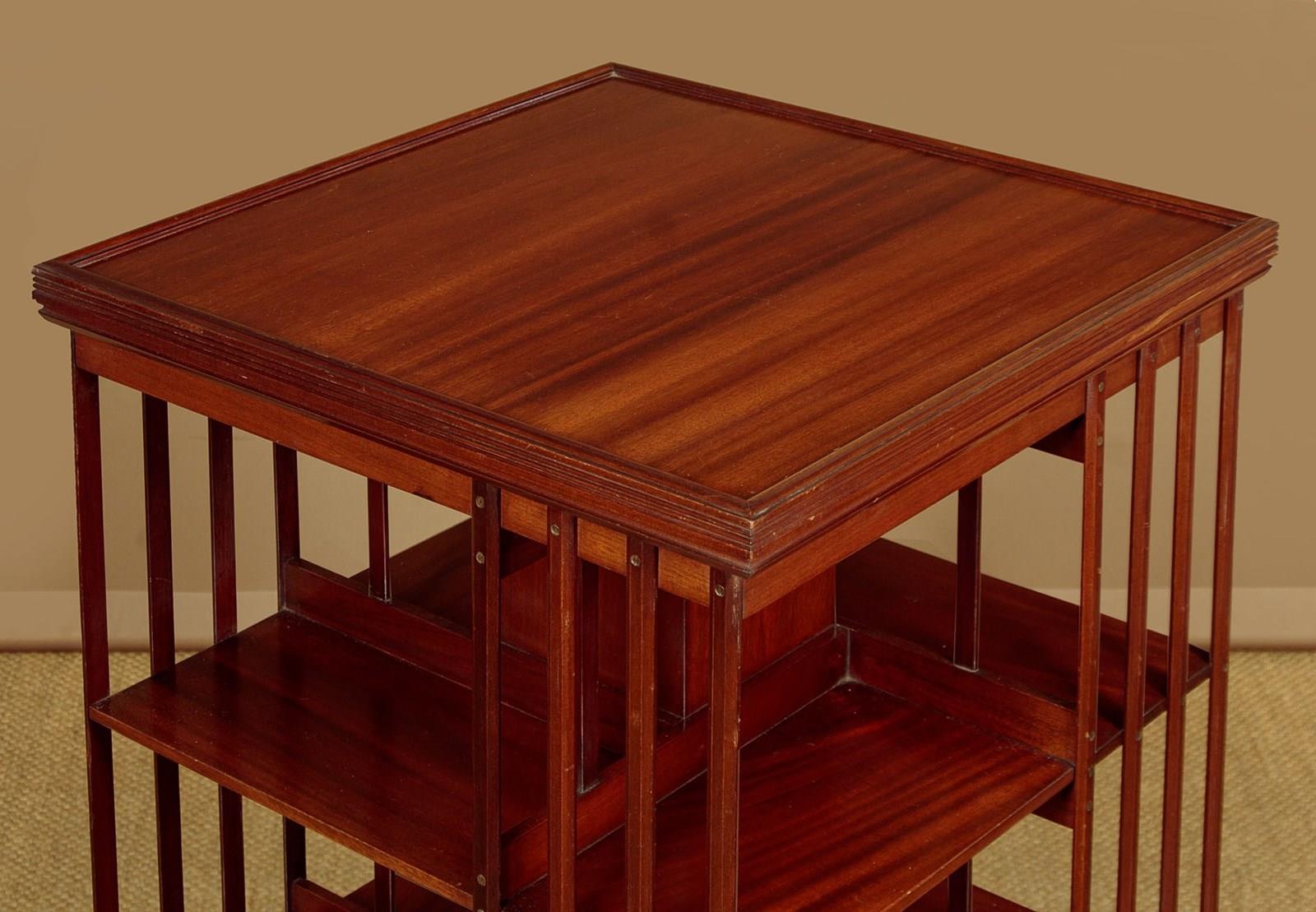 Large three tier Edwardian mahogany revolving bookcase c.1910. 24" square top with a slightly raised moulded edge to the top to prevent items from falling of the sides. Three tiers of shelves (depth 7") affording 14 feet of shelf space for books etc. Chamfered slats to the sides and a square plinth. Revolving on a crossed foot raised original black ceramic castors. Very good colour and condition, cleaned and waxed in our workshops.