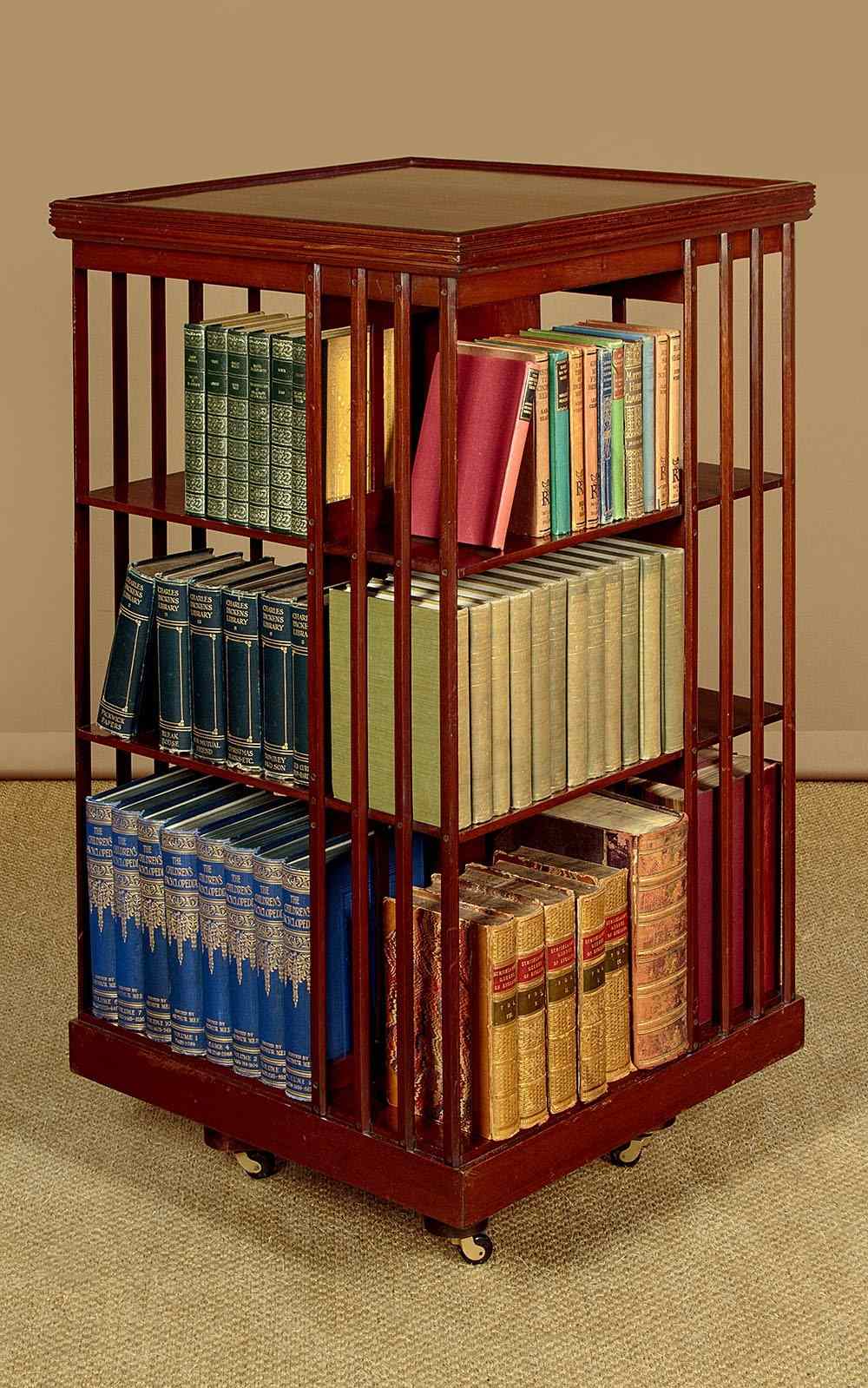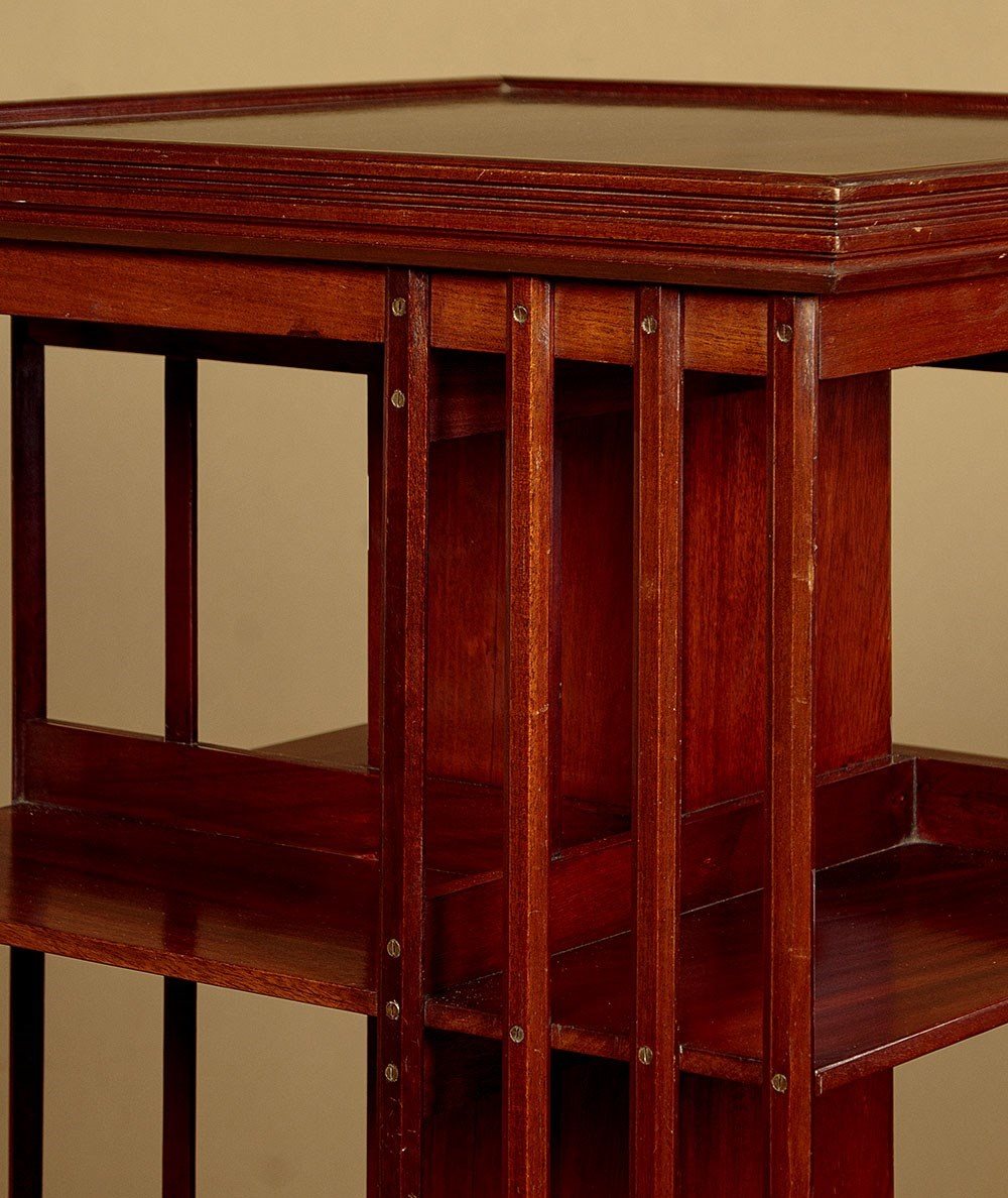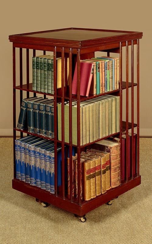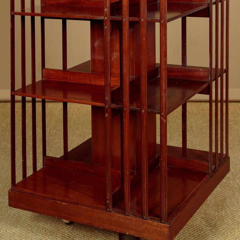 Large three tier Edwardian mahogany revolving bookcase c.1910. 24" square top with a slightly raised moulded edge to the top to prevent items from falling of the sides. Three tiers of shelves (depth 7") affording 14 feet of shelf space for books etc. Chamfered slats to the sides and a square plinth. Revolving on a crossed foot raised original black ceramic castors. Very good colour and condition, cleaned and waxed in our workshops.