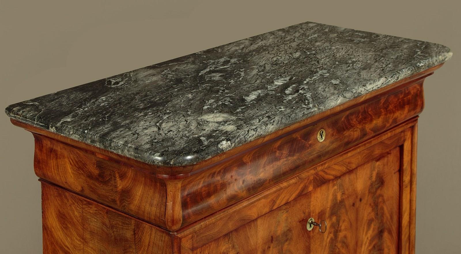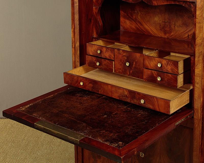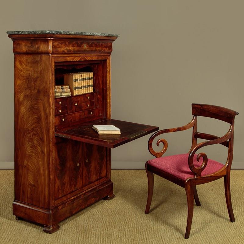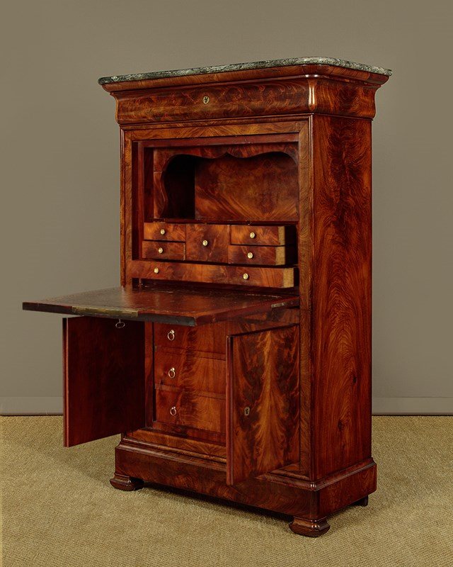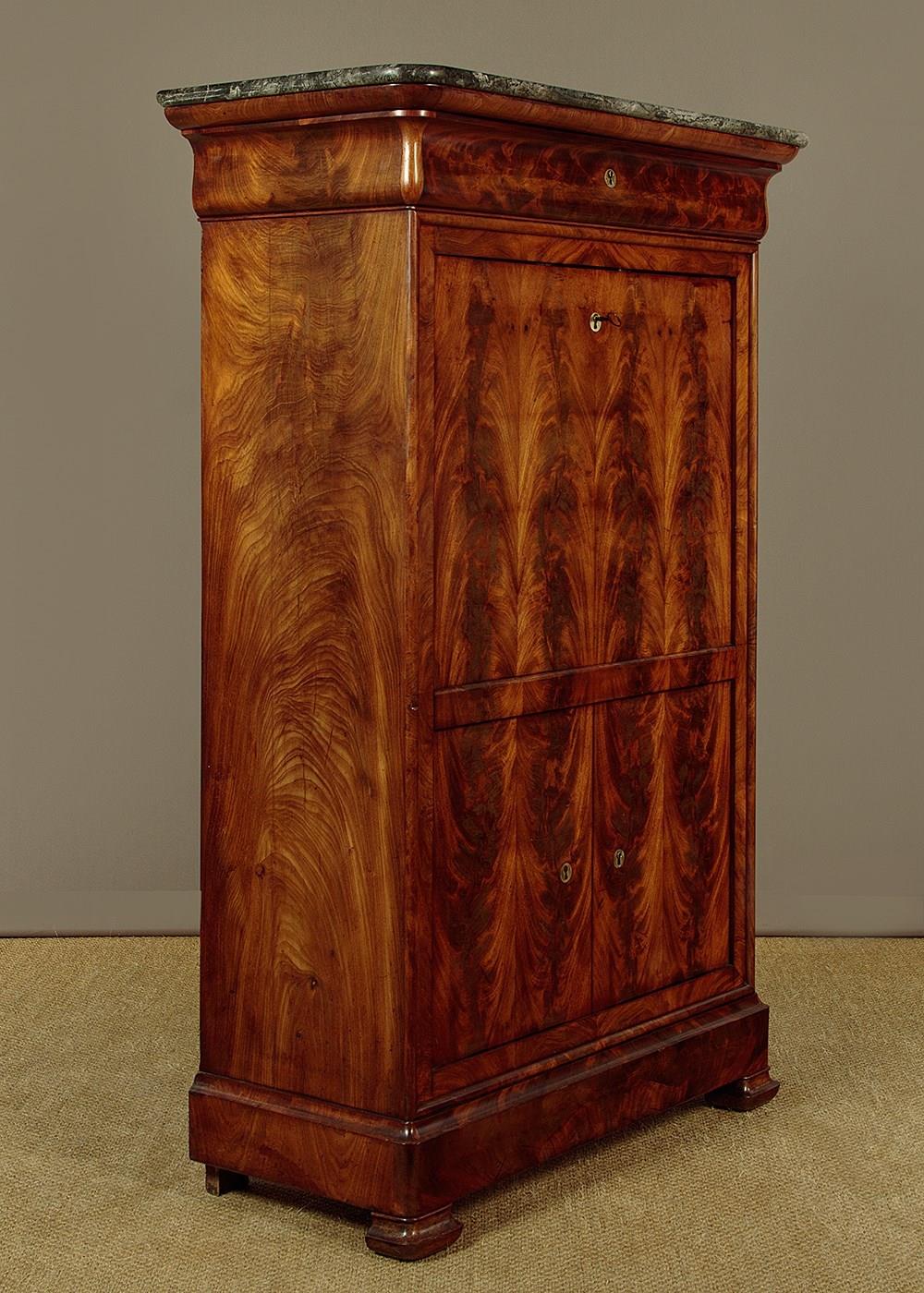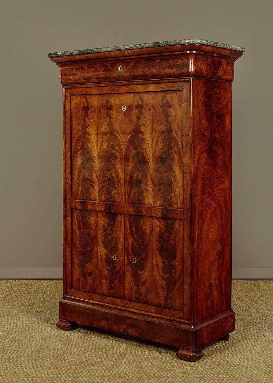 Mid 19th.c. French Biedermeier style mahogany and marble top secretaire abattant or writing bureau c.1840. Open the fall to reveal a large desk (height 28") with a leather writing surface. Fitted interior with an open bookshelf plus one long and five small stationery drawers. With a long frieze drawer above the bureau and a two door cupboard below fitted with three drawers inside. Original grey marble top with rounded front corners. Exceptionally well figured flame mahogany veneers arranged in a beautiful symmetrical pattern across front and sides and continued on the interior. Original inlaid brass escutcheons and working locks, original turned bone drawer knobs on the desk interior. Moulded plinth, also veneered to match, and raised on the original moulded block feet. Oak drawer linings and back panels. Excellent colour and condition, cleaned and waxed in our workshops. Key supplied.