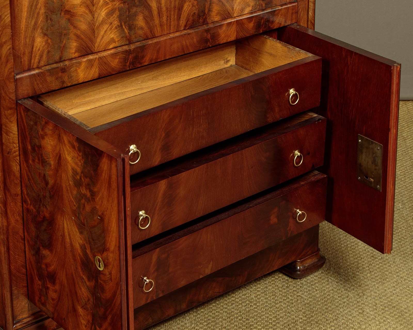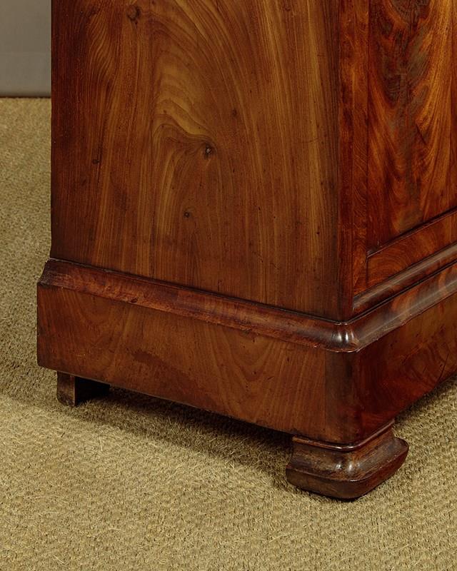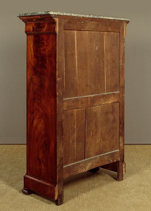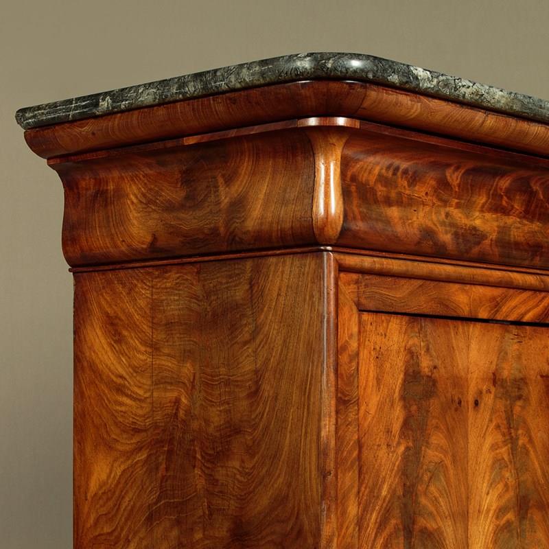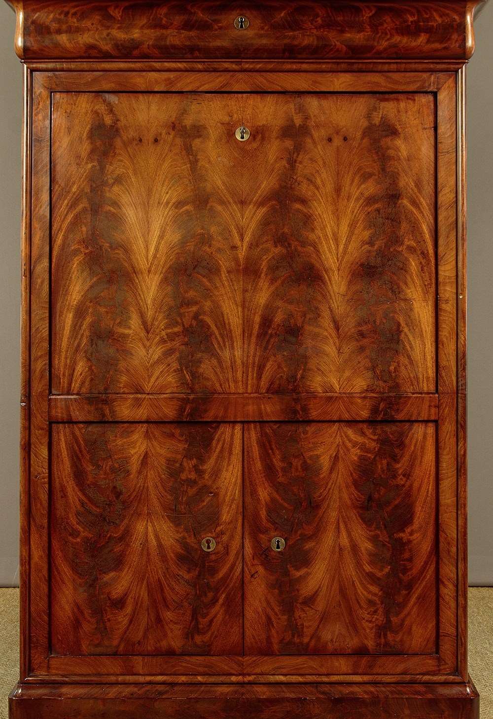 Mid 19th.c. French Biedermeier style mahogany and marble top secretaire abattant or writing bureau c.1840. Open the fall to reveal a large desk (height 28") with a leather writing surface. Fitted interior with an open bookshelf plus one long and five small stationery drawers. With a long frieze drawer above the bureau and a two door cupboard below fitted with three drawers inside. Original grey marble top with rounded front corners. Exceptionally well figured flame mahogany veneers arranged in a beautiful symmetrical pattern across front and sides and continued on the interior. Original inlaid brass escutcheons and working locks, original turned bone drawer knobs on the desk interior. Moulded plinth, also veneered to match, and raised on the original moulded block feet. Oak drawer linings and back panels. Excellent colour and condition, cleaned and waxed in our workshops. Key supplied.