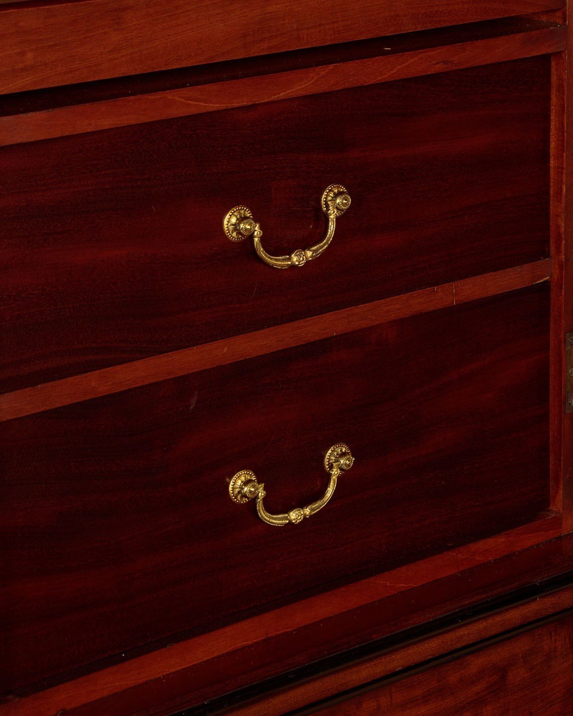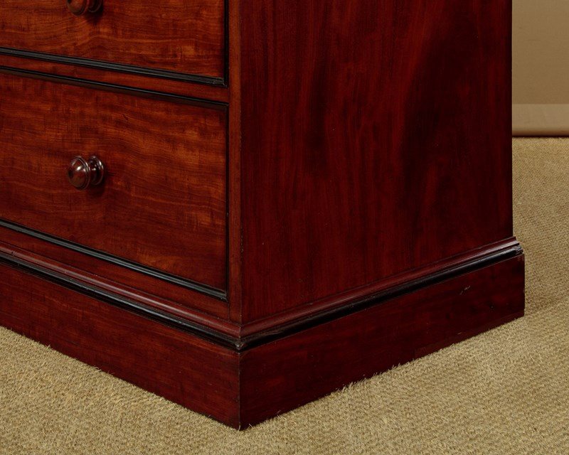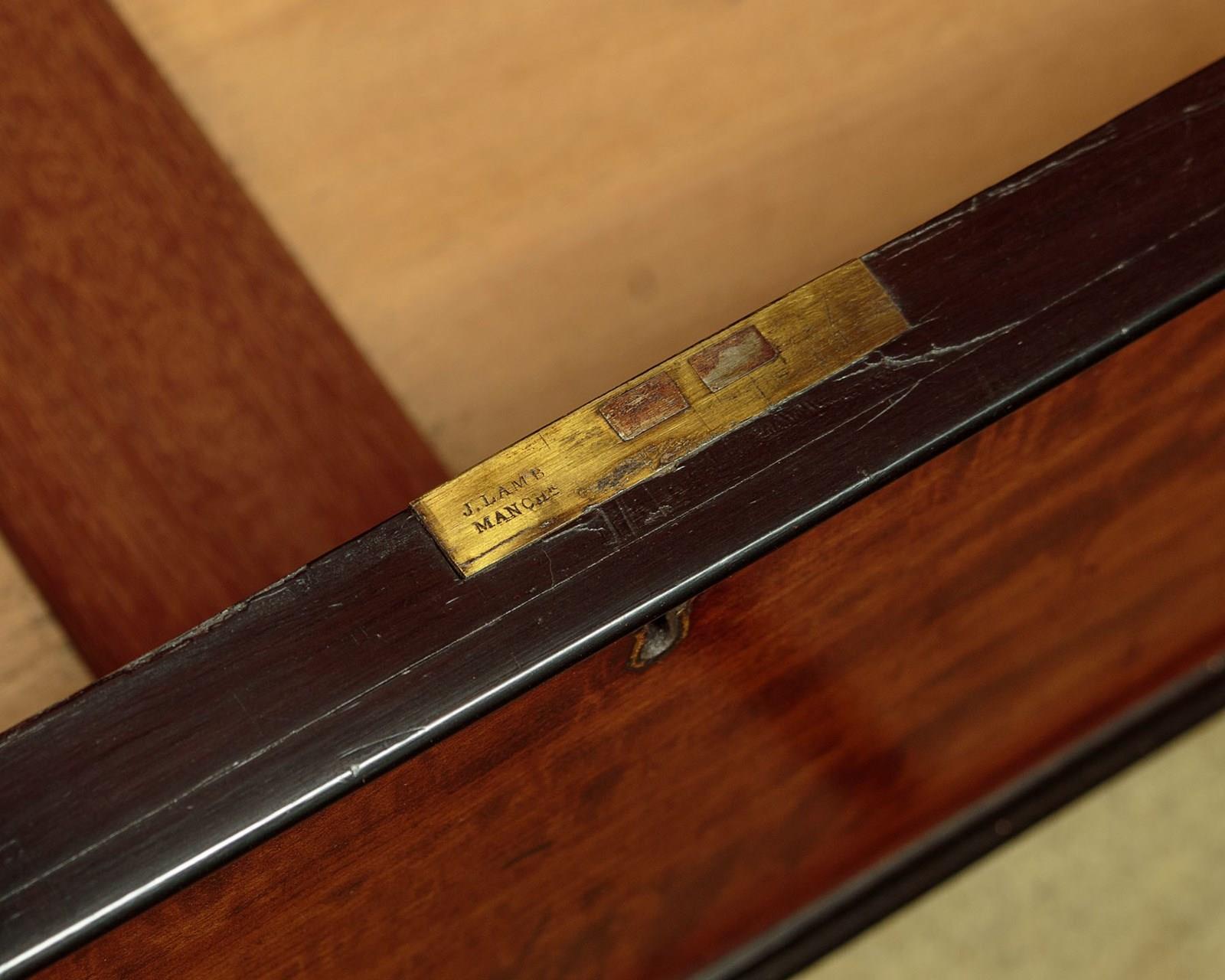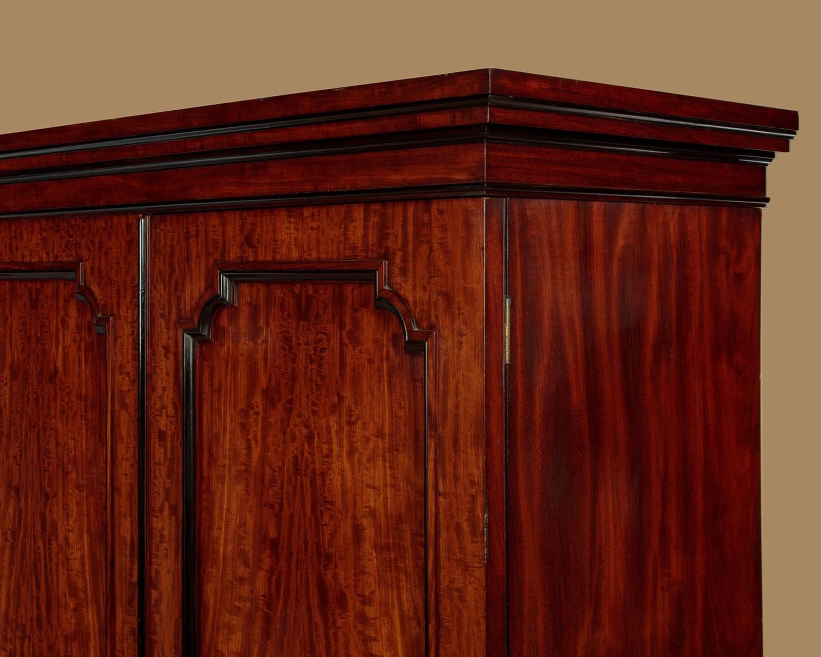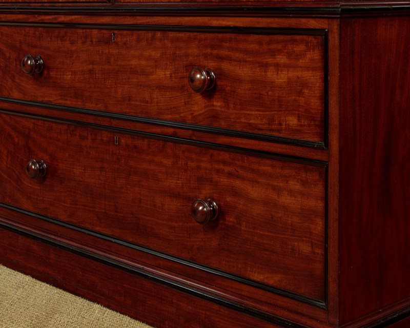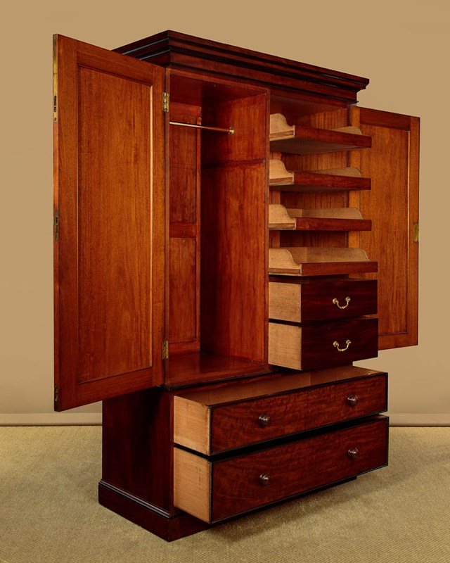 Superb quality mahogany wardrobe or linen press by the celebrated English cabinet makers Lamb of Manchester. Two door wardrobe top fitted inside with a brass hanging rail to the left hand side (internal depth 20", height below the rail 45") and four sliding shelves plus two drawers to the right hand side. On a separate base with two long drawers. Mahogany veneers with crisp ebonised mouldings to the cornice, doors and drawers, waist and plinth. Original turned knobs, internal handles, locks and latches. Mahogany drawer linings. Stamped for Lamb's on the locks and with a large maker's label to the underside of the top. Excellent colour and condition, cleaned and waxed in our workshops. Key supplied.