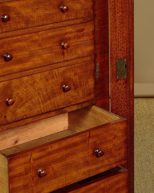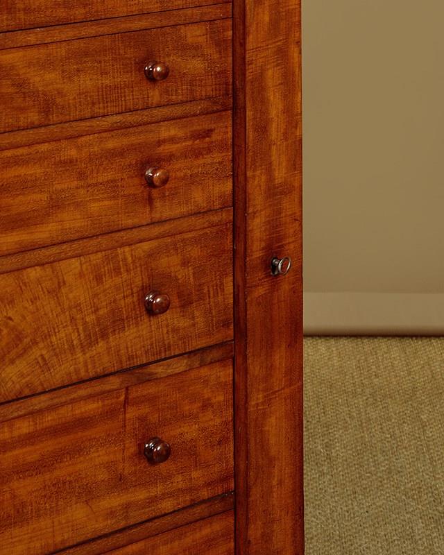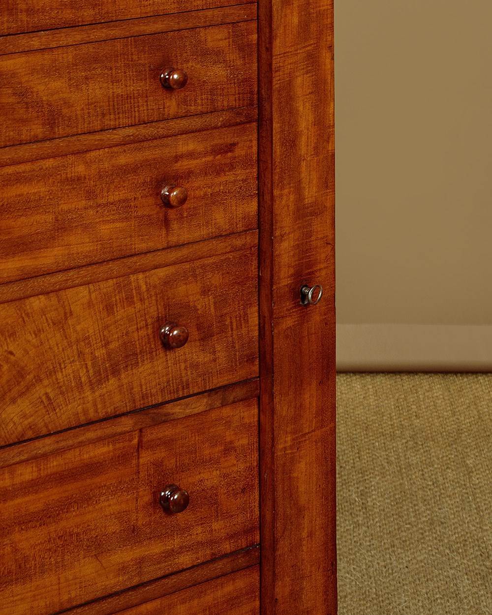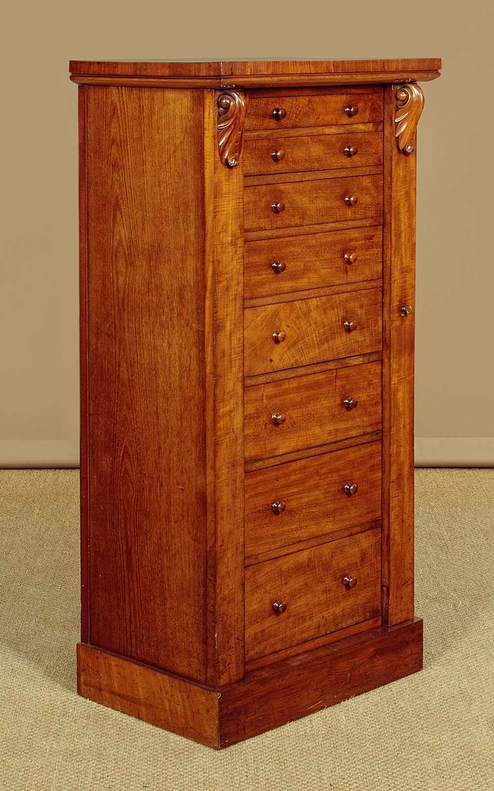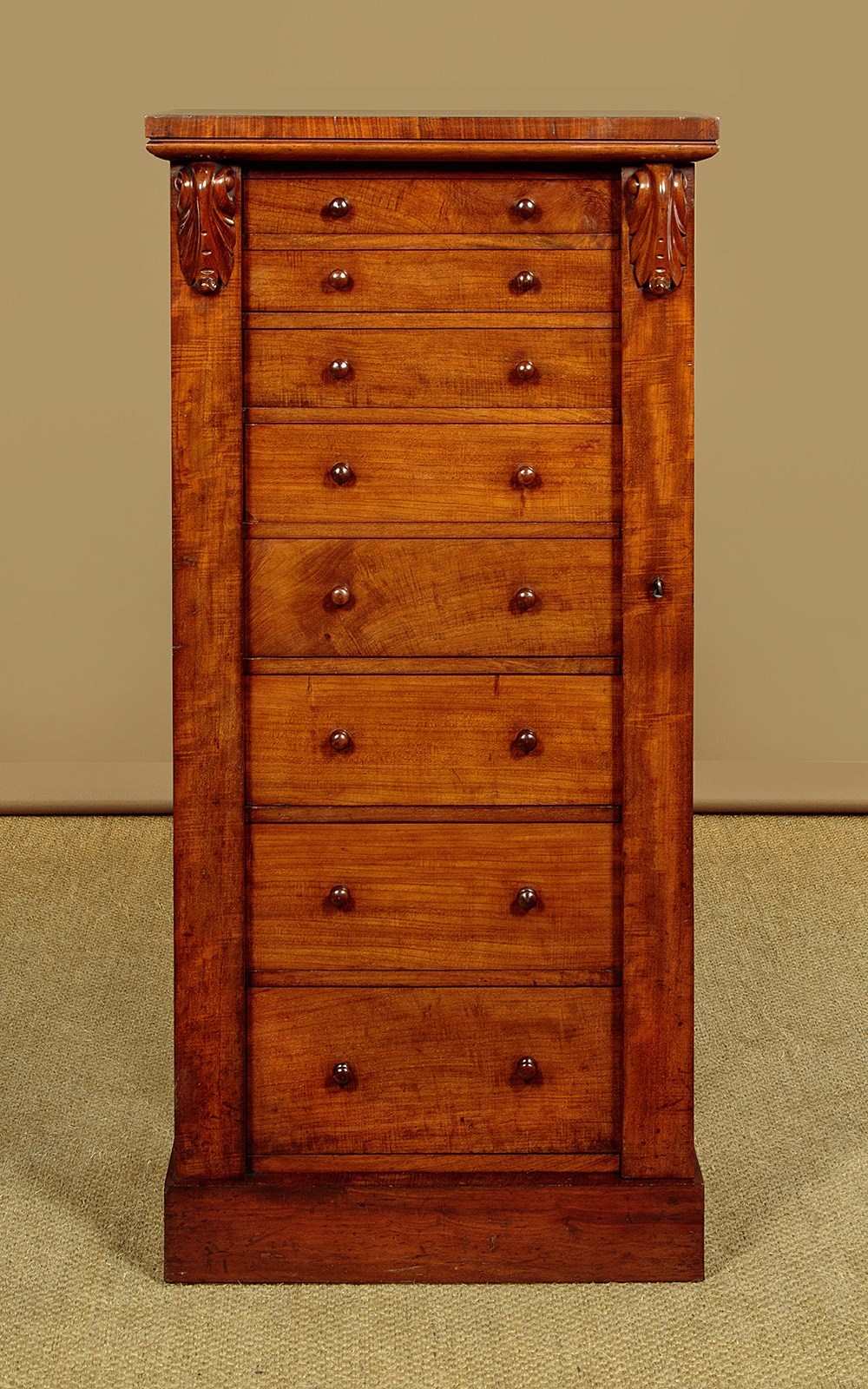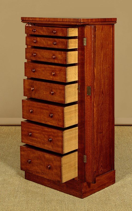 Handsome mid 19th.c. mahogany Wellington chest c.1860. Just 23" wide. Eight drawers of graduated height, ideal for accessories and filing etc (width 15", depth 10". Big enough for A4 paper). All the drawers are held closed with the hinged and lockable right hand pilaster typical of the form. Good mahogany veneers to the top and drawer fronts. Turned mahogany knobs, oak drawer linings. Solid mahogany sides. Excellent colour and condition, cleaned and waxed in our workshops. Key supplied.