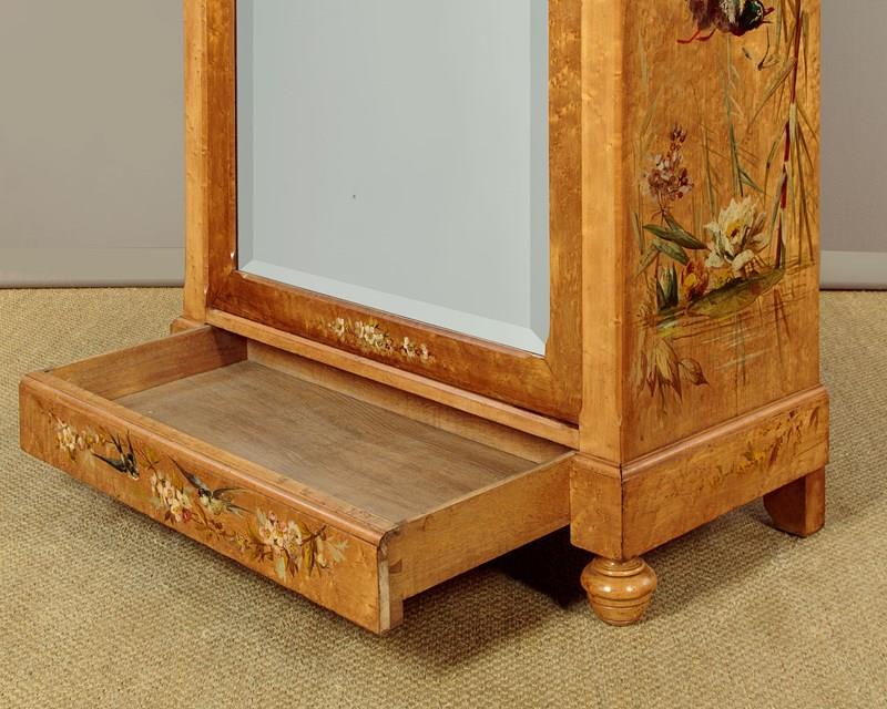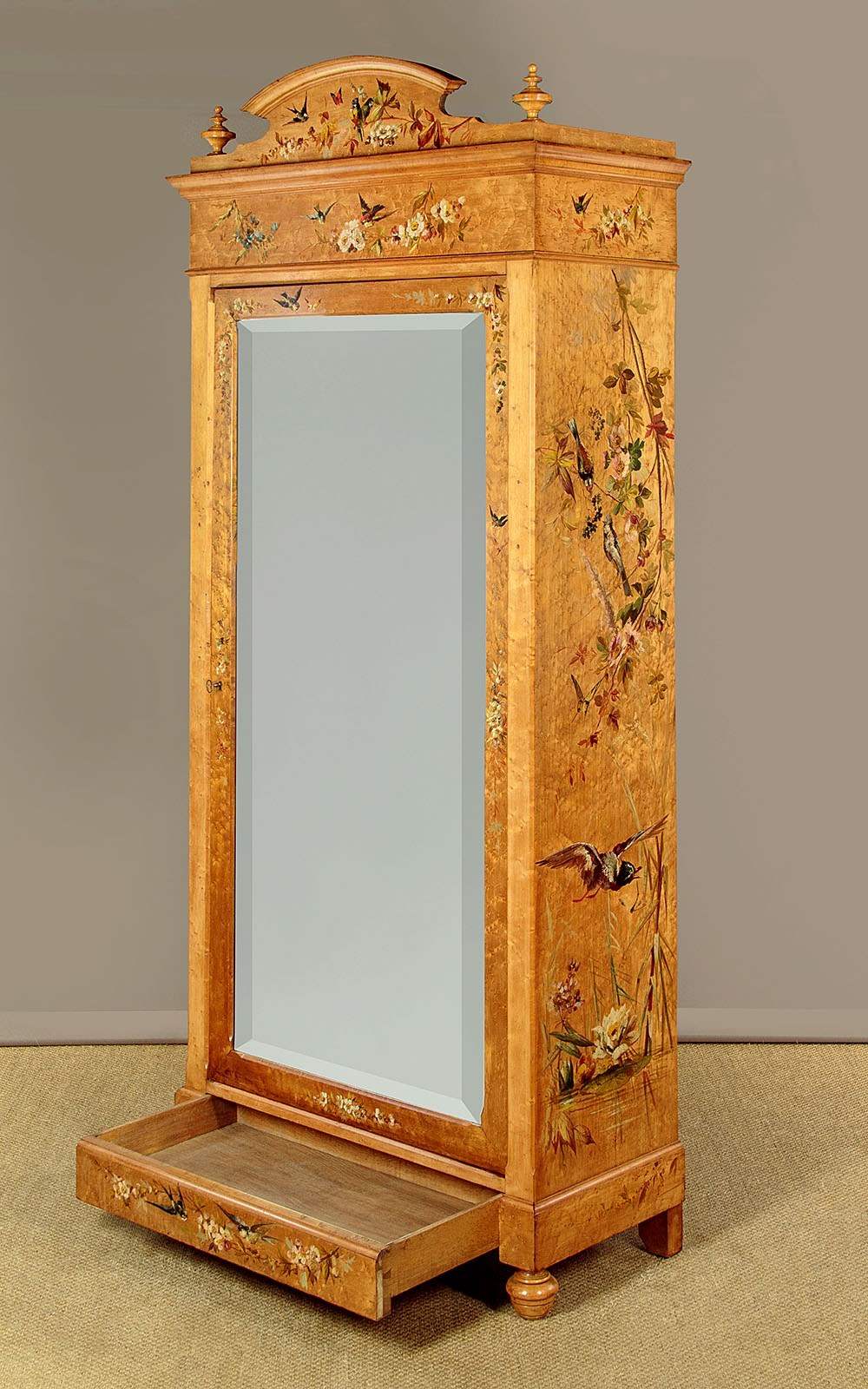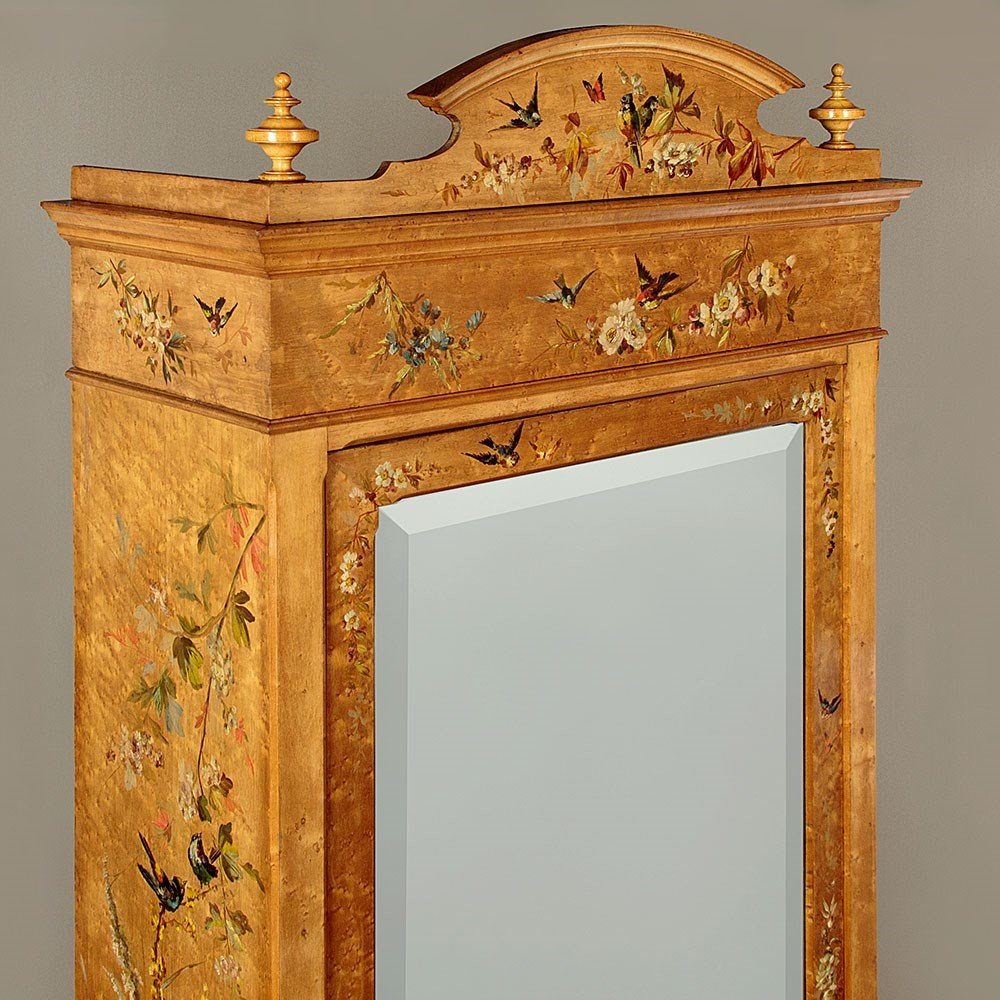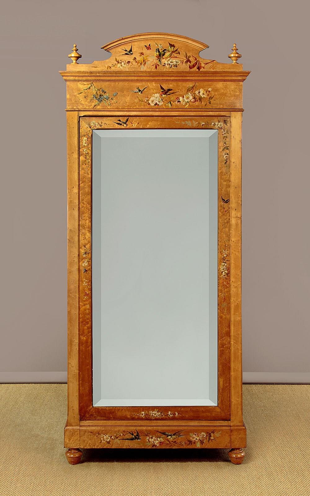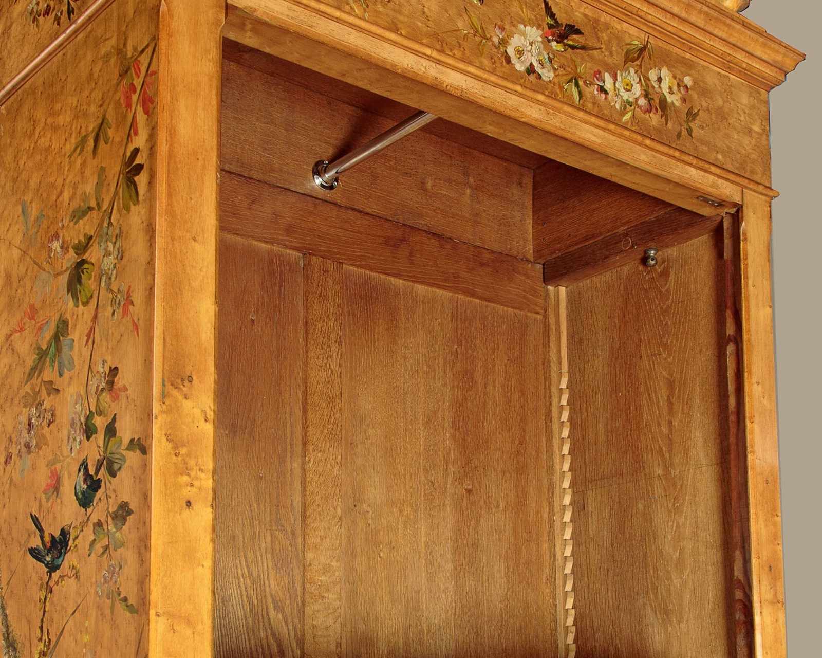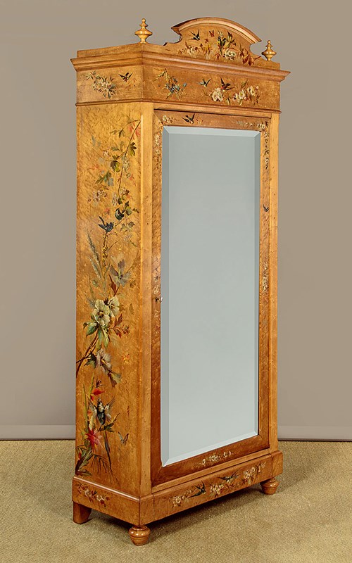 Remarkable French wardrobe in birdseye maple with beautiful and original painted decoration c.1890. Single door with the original full length mirror plate with a bevelled edge. Fitted inside with a front to back hanging rail and two adjustable shelves (internal depth 14"), over a single drawer in the base. Topped with an arched pediment and turned finials (can be removed if preferred) above the moulded cornice. Superb and extensive hand painted decoration across the exterior of the wardrobe featuring naturalistic scenes of birds insects and plants. Chamfered edges to the frame. Raised on turned front feet. Oak drawer linings and interior. Couple of small marks to the mirror, otherwise very good colour and condition, cleaned and waxed in our workshops. Key supplied.