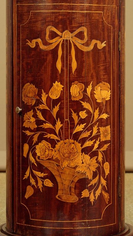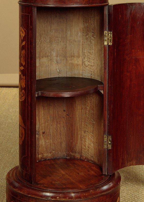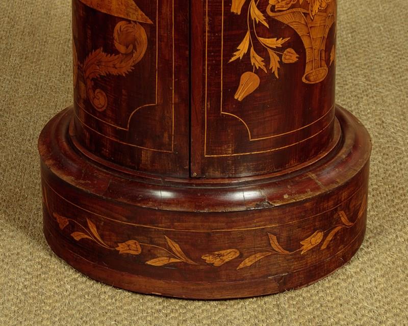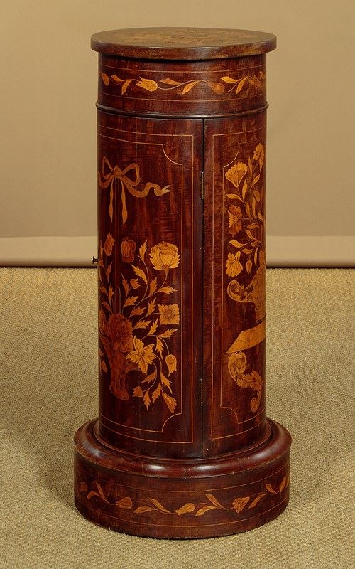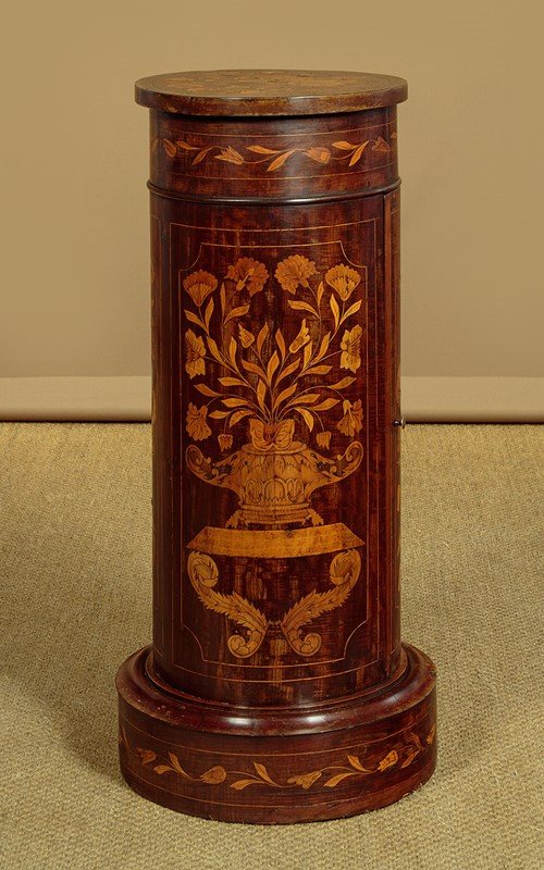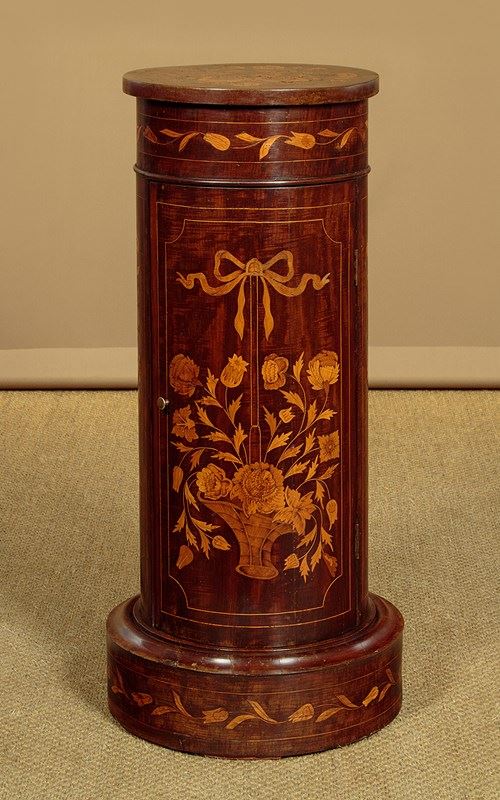 Unusual little marquetry inlaid mahogany cylinder pedestal cabinet c.1860. 13" inch diameter top inlaid with Dutch style marquetry work decoration of flowers and a bird in contrasting timbers against the mahogany ground. Single door cabinet fitted with a single shelf inside (internal diameter 10"). Superb marquetry inlay panel to the door featuring a basket of flowers hung from a ribbon garland. Two more matched panels to the sides and rear featuring flowers in an acanthus decorated bowl on a table with acanthus scroll legs. Inlaid strung borders and further inlaid flower and leaf detail around the top and to the broad moulded plinth. Some minor wear to the veneers, generally very good colour and condition, cleaned and waxed in our workshops.