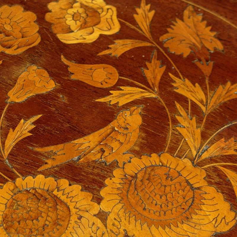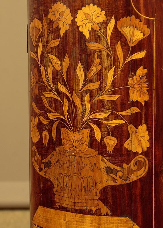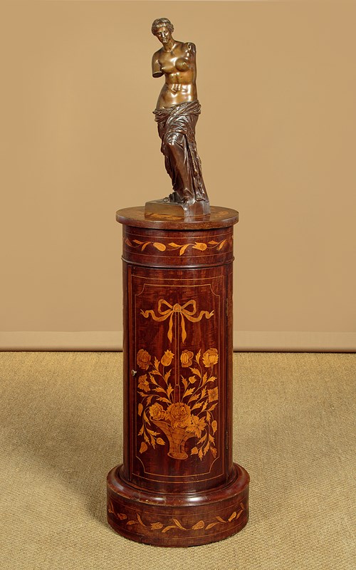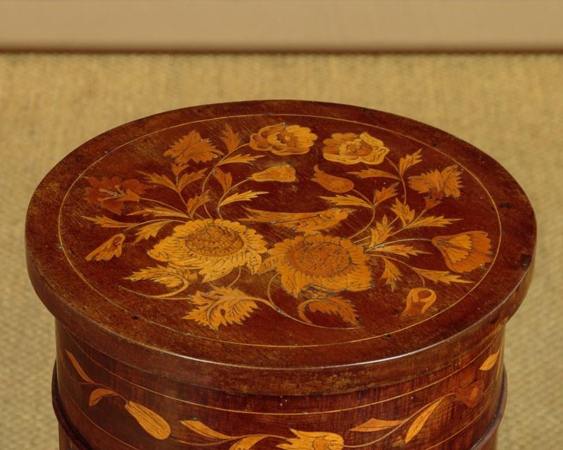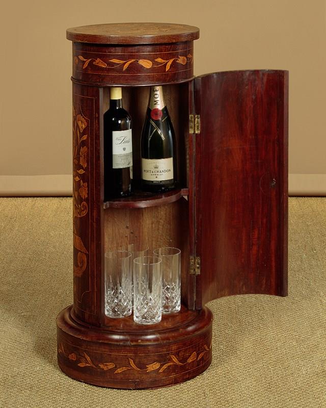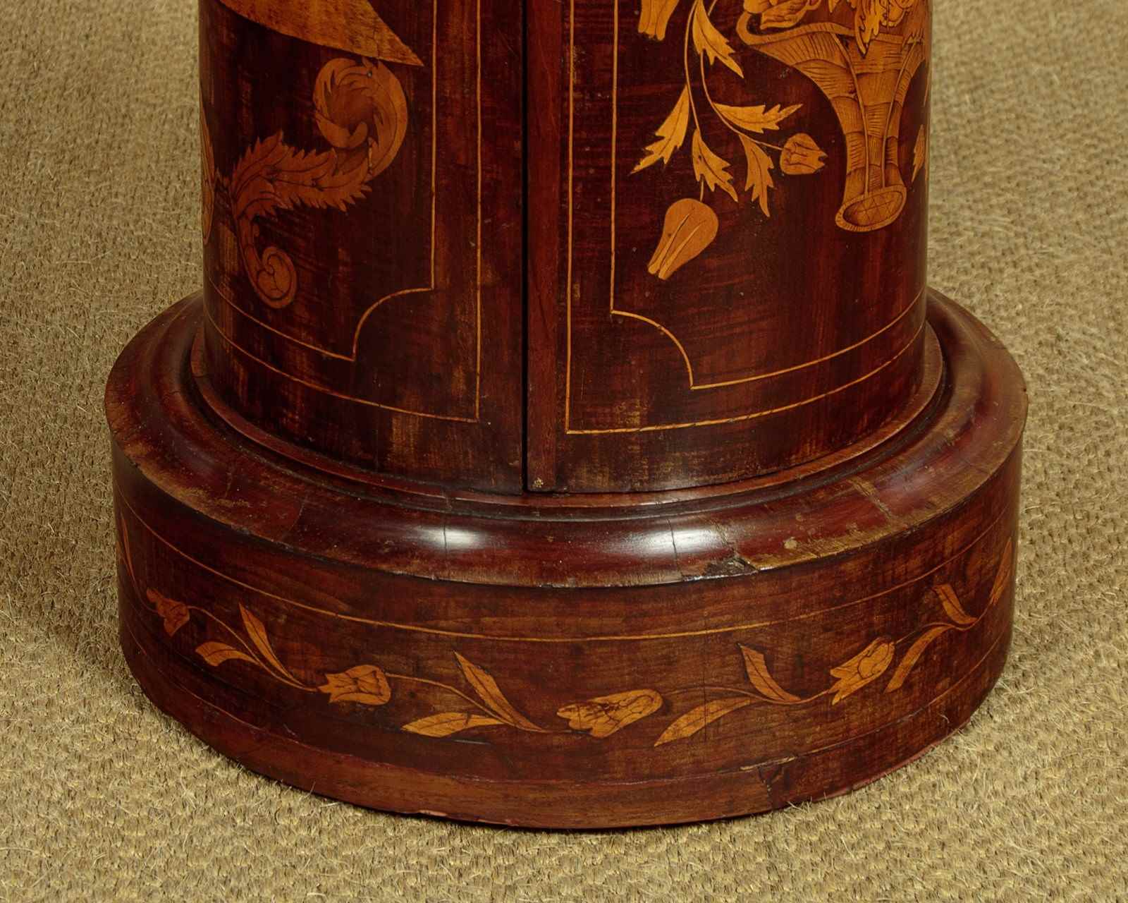 Unusual little marquetry inlaid mahogany cylinder pedestal cabinet c.1860. 13" inch diameter top inlaid with Dutch style marquetry work decoration of flowers and a bird in contrasting timbers against the mahogany ground. Single door cabinet fitted with a single shelf inside (internal diameter 10"). Superb marquetry inlay panel to the door featuring a basket of flowers hung from a ribbon garland. Two more matched panels to the sides and rear featuring flowers in an acanthus decorated bowl on a table with acanthus scroll legs. Inlaid strung borders and further inlaid flower and leaf detail around the top and to the broad moulded plinth. Some minor wear to the veneers, generally very good colour and condition, cleaned and waxed in our workshops.