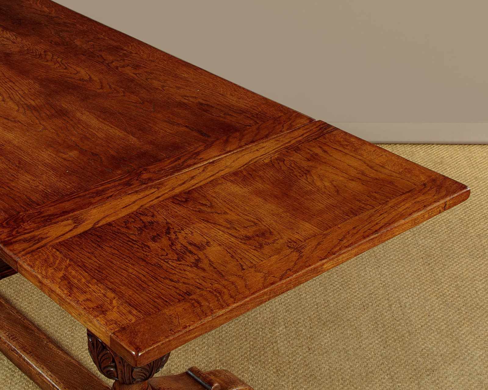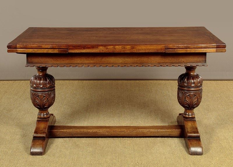 Early 20th.c. extending oak draw leaf refectory style dining table c.1930. 53½" x 29½" top with 15" leaves extending from both ends to make a good eight seater table. Solid oak base with carved and moulded edge to the apron and raised on splendid turned and carved 'cup and cover' baluster legs. Sledge feet joined with a low moulded stretcher. Excellent colour and condition, cleaned and waxed in our workshops.