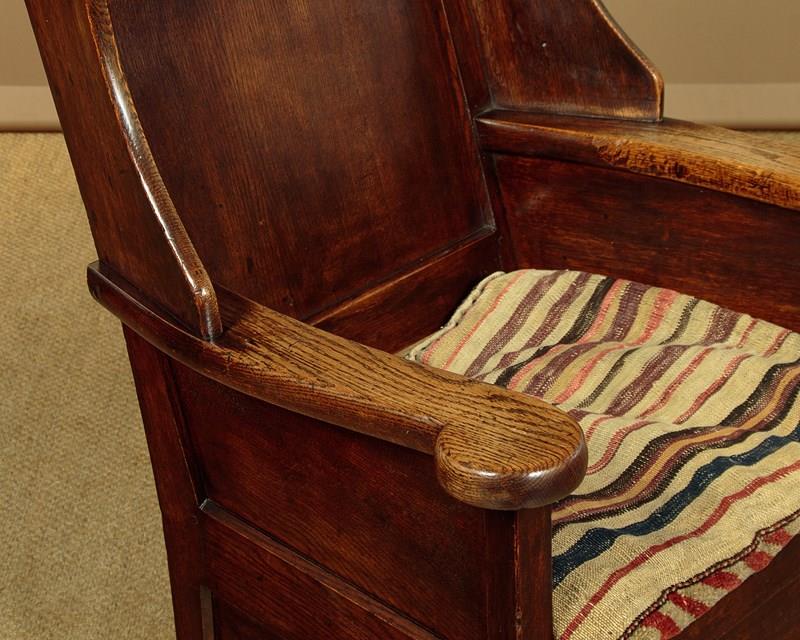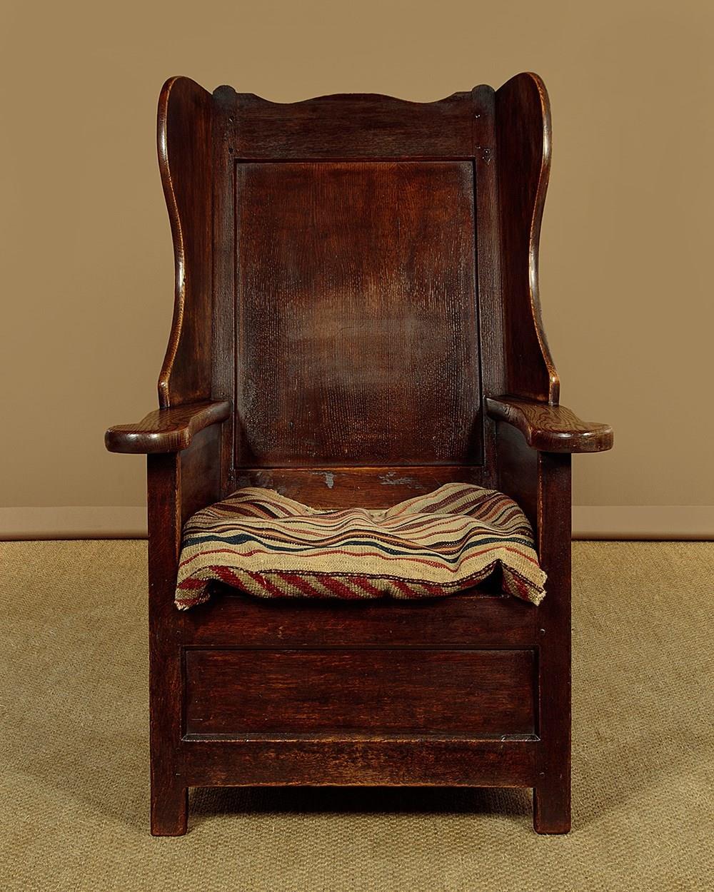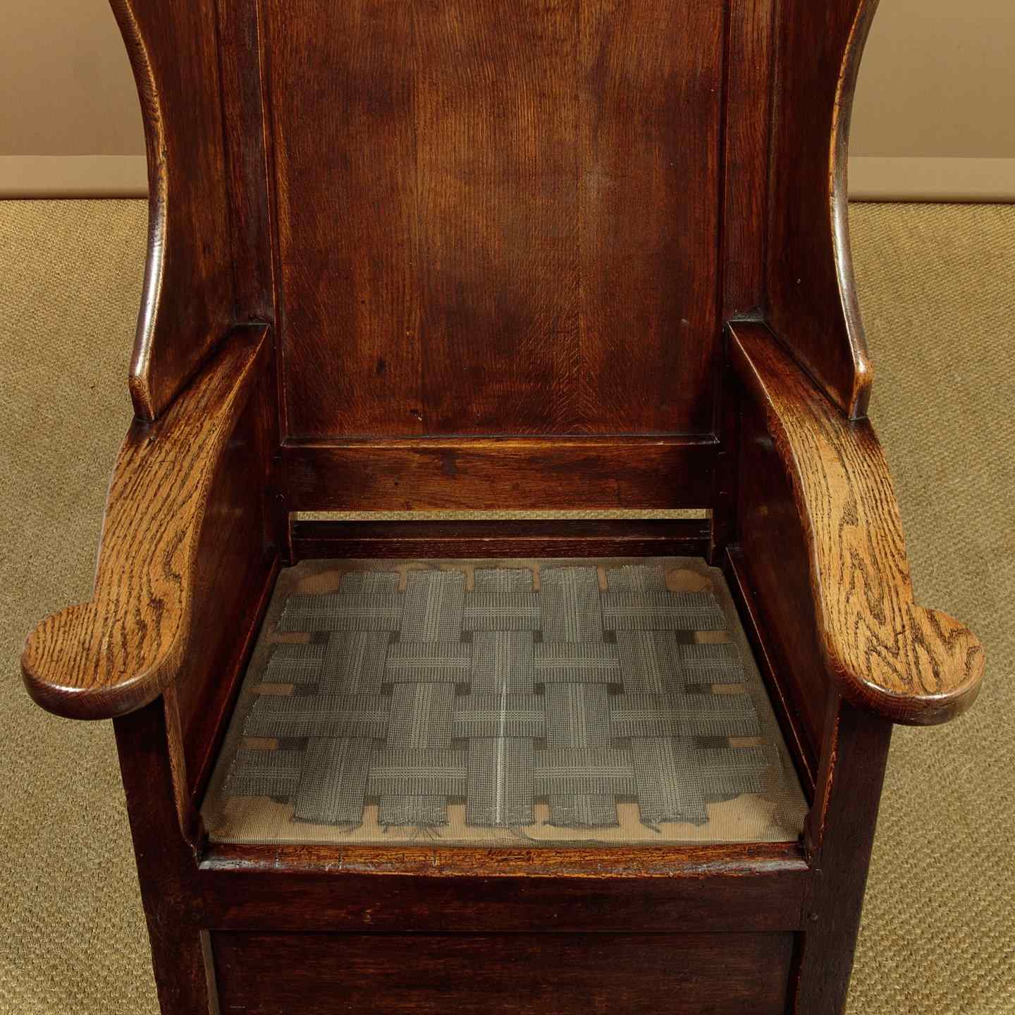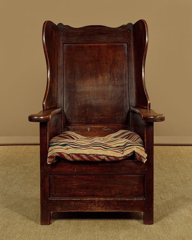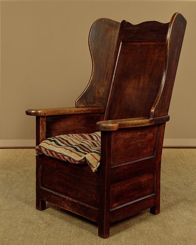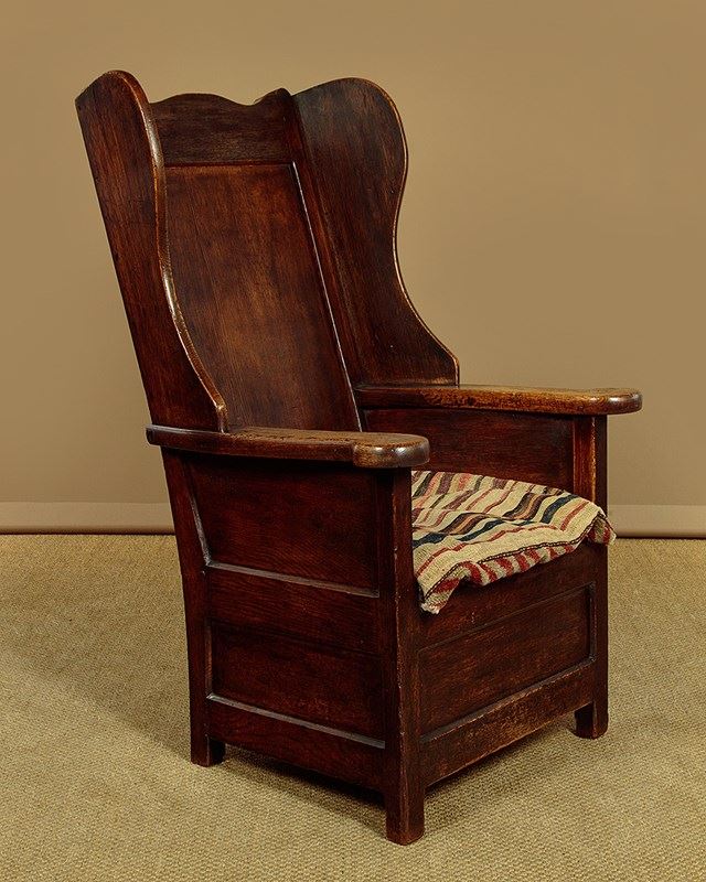 Early 19th.c. oak wing armchair or 'lambing' chair c.1810. High panelled backrest with a shaped cresting rail and the short angled wings typical of the form. The broad flat-top arms with rounded terminals are also a typical feature, providing a useful surface for a drink, a plate or candle. Whilst the sides are enclosed to prevent draughts. Later webbed seat with a loose cushion in a rustic course woven cloth with simple striped pattern, a square of Persian carpet to the other side. Very good colour and condition, cleaned and waxed in our workshops.