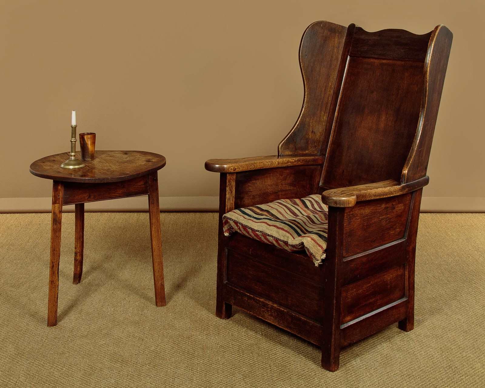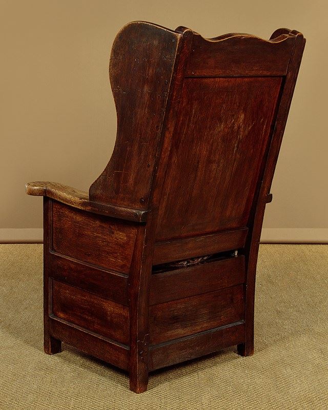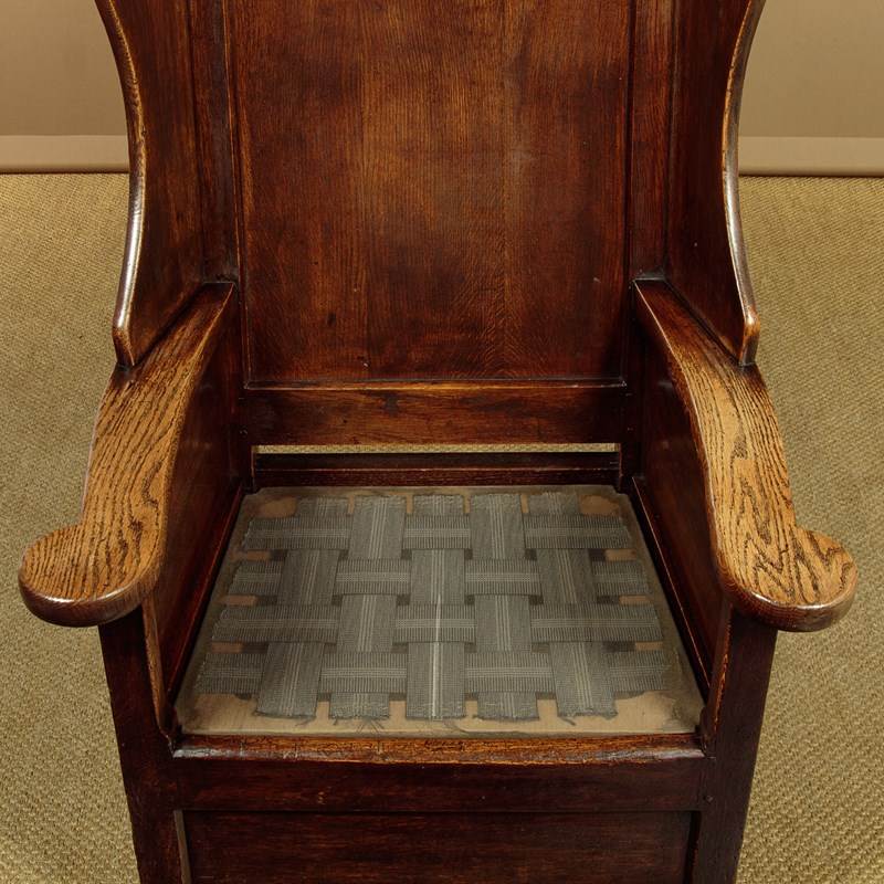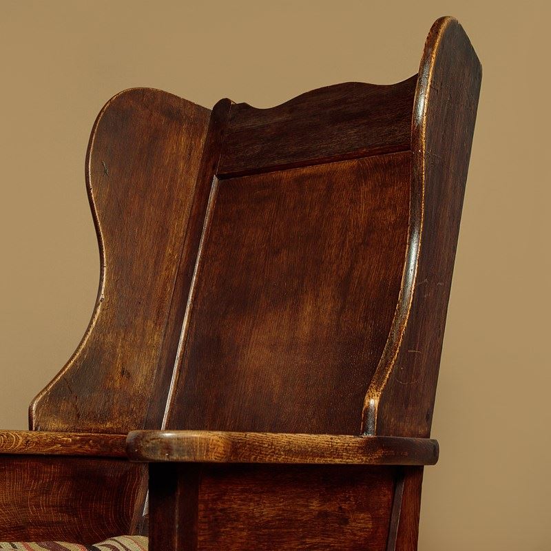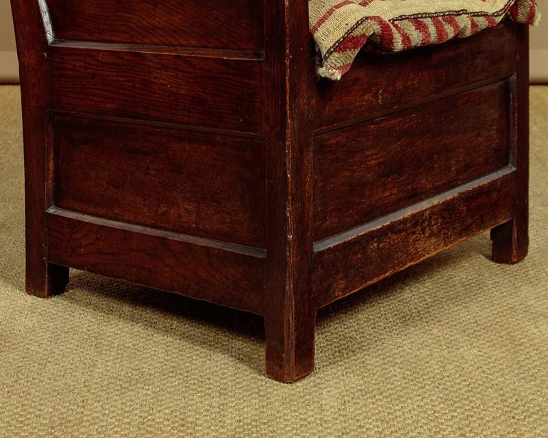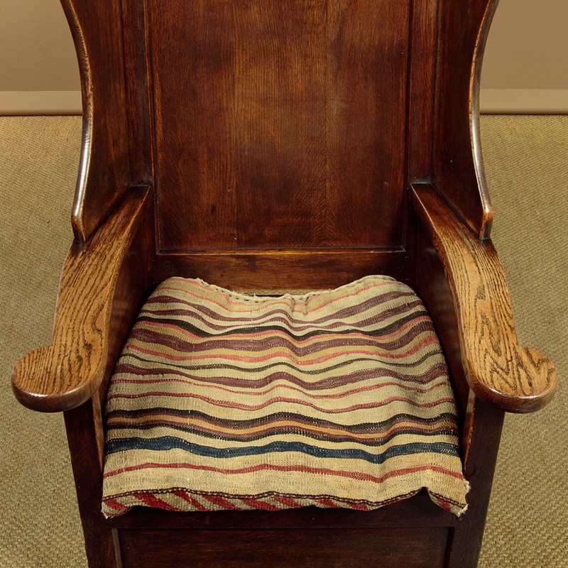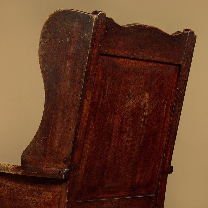 Early 19th.c. oak wing armchair or 'lambing' chair c.1810. High panelled backrest with a shaped cresting rail and the short angled wings typical of the form. The broad flat-top arms with rounded terminals are also a typical feature, providing a useful surface for a drink, a plate or candle. Whilst the sides are enclosed to prevent draughts. Later webbed seat with a loose cushion in a rustic course woven cloth with simple striped pattern, a square of Persian carpet to the other side. Very good colour and condition, cleaned and waxed in our workshops.