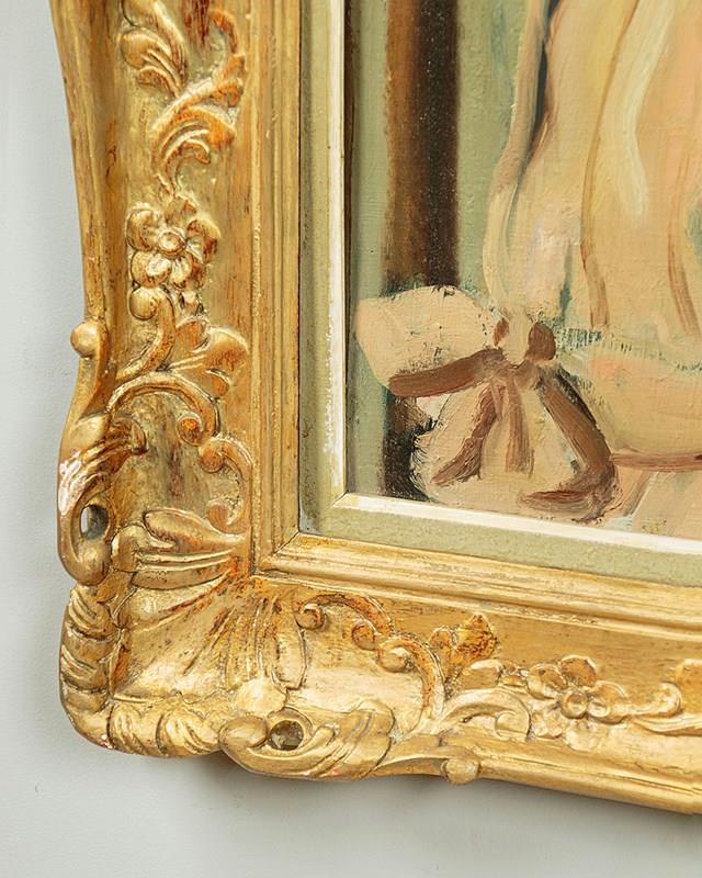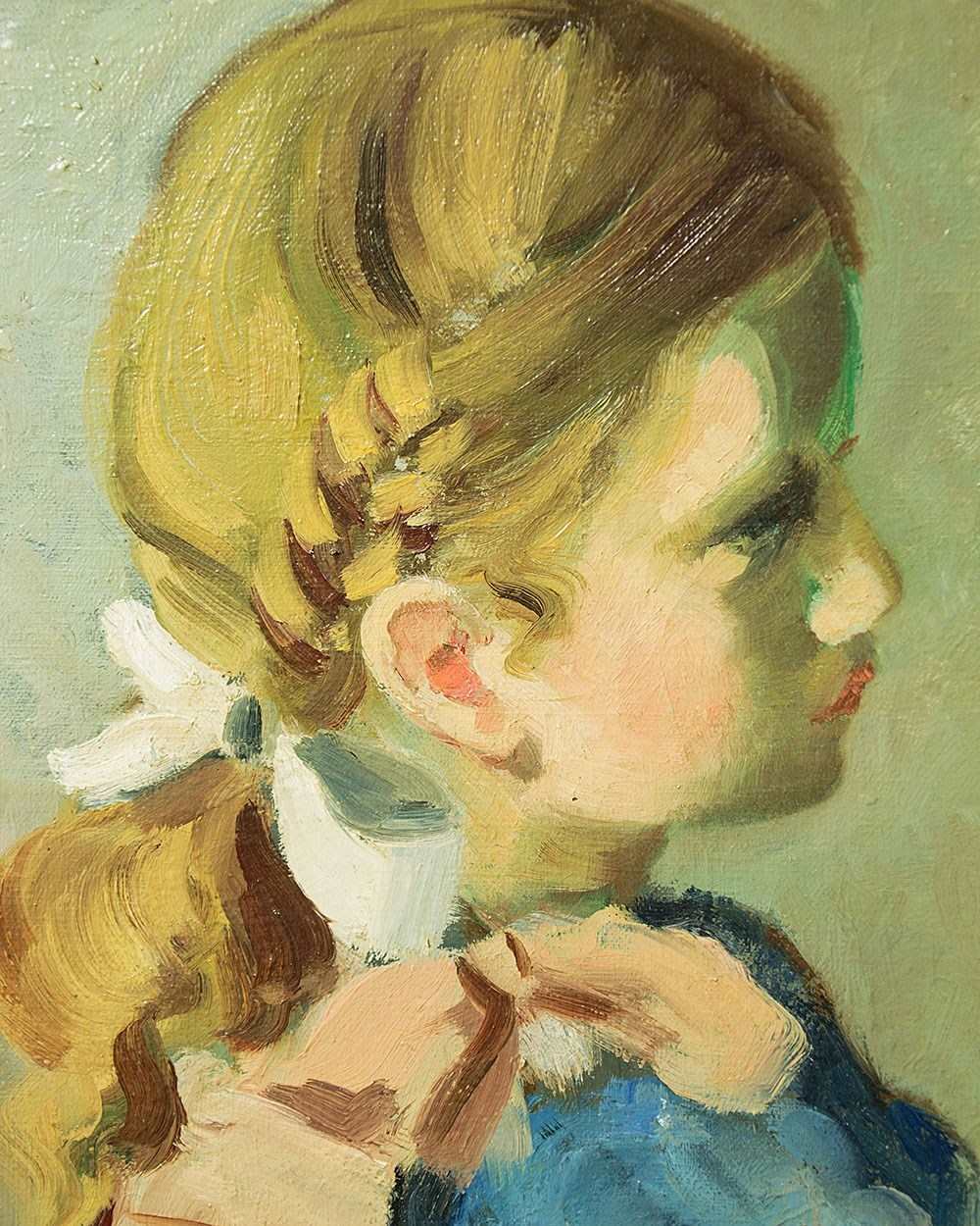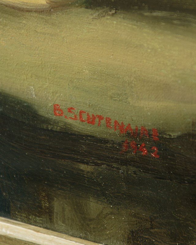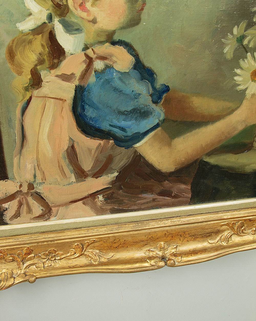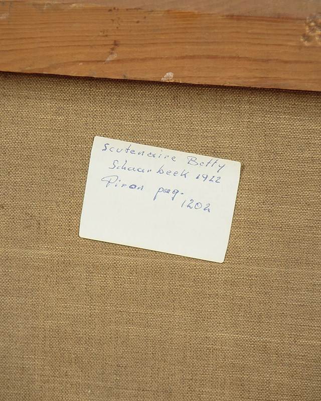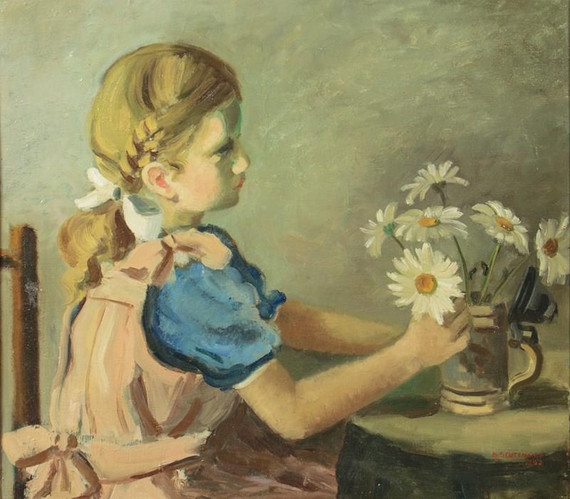 Oil painting of a young girl by the Belgian artist Betty Scutenaire dated 1942. A young girl with plaited hair tied with a bow and bows also at the shoulders and waist of her pink pinafore dress. Shown half length and seated at a table arranging flowers in a lidded stein. Very confidently painted in an impressionistic style in oil on canvas. Clearly signed and dated in the lower right hand corner. Very good condition. Presented as found in an attractive gilded and moulded wooden frame.