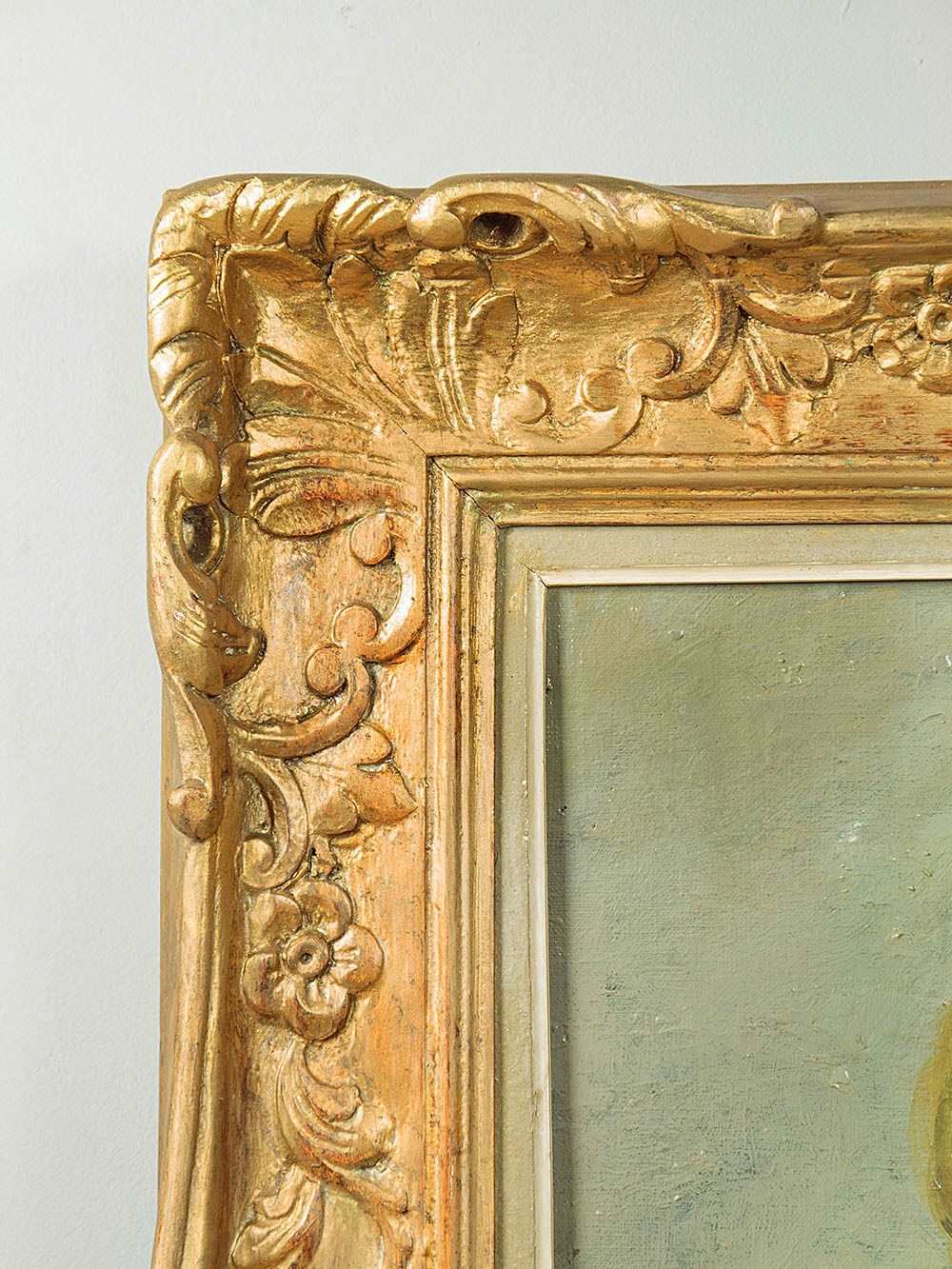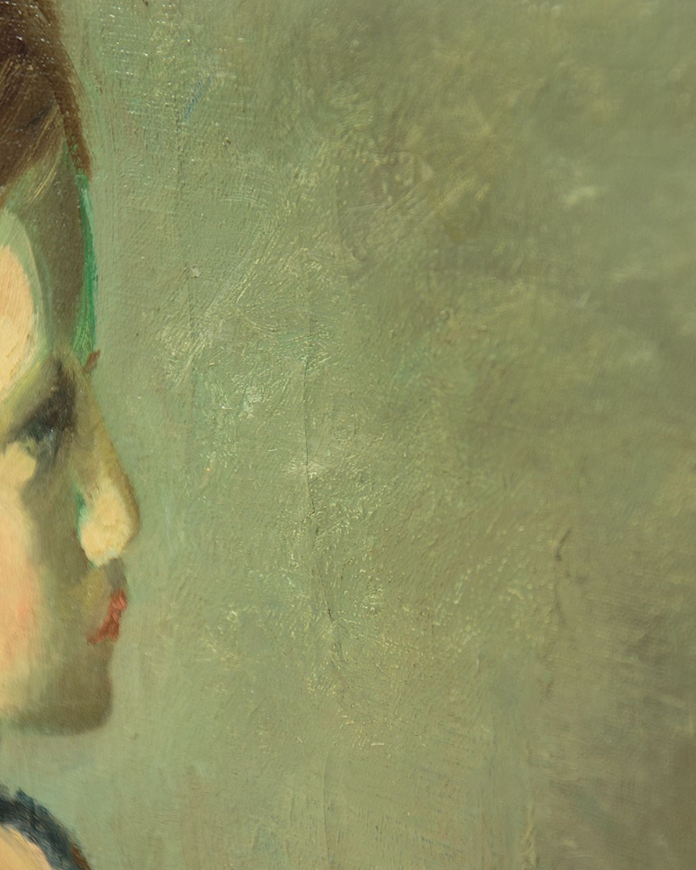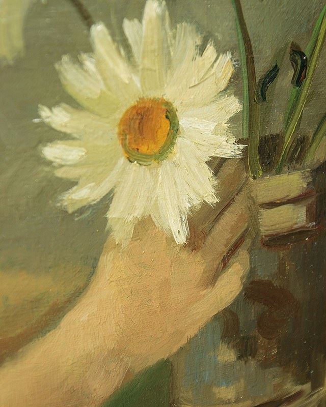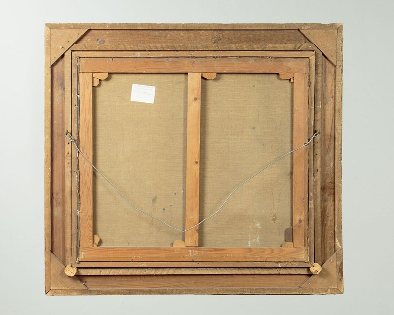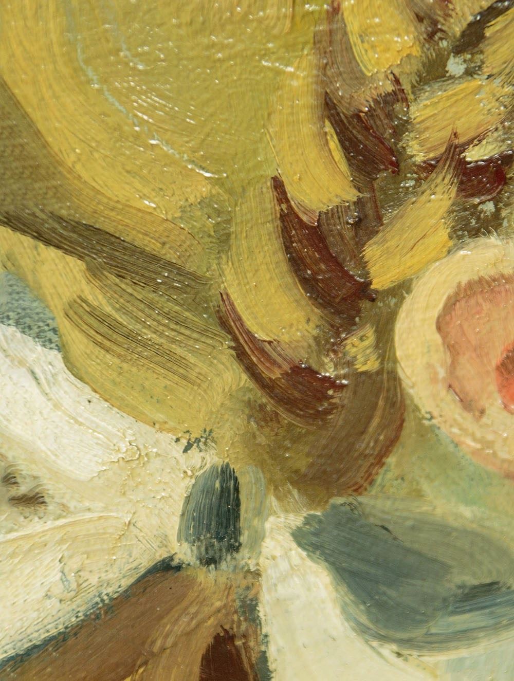Oil painting of a young girl by the Belgian artist Betty Scutenaire dated 1942. A young girl with plaited hair tied with a bow and bows also at the shoulders and waist of her pink pinafore dress. Shown half length and seated at a table arranging flowers in a lidded stein. Very confidently painted in an impressionistic style in oil on canvas. Clearly signed and dated in the lower right hand corner. Very good condition. Presented as found in an attractive gilded and moulded wooden frame.