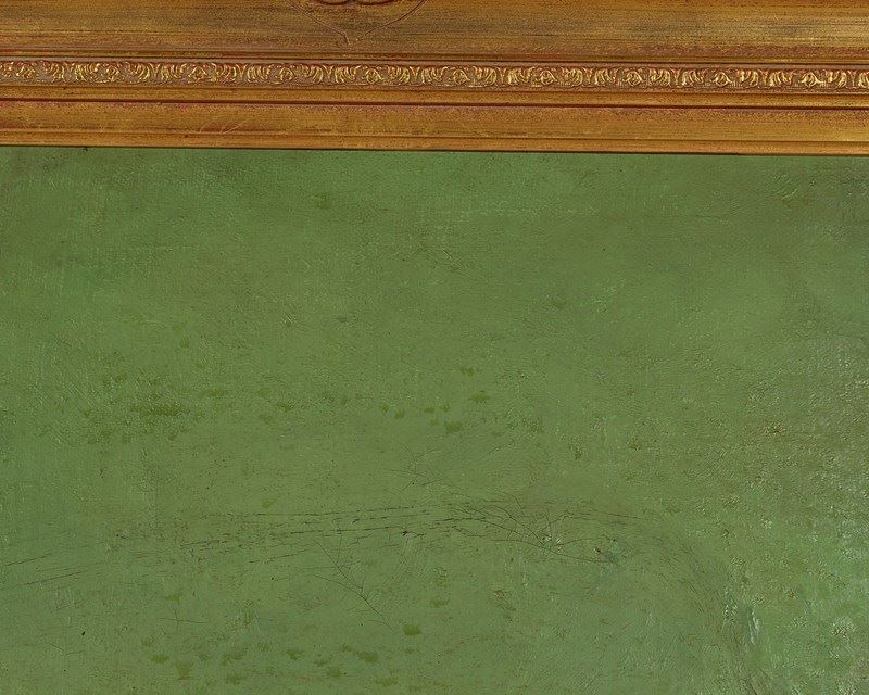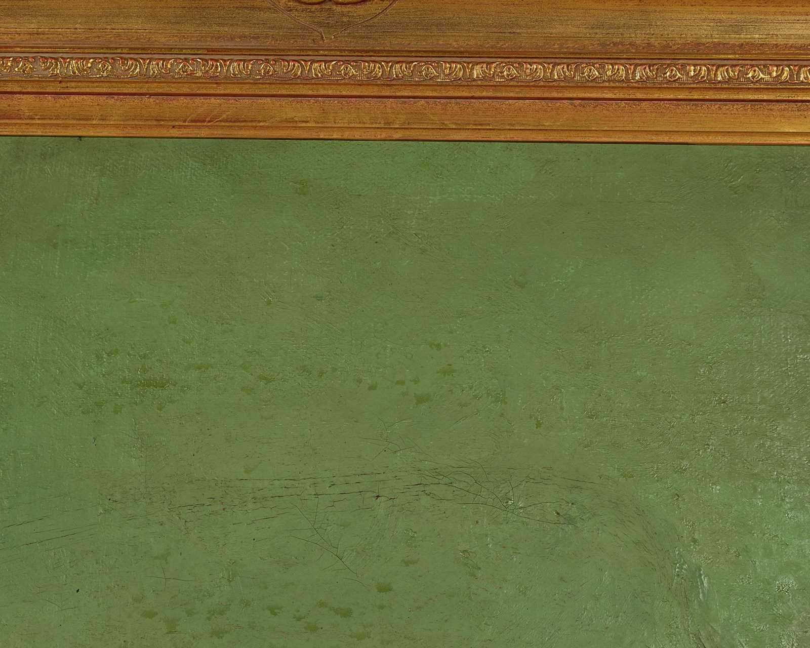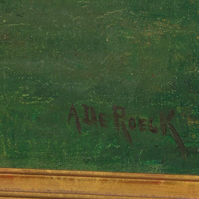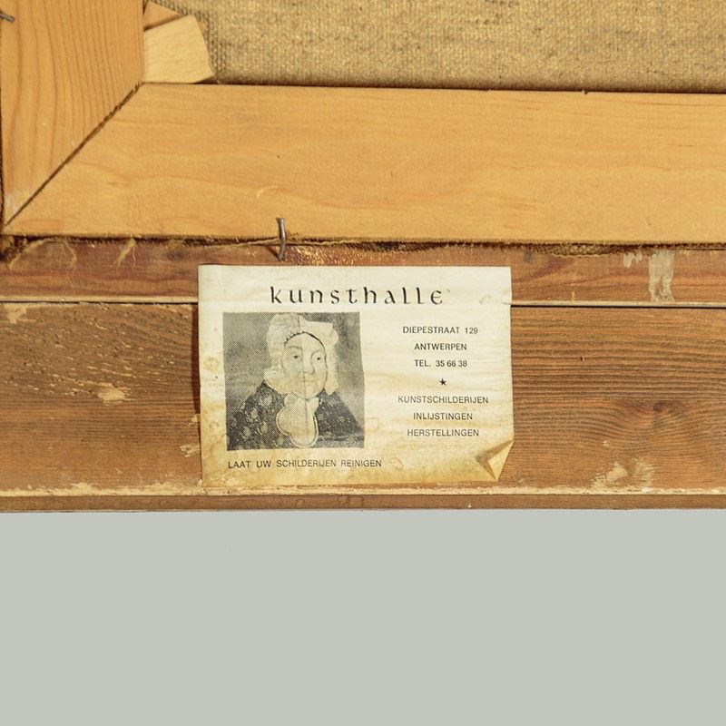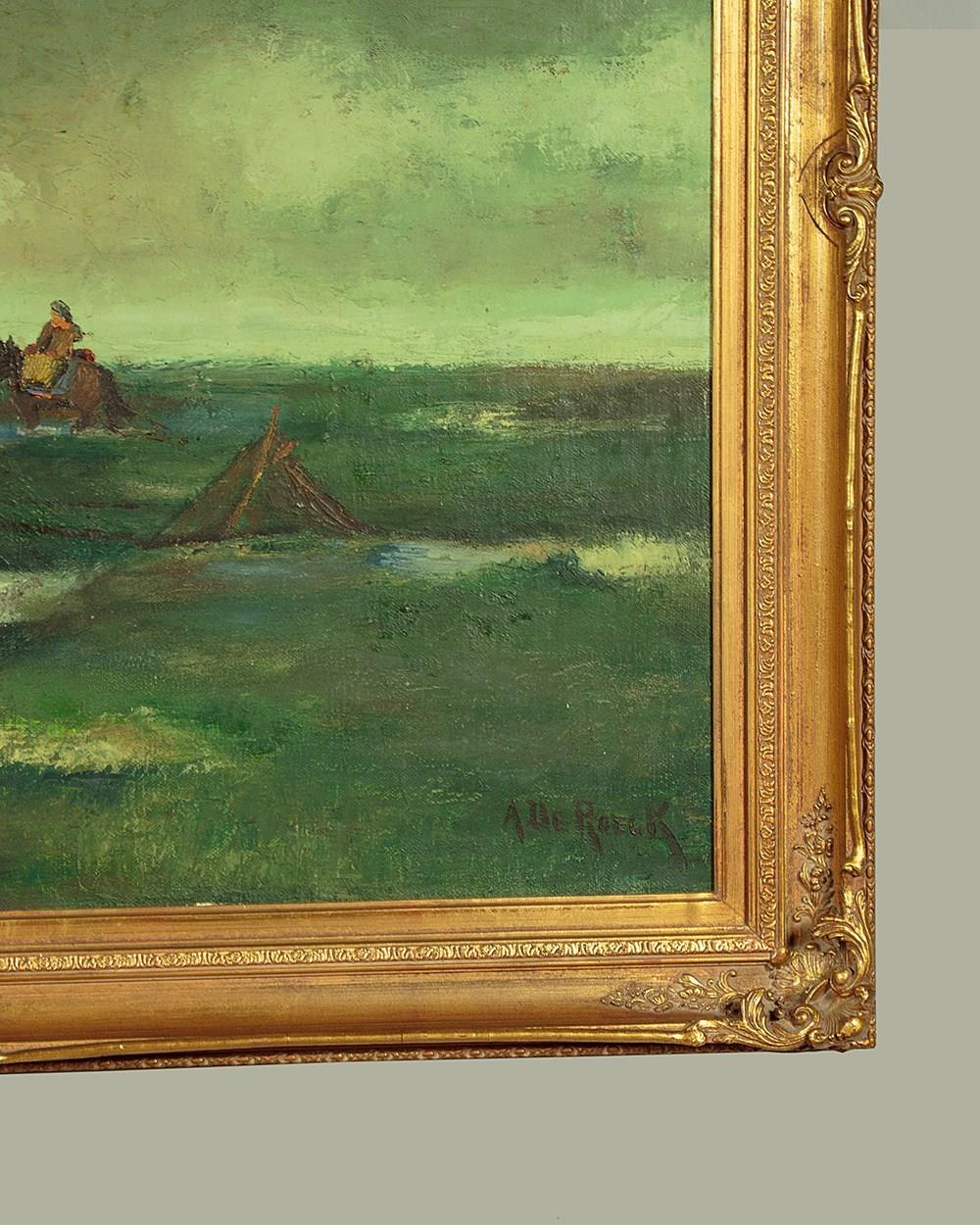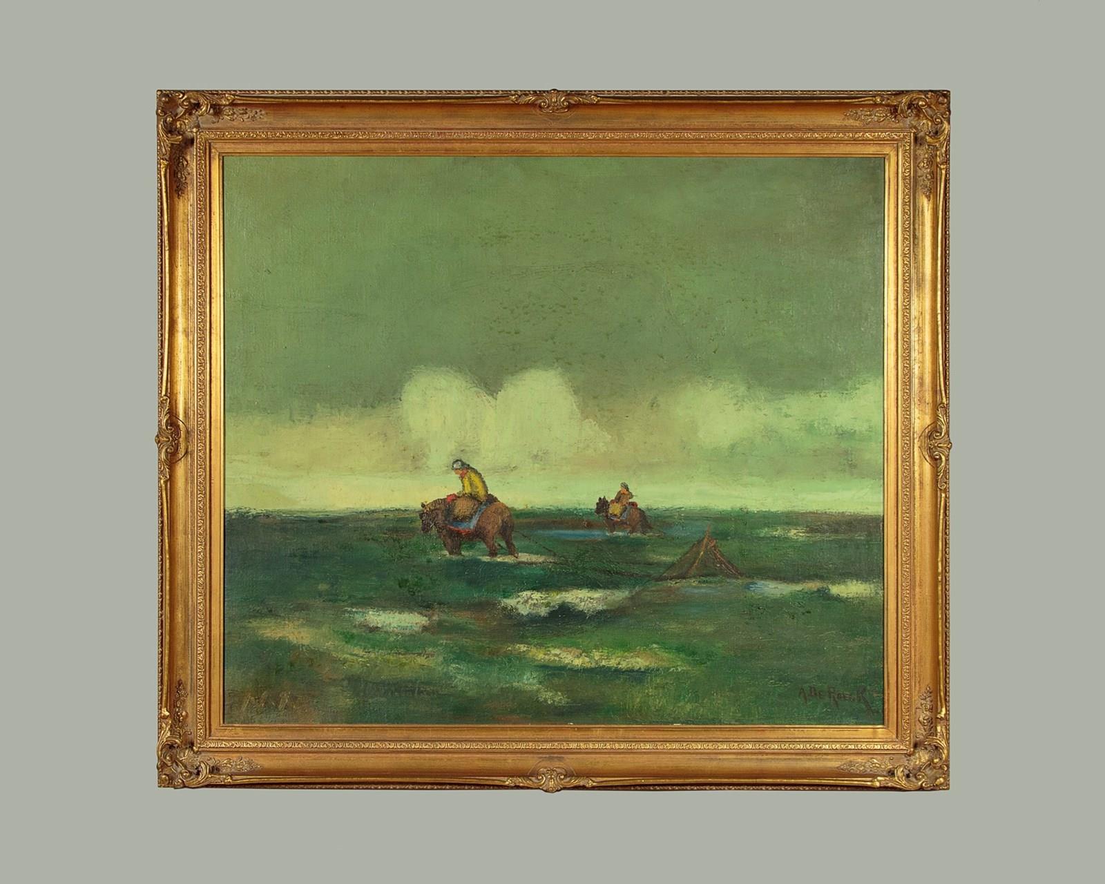 Good sized oil on canvas painting of traditional shrimp fishing on horseback by the Belgian artist Alfonse de Roeck (1896-1982) c.1970. Two fishermen dressed in yellow oilskins with wicker baskets at their sides use their sturdy horses to drag triangular shrimp nets through the water just before low tide. Painted in a loose impressionistic style in thick oils. With a large signature in the lower right hand corner. Presented in the original carved and gilded wooden frame with an Antwerp Kunsthalle gallery label on the rear. Very good condition.