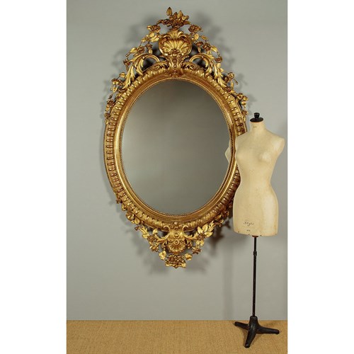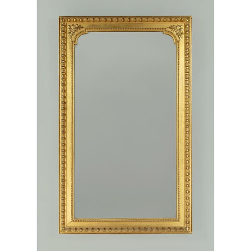 Unusual painted and gilded overmantle mirror c.1920. 38" x 28½" mirror plate within a broad painted pine frame. Large Regency style carved and gilded egg and dart moulding to the inner edge and a second border of athemion pattern moulding at the top and sides. Some obvious old wear and the gilding is rubbed through in places to reveal the red ground below. Otherwise very good condition, fitted with a new mirror pate, cleaned and waxed in our workshops.