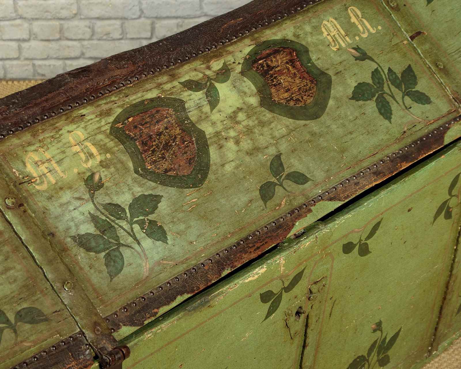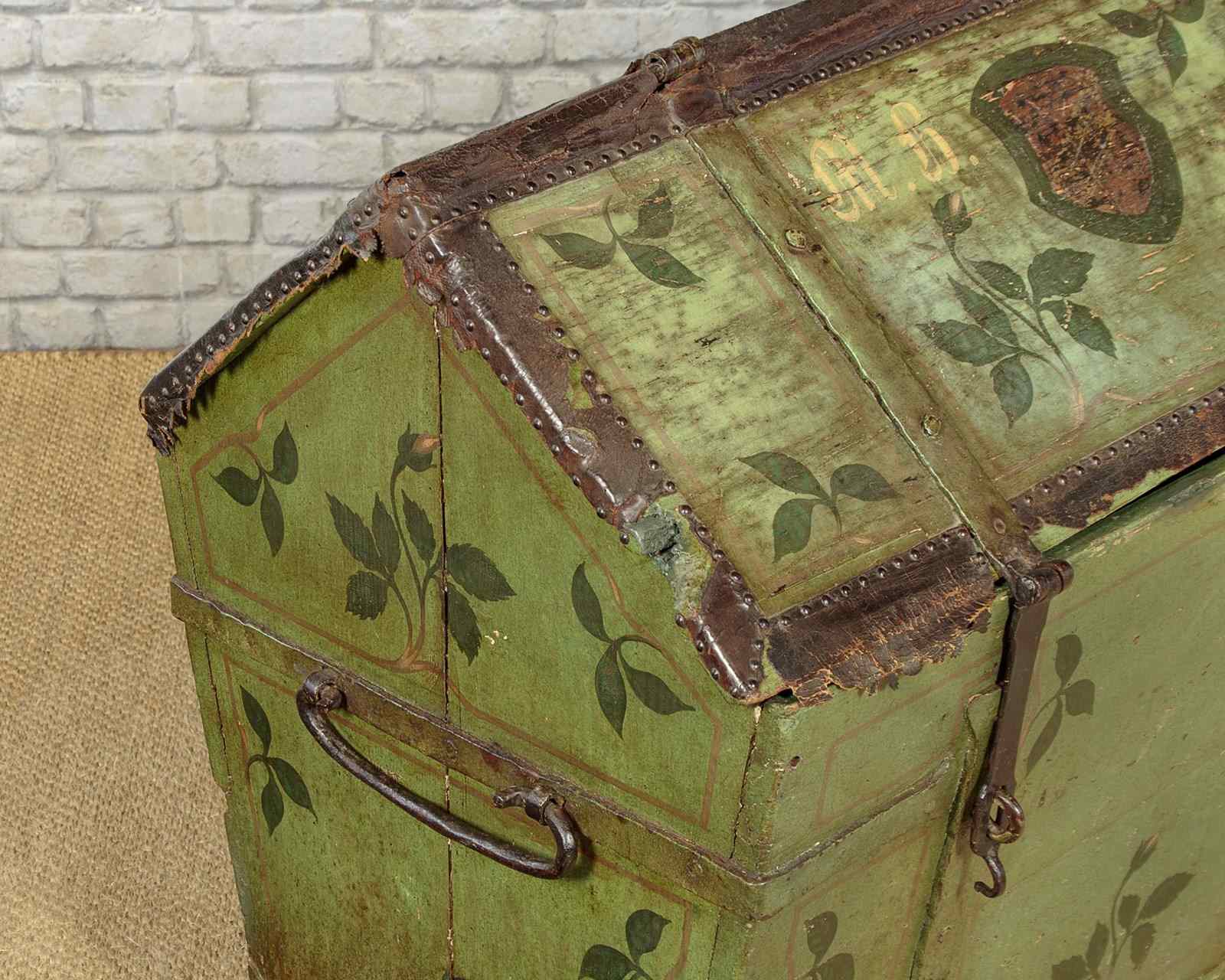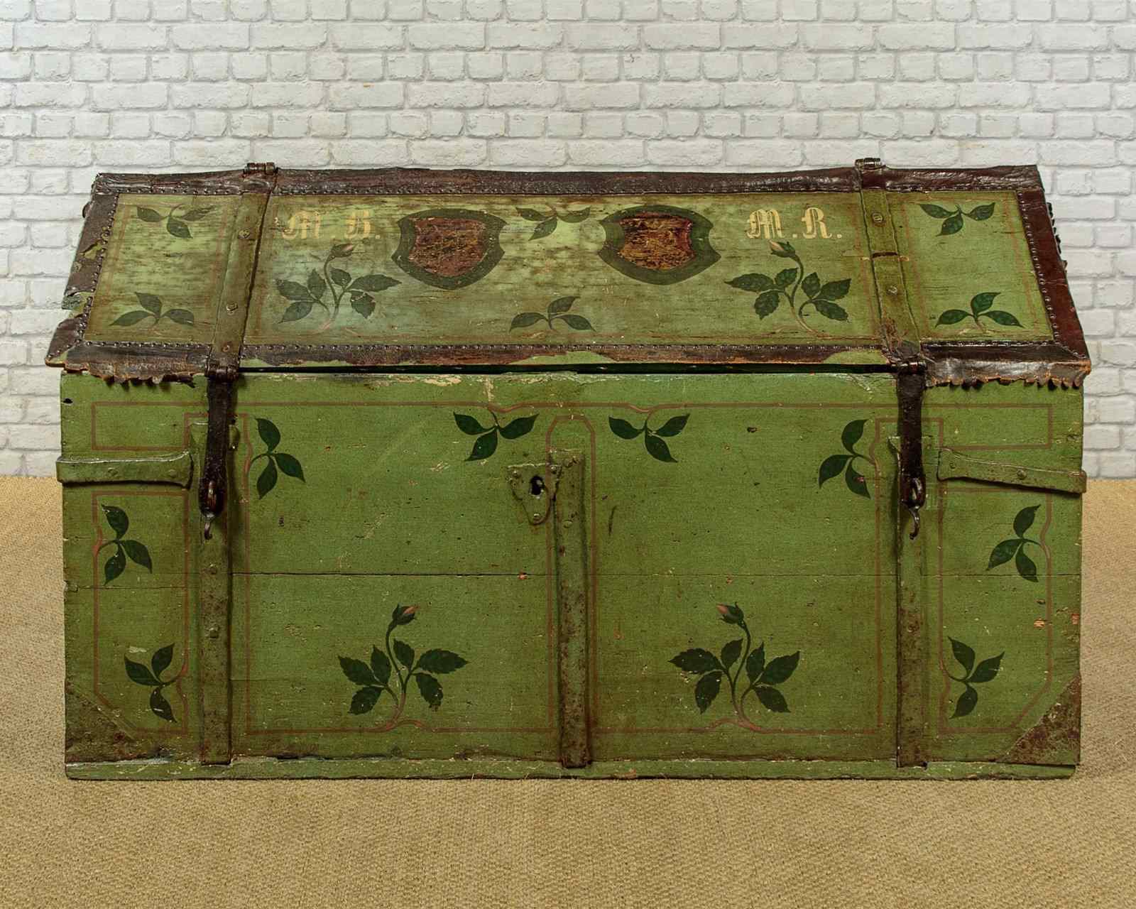 Rare painted pine marriage chest or coffer from Southern Germany c.1860. Of unusual form with a steep sloping top (intended as as a saddle stand perhaps) and tapering sides. Simply constructed from pine boards with heavy external iron bindings, hinges, hasps and carry handles. Lovely medieval revivalist paintwork featuring two sets of initials and two heraldic crests (heavily worn), and with flower buds and leaves sprouting from the decorative painted borders on the front, sides and lid. With an applied leather trim to the lid with scalloped edge and metal studwork. Some obvious wear and repair to the leather and minor damage to the timber on left hand edge of the lid. Otherwise very good condition, cleaned and waxed in our workshops.