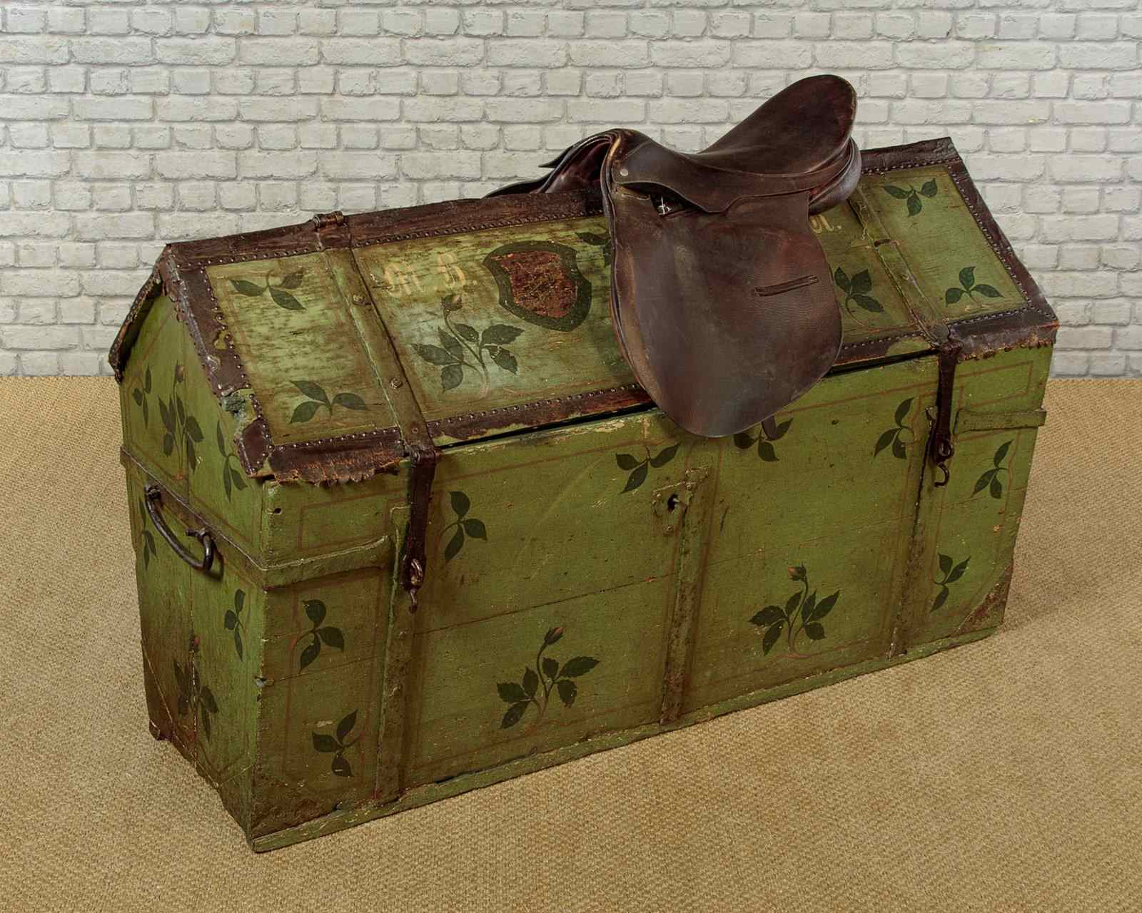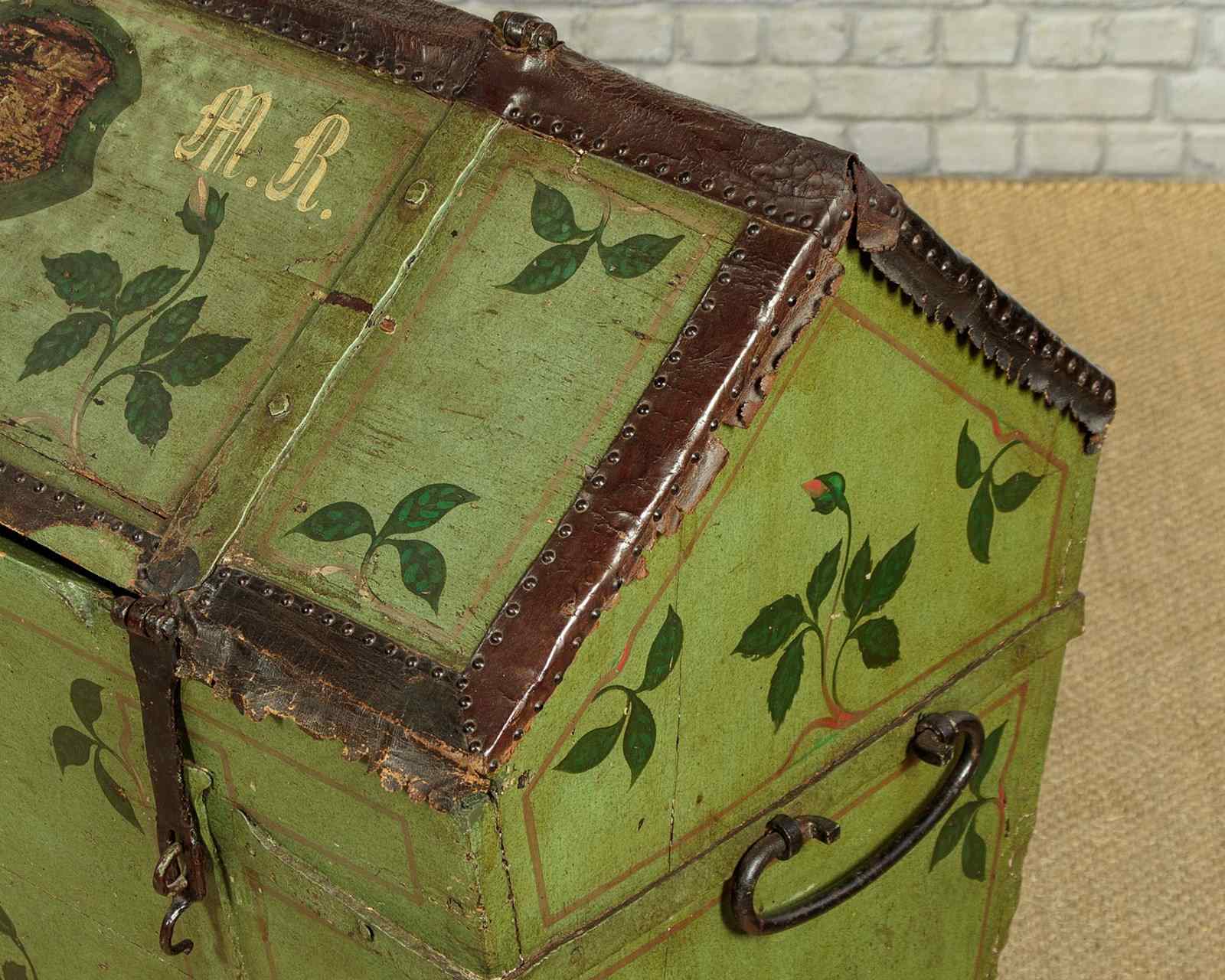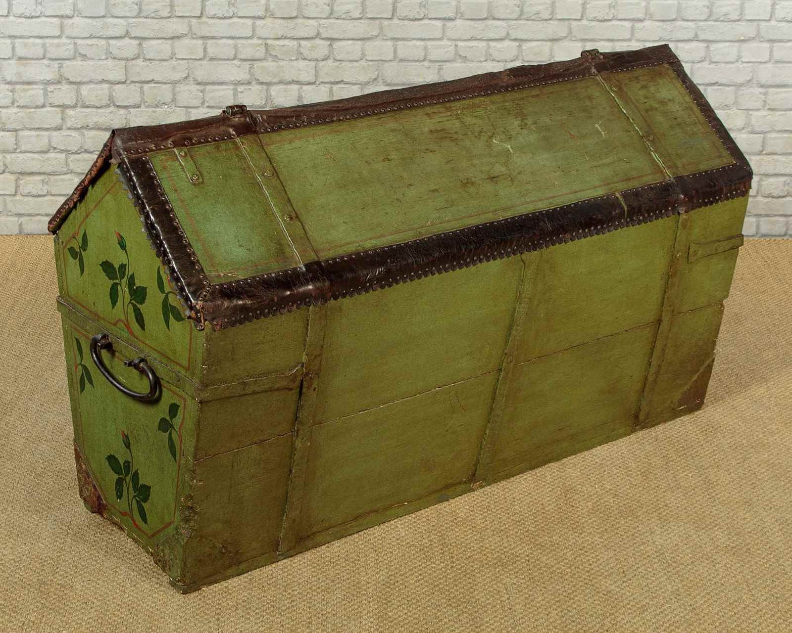 Rare painted pine marriage chest or coffer from Southern Germany c.1860. Of unusual form with a steep sloping top (intended as as a saddle stand perhaps) and tapering sides. Simply constructed from pine boards with heavy external iron bindings, hinges, hasps and carry handles. Lovely medieval revivalist paintwork featuring two sets of initials and two heraldic crests (heavily worn), and with flower buds and leaves sprouting from the decorative painted borders on the front, sides and lid. With an applied leather trim to the lid with scalloped edge and metal studwork. Some obvious wear and repair to the leather and minor damage to the timber on left hand edge of the lid. Otherwise very good condition, cleaned and waxed in our workshops.