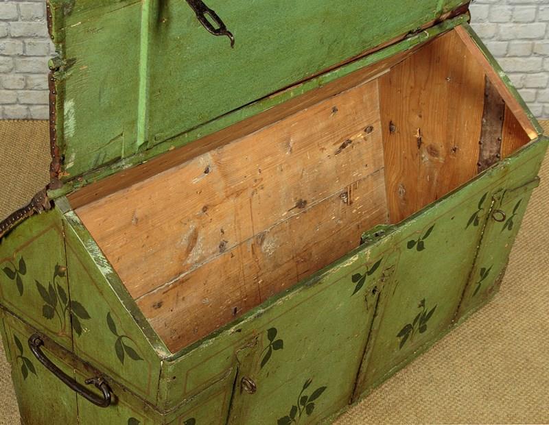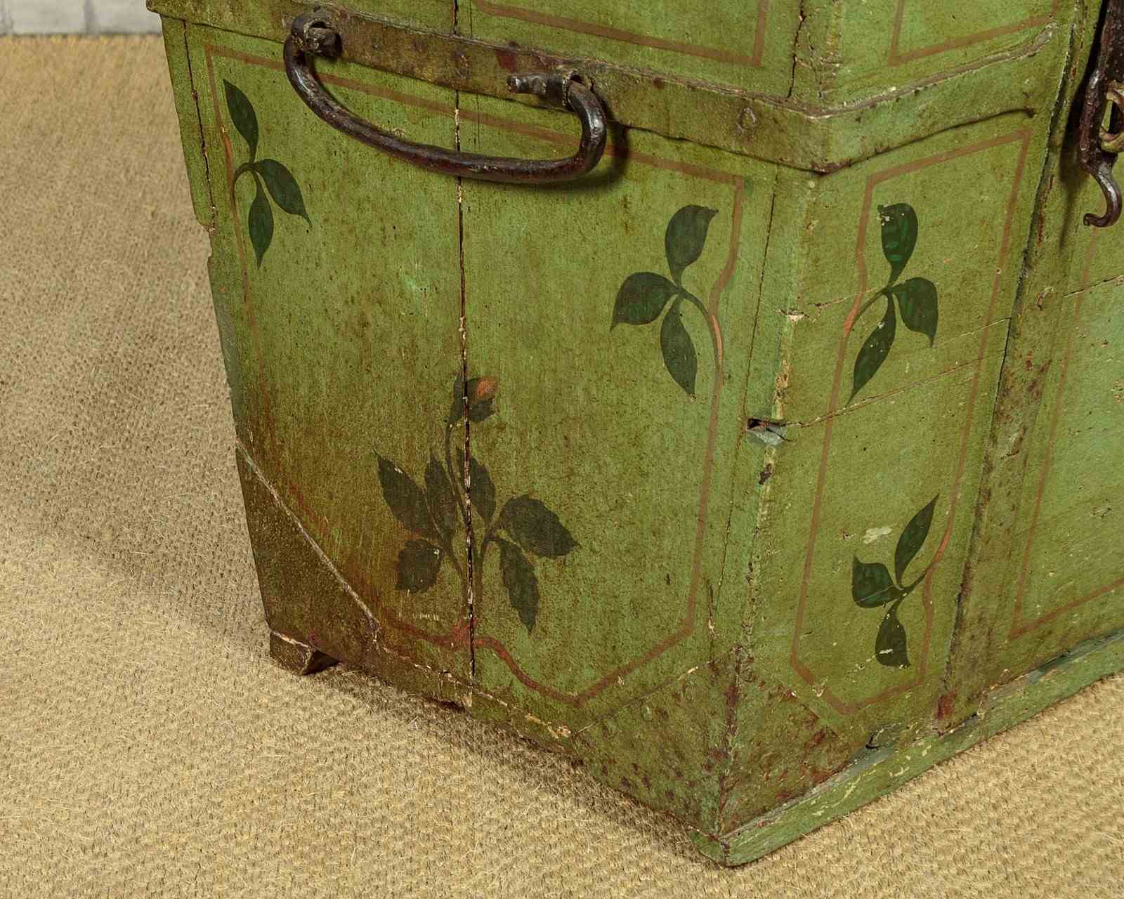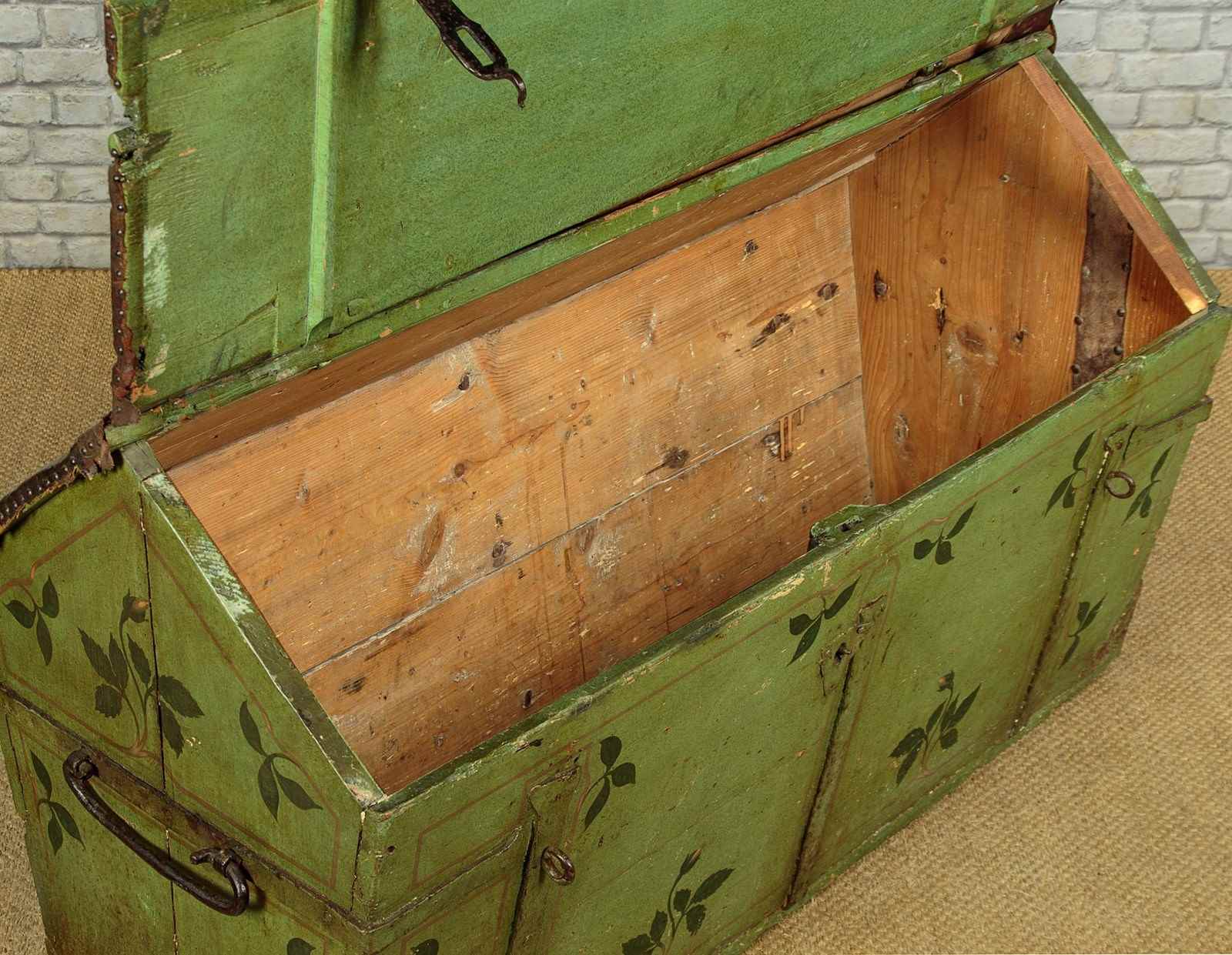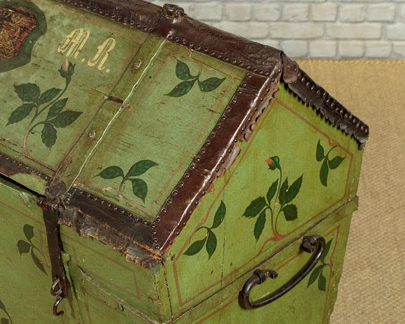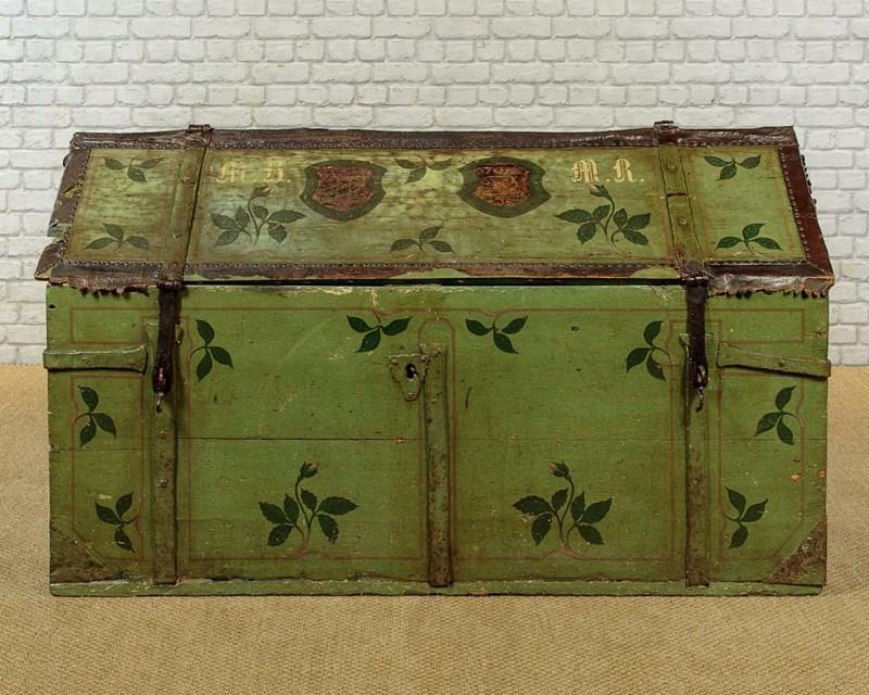 Note there is an unpainted oak box of very similar style listed in the collection of the Nuremberg National Museum and catalogued as being 15th.c. It is possible this is in fact a much earlier box with 19th.c. paintwork.