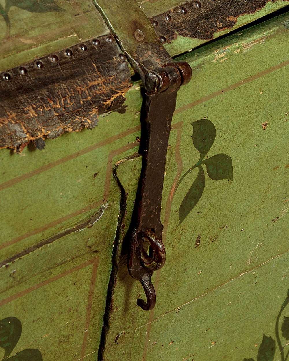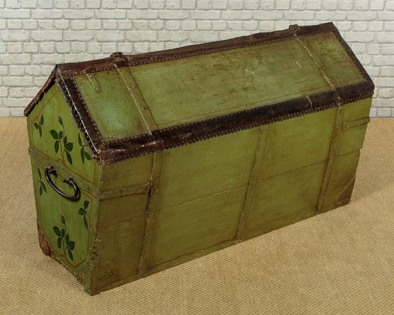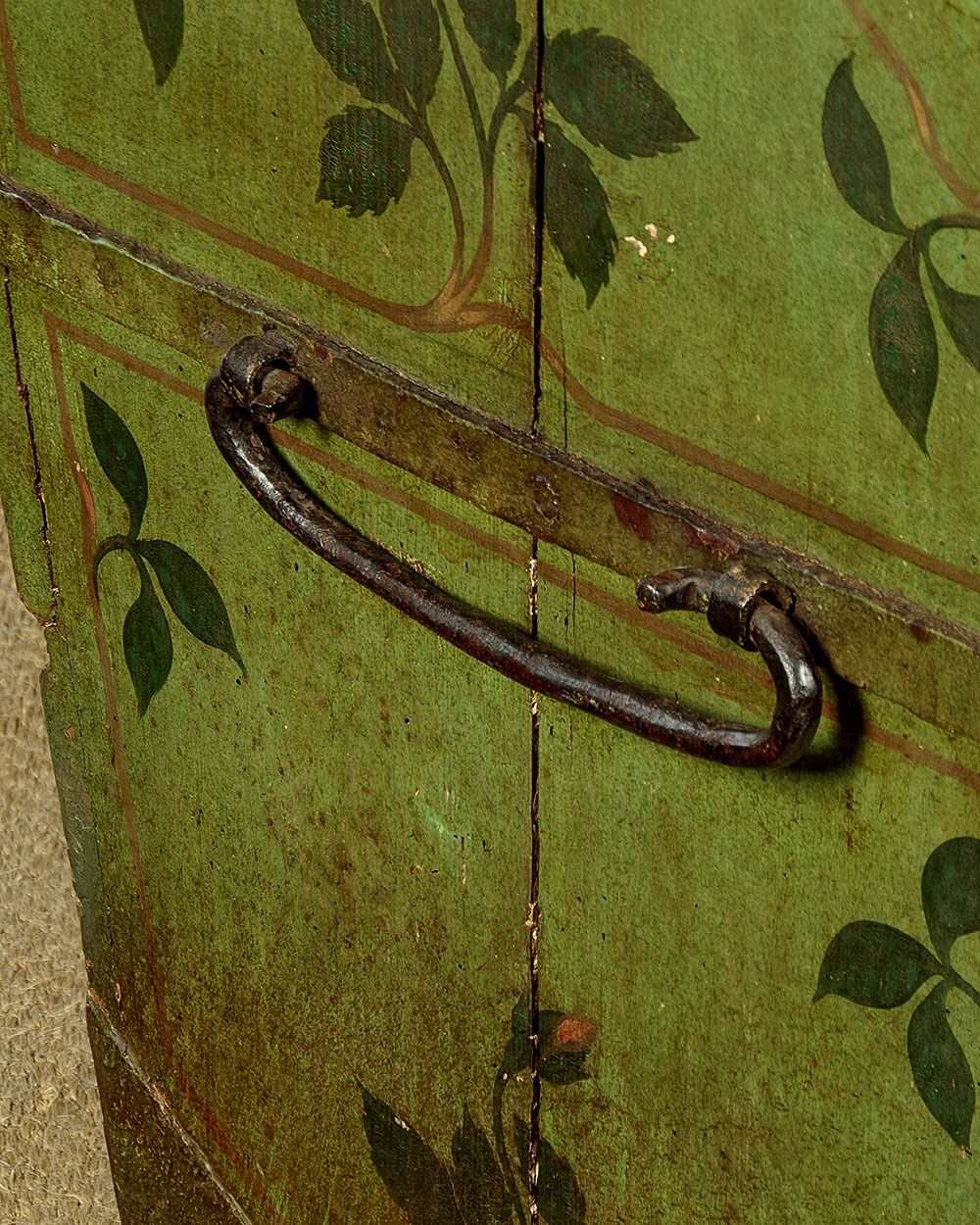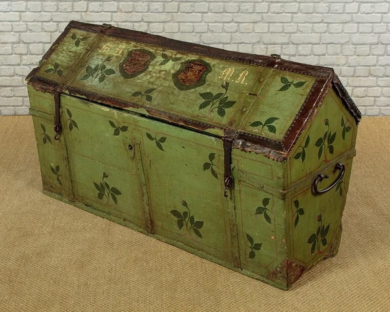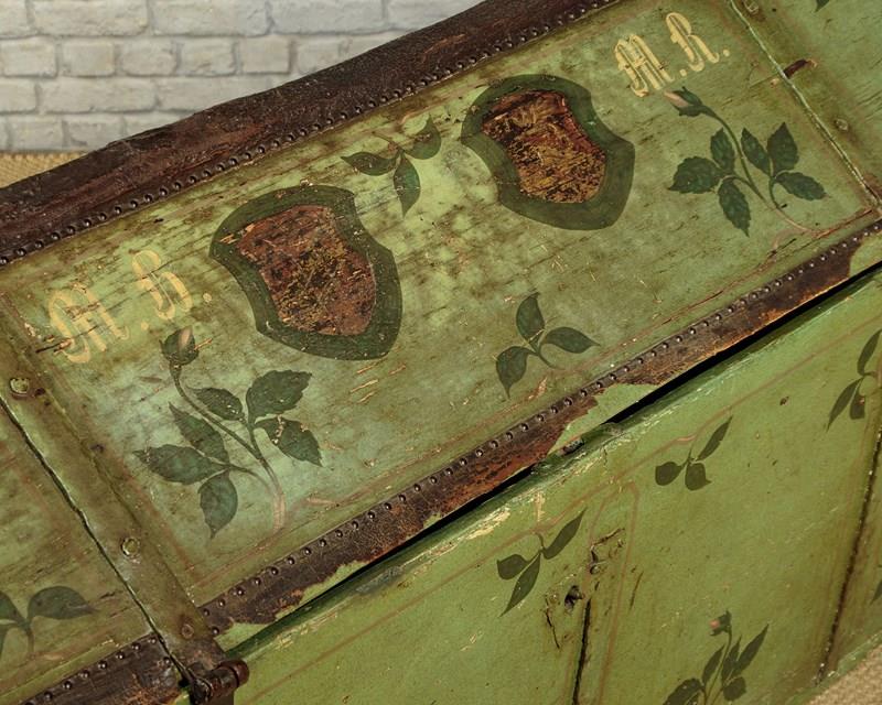 Note there is an unpainted oak box of very similar style listed in the collection of the Nuremberg National Museum and catalogued as being 15th.c. It is possible this is in fact a much earlier box with 19th.c. paintwork.