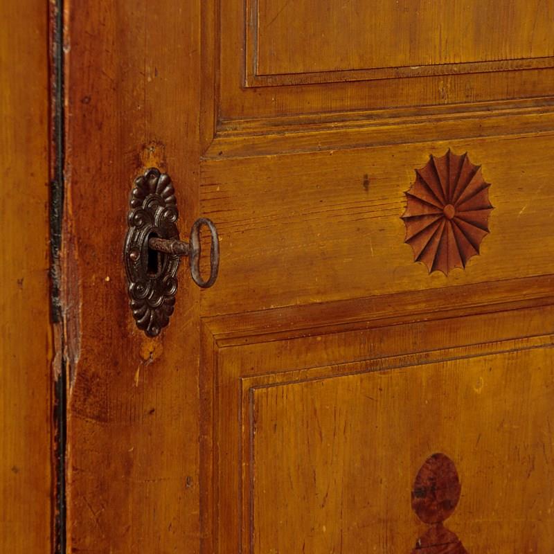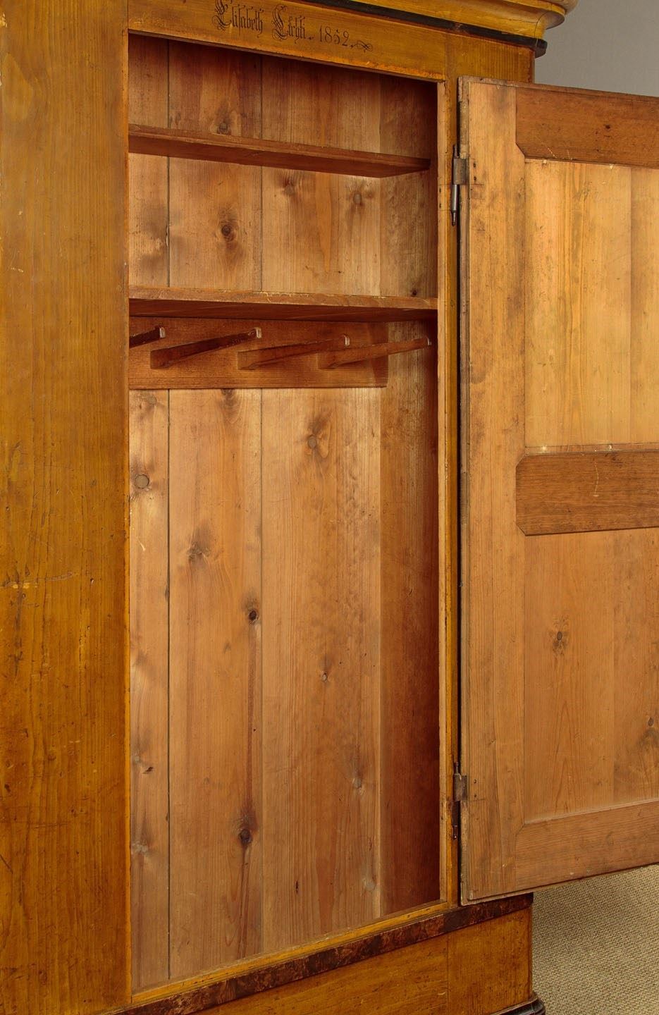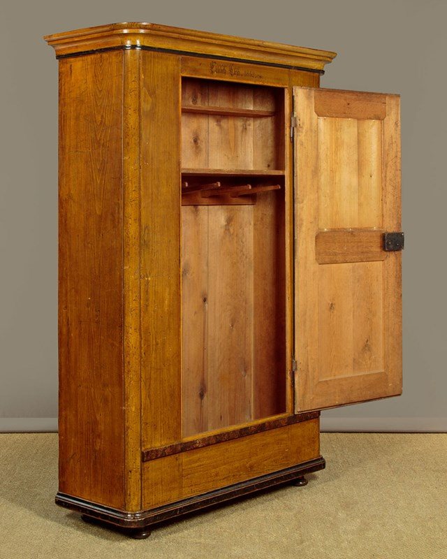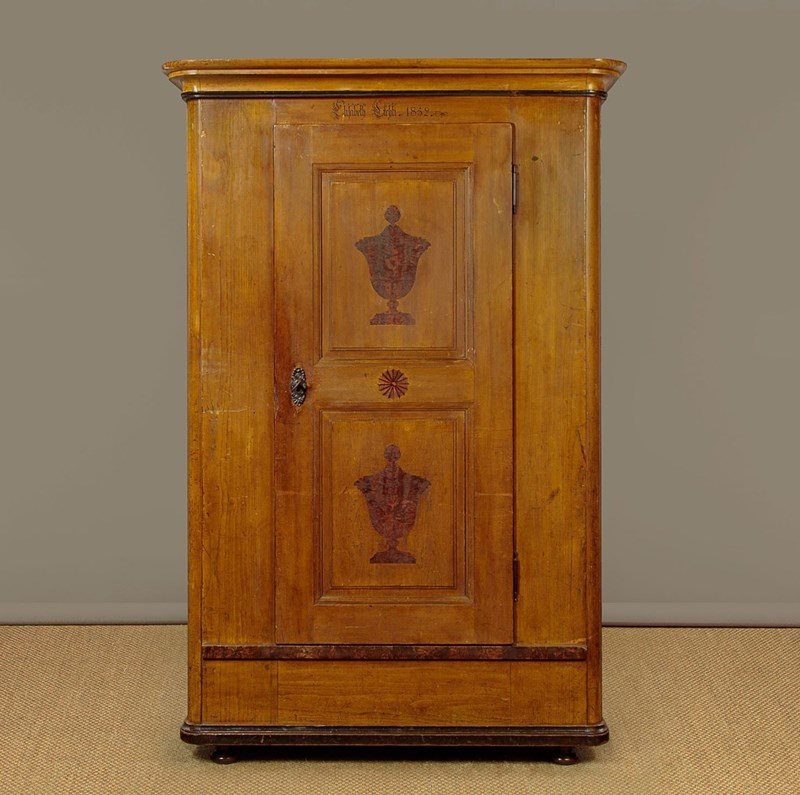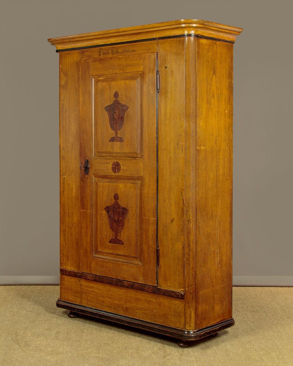 Beautiful pine wardrobe or cloak cupboard, likely from Southern Germany or Austria, with original painted decoration dated 1852. Single door wardrobe fitted inside with five large wooden peg hooks, a single shelf of full depth (16") plus a little 6" deep shelf above. Moulded cornice over the name Elizabeth Lirhti and the date 1852 painted in beautiful gothic script over the door. The door featuring raised and moulded panels inlaid with Classical urns in flame mahogany. Plus an inlaid marquetry work fan roundel to the centre. Retaining the original lock, escutcheon and key. Burr walnut trim below the door and a painted moulding around the base. Raised on the original turned bun feet. Excellent condition, cleaned and waxed in our workshops.
