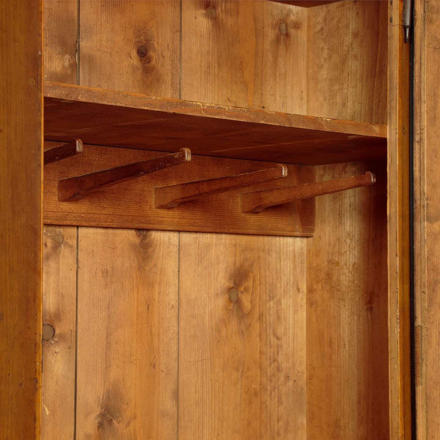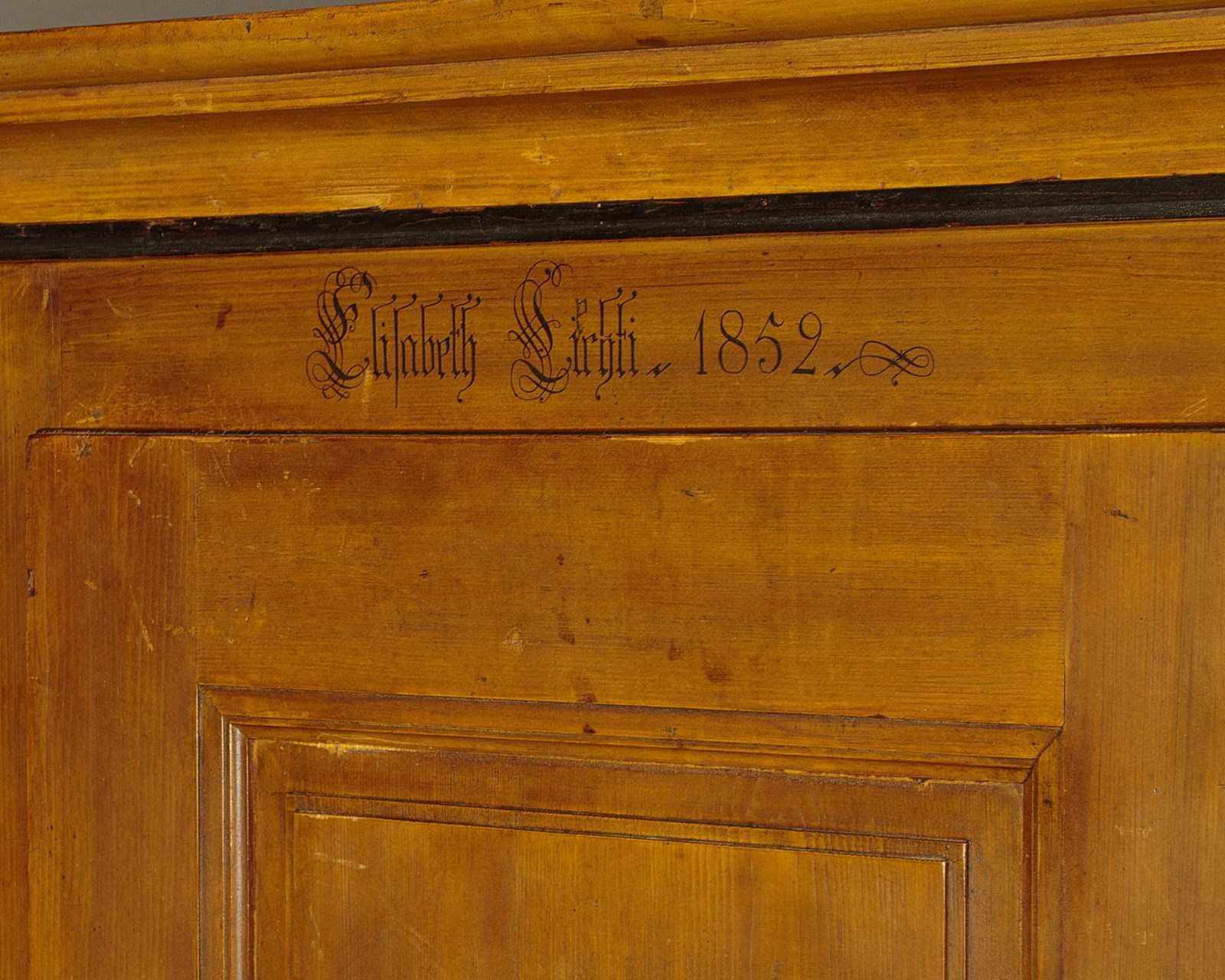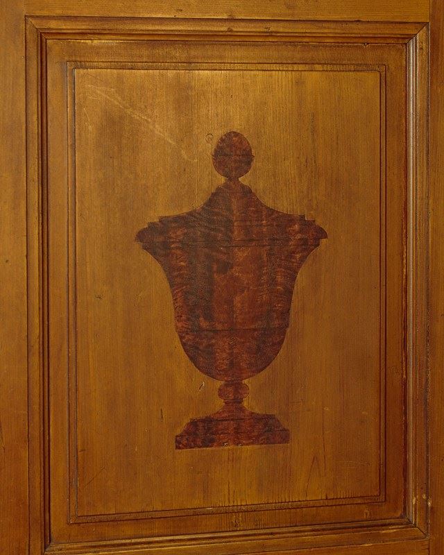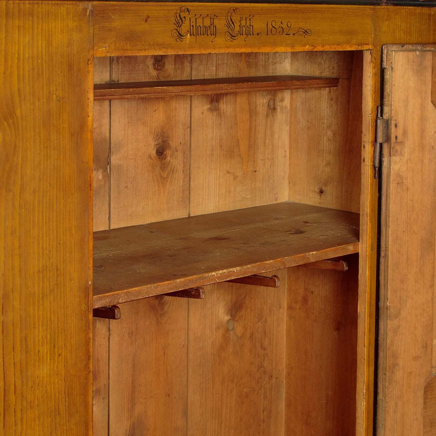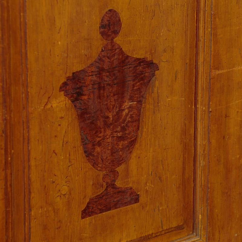 Beautiful pine wardrobe or cloak cupboard, likely from Southern Germany or Austria, with original painted decoration dated 1852. Single door wardrobe fitted inside with five large wooden peg hooks, a single shelf of full depth (16") plus a little 6" deep shelf above. Moulded cornice over the name Elizabeth Lirhti and the date 1852 painted in beautiful gothic script over the door. The door featuring raised and moulded panels inlaid with Classical urns in flame mahogany. Plus an inlaid marquetry work fan roundel to the centre. Retaining the original lock, escutcheon and key. Burr walnut trim below the door and a painted moulding around the base. Raised on the original turned bun feet. Excellent condition, cleaned and waxed in our workshops.